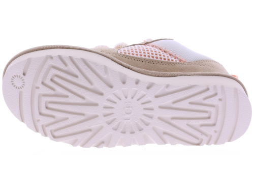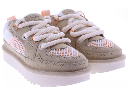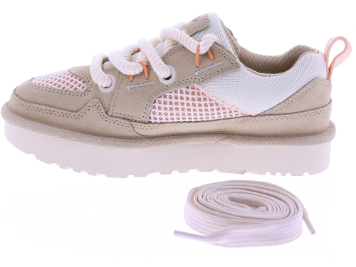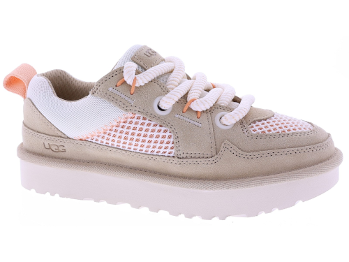 Zandkleurig suède dames sneakers van UGG, model Lowmel Mesh 1175300. Deze sportieve sneaker combineert zacht suède met ademende mesh panelen voor een lichte en comfortabele uitstraling. De grove veters en de robuuste, lichtgewicht zool geven het model een eigentijdse look, terwijl de zachte binnenzijde zorgt voor prettig draagcomfort gedurende de dag. Perfect te combineren met een casual outfit of zomerse jeans. Kijk ook eens bij onze andere UGG damesschoenen bij Klijsen.