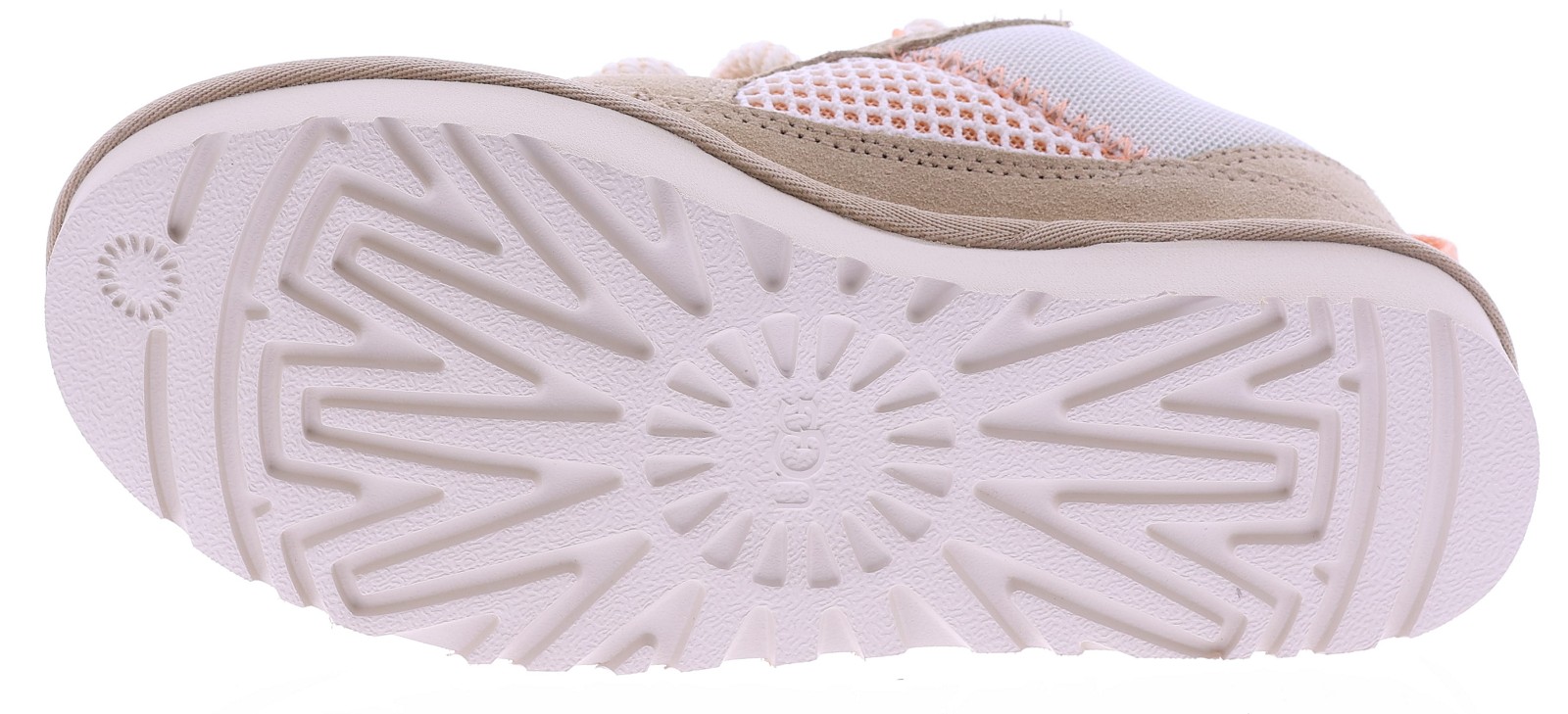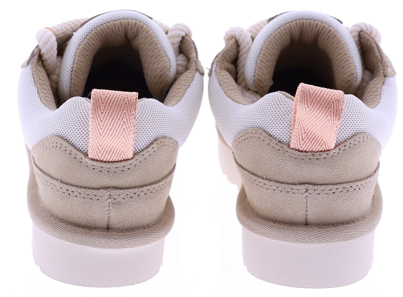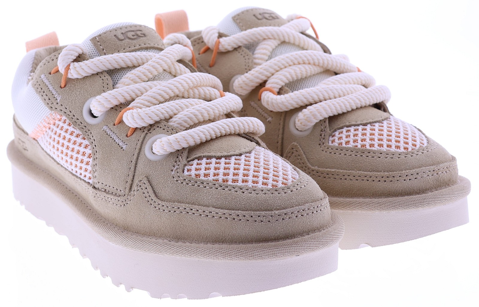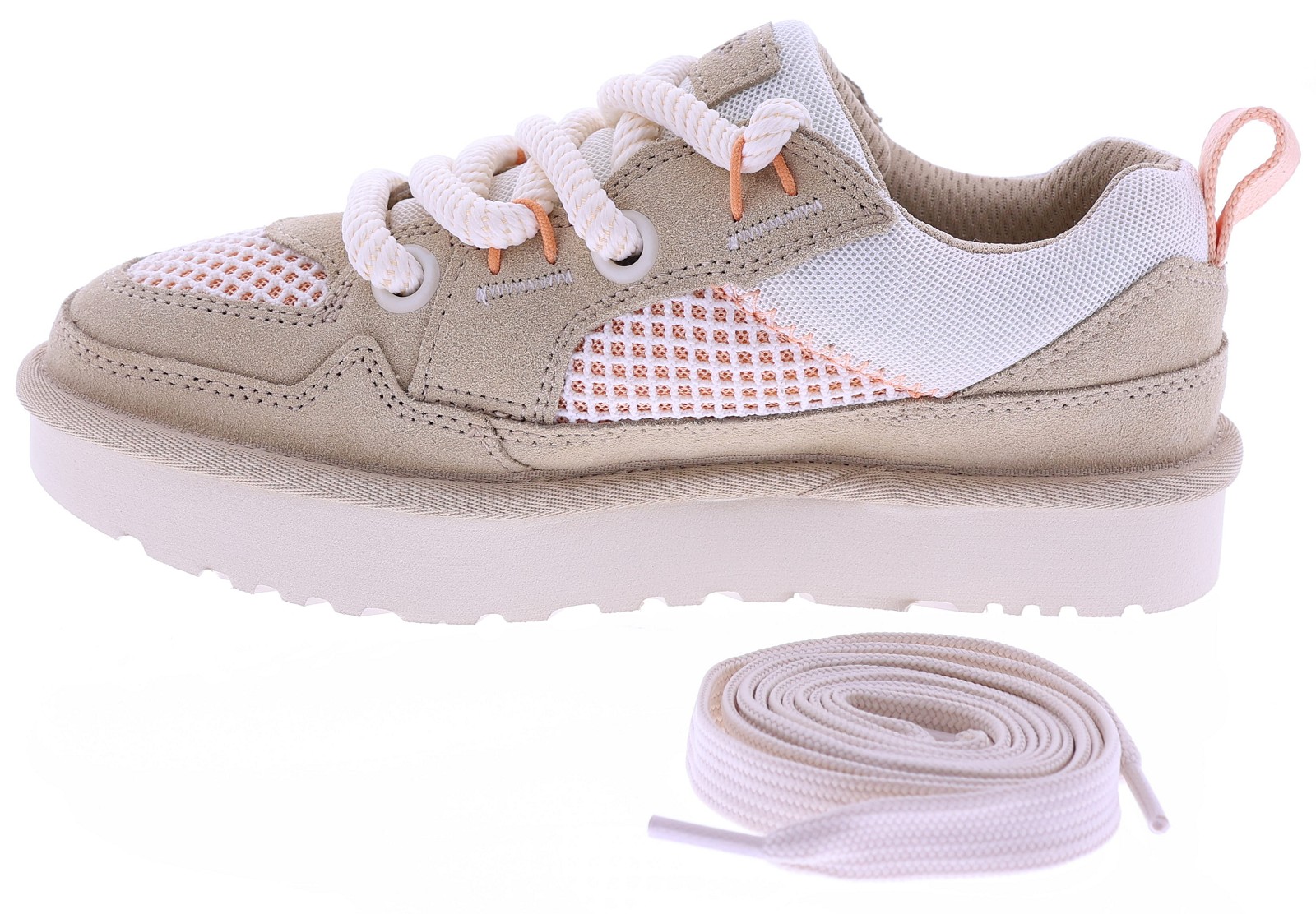 Zandkleurig suède dames sneakers van UGG, model Lowmel Mesh 1175300. Deze sportieve sneaker combineert zacht suède met ademende mesh panelen voor een lichte en comfortabele uitstraling. De grove veters en de robuuste, lichtgewicht zool geven het model een eigentijdse look, terwijl de zachte binnenzijde zorgt voor prettig draagcomfort gedurende de dag. Perfect te combineren met een casual outfit of zomerse jeans. Kijk ook eens bij onze andere UGG damesschoenen bij Klijsen.