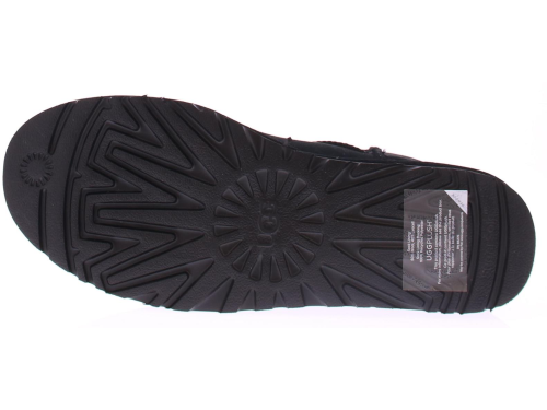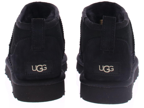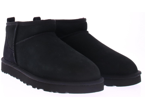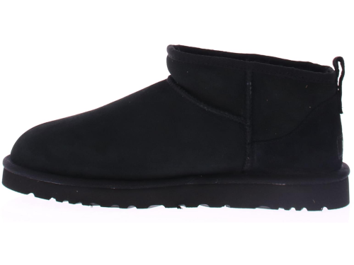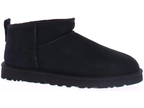 Zwart suede heren enkellaars van Ugg. Dit model is de klassieke "Classic Ultra Mini Classic Black". Deze schoen komt op een rubberen zool in dezelfde kleur als de schoen zelf en heeft een treklus voor een gemakkelijke instap.