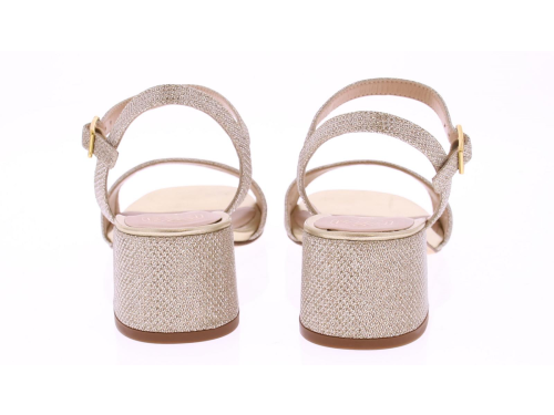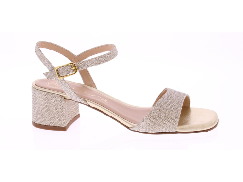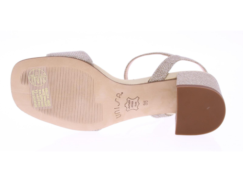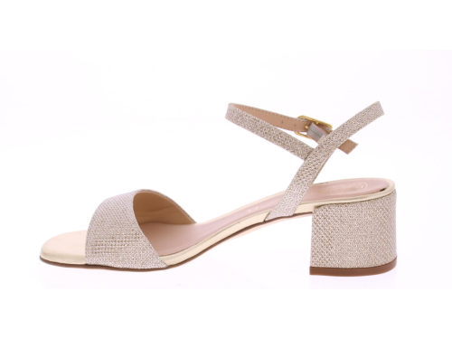 Goud/platina glitterstof dames sandaal van Unisa. Deze sandaal heeft een rechte band over de teen en rondom de enkel en wreef loopt een subtiel bandje welke te stellen is met een goudkleurige gesp. De hak heeft een comfortable hoogte van 5 cm. Bij deze schoen is een bijpassende clutch verkrijbaar.