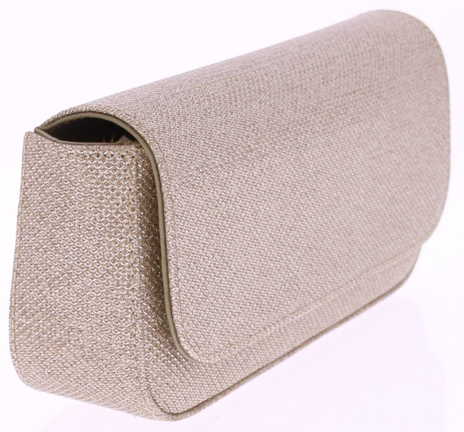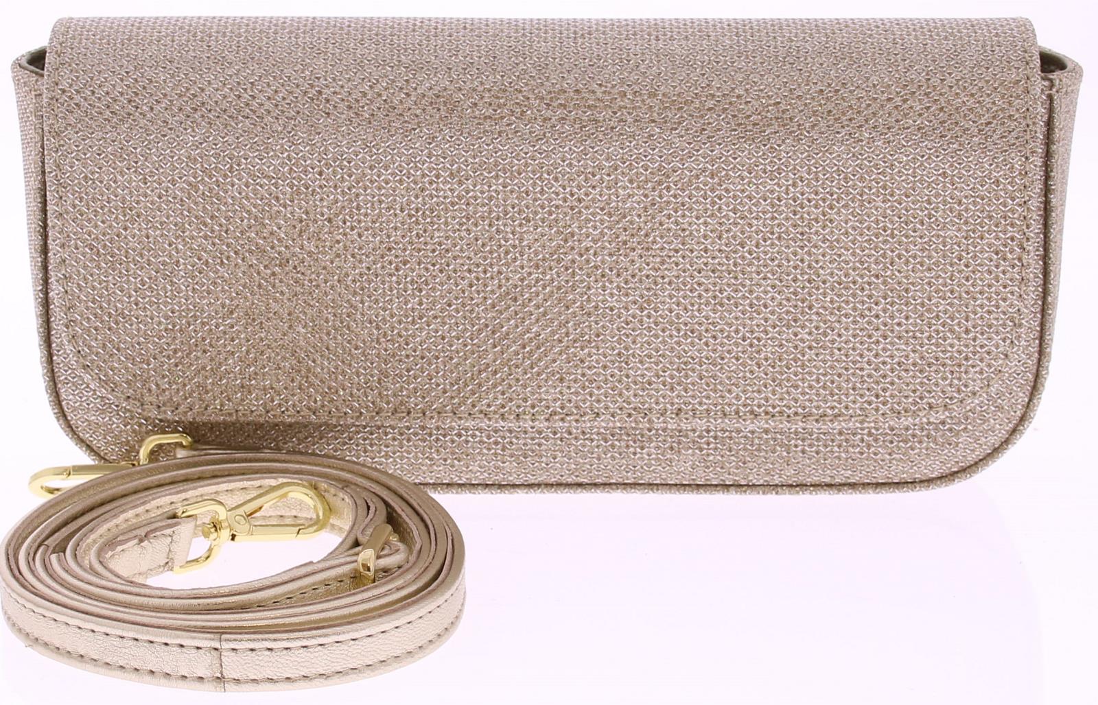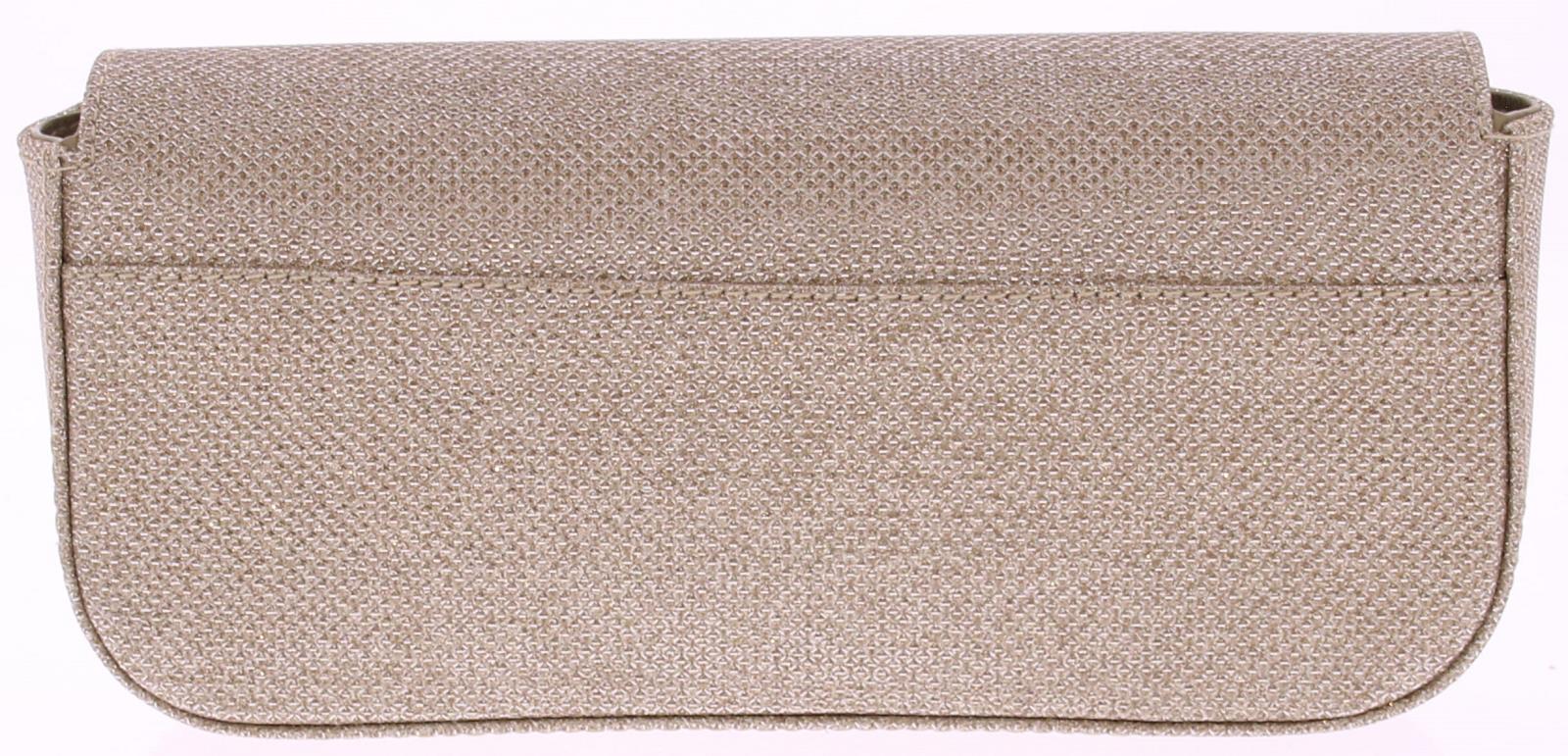 Platina glitterstof dames clutch van Unisa. Deze stijlvolle clutch heeft mooie afgeronde hoeken. De tas heeft ook een lange verstelbare schouderband. En passend bij diverse modellen uit onze collectie. Deze tas is 22 cm breed, 10 cm hoog en 4.5 cm diep.