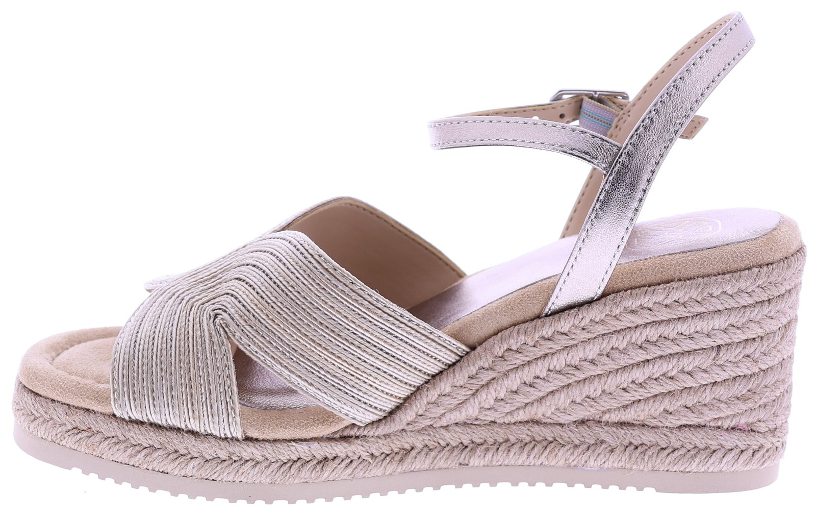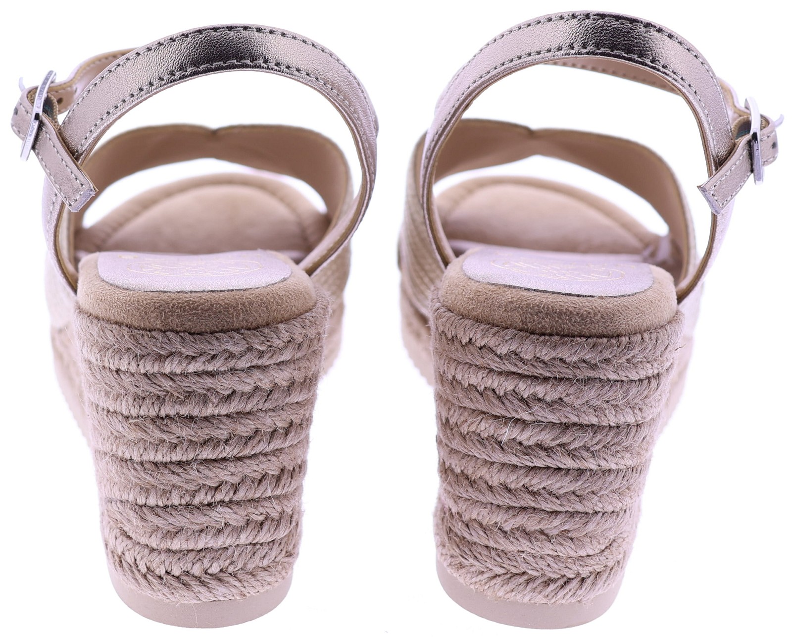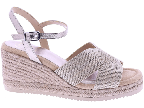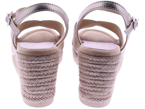 Bronskleurige dames sandalen van Unisa, model Ceresa. Deze zomerse sandaal heeft een comfortabele sleehak van 5 cm en een zacht voetbed dat moeiteloos meebeweegt met elke stap. De brede, gekruiste band in metallic brons geeft een luxe uitstraling, terwijl het verstelbare enkelbandje zorgt voor een mooie, stabiele pasvorm. De met touw omwikkelde sleehak maakt dit model extra zomers en stijlvol. Ontdek ook de andere dames sandalen van Unisa bij Klijsen.