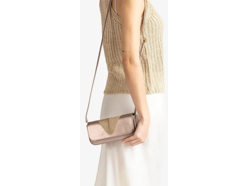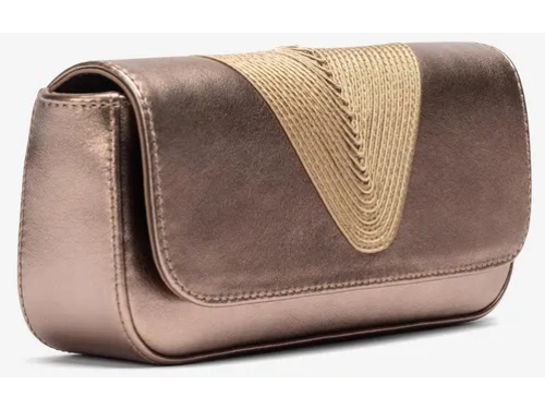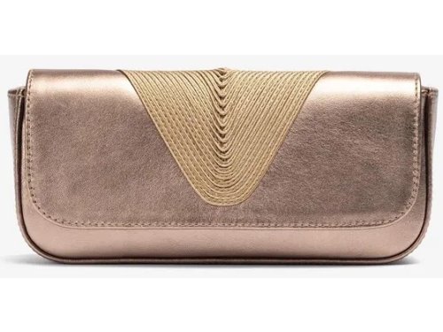 Bronskleurige leren dames tas van Unisa, model Zsousta. Deze stijlvolle clutch is uitgevoerd in een diepe navy tint en heeft een elegante, gevlochten garnering die mooi aansluit bij de bijpassende Unisa-sandalen. Het compacte, verfijnde ontwerp maakt dit tasje perfect voor feestelijke gelegenheden en avondlooks. Ideaal om je outfit compleet te maken met een chique en tijdloze finishing touch.