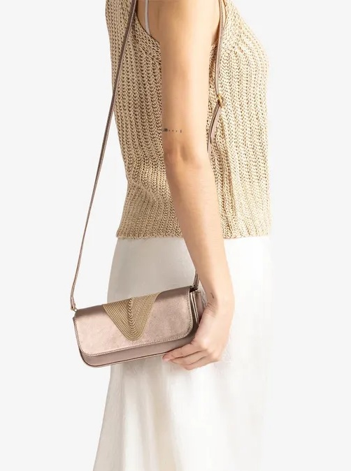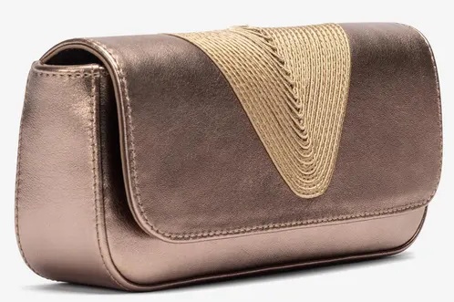 Bronskleurige leren dames tas van Unisa, model Zsousta. Deze stijlvolle clutch is uitgevoerd in een diepe navy tint en heeft een elegante, gevlochten garnering die mooi aansluit bij de bijpassende Unisa-sandalen. Het compacte, verfijnde ontwerp maakt dit tasje perfect voor feestelijke gelegenheden en avondlooks. Ideaal om je outfit compleet te maken met een chique en tijdloze finishing touch.