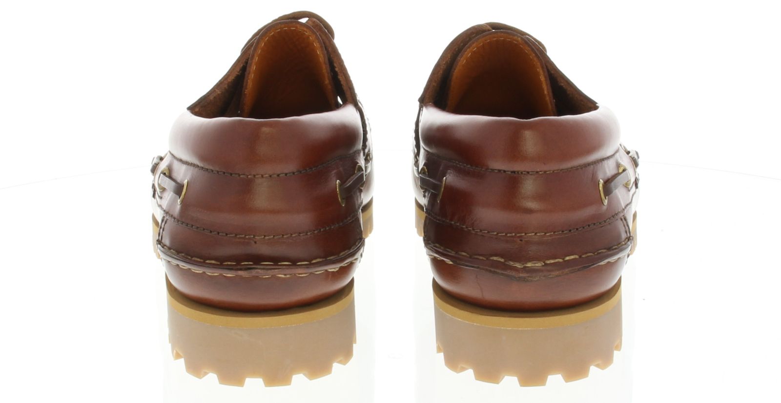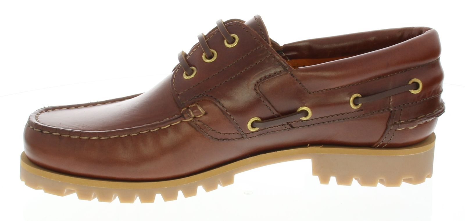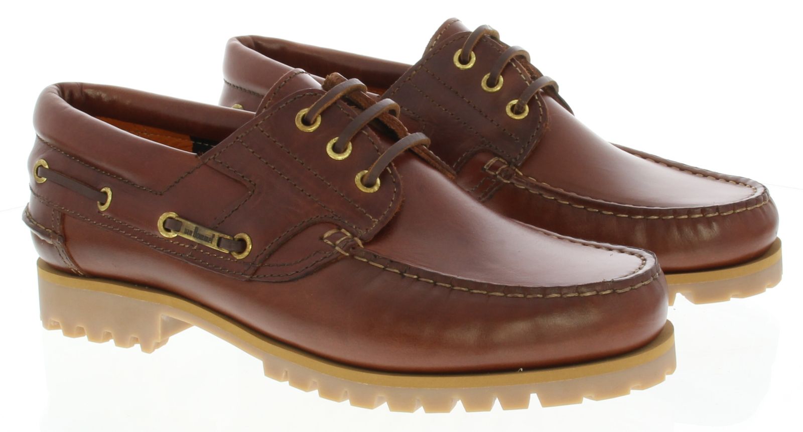 Bruine leren heren bootschoen van Van Bommel, model 02.05 (SBM-30002-27-01). Deze mocassin-stijl schoen is gemaakt van hoogwaardig leer en heeft karakteristieke veterdetails rondom de schacht. De robuuste rubberen profielzool zorgt voor goede grip en comfortabel loopgemak. De schoen is uitgevoerd in breedte H voor een ruimere pasvorm. Afgewerkt met een subtiel metalen Van Bommel-logo en geschikt voor zowel casual als nette gelegenheden.