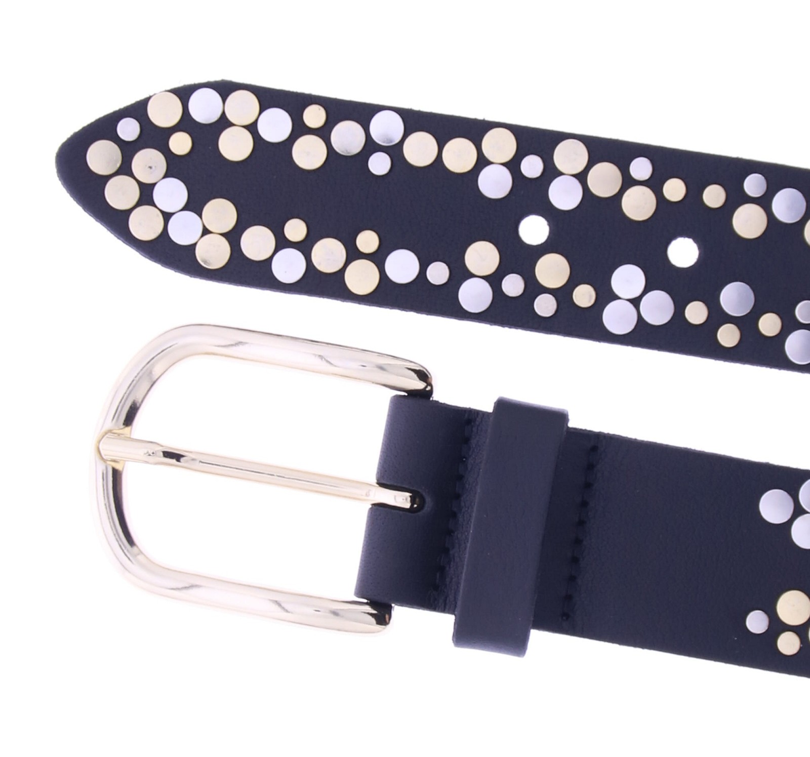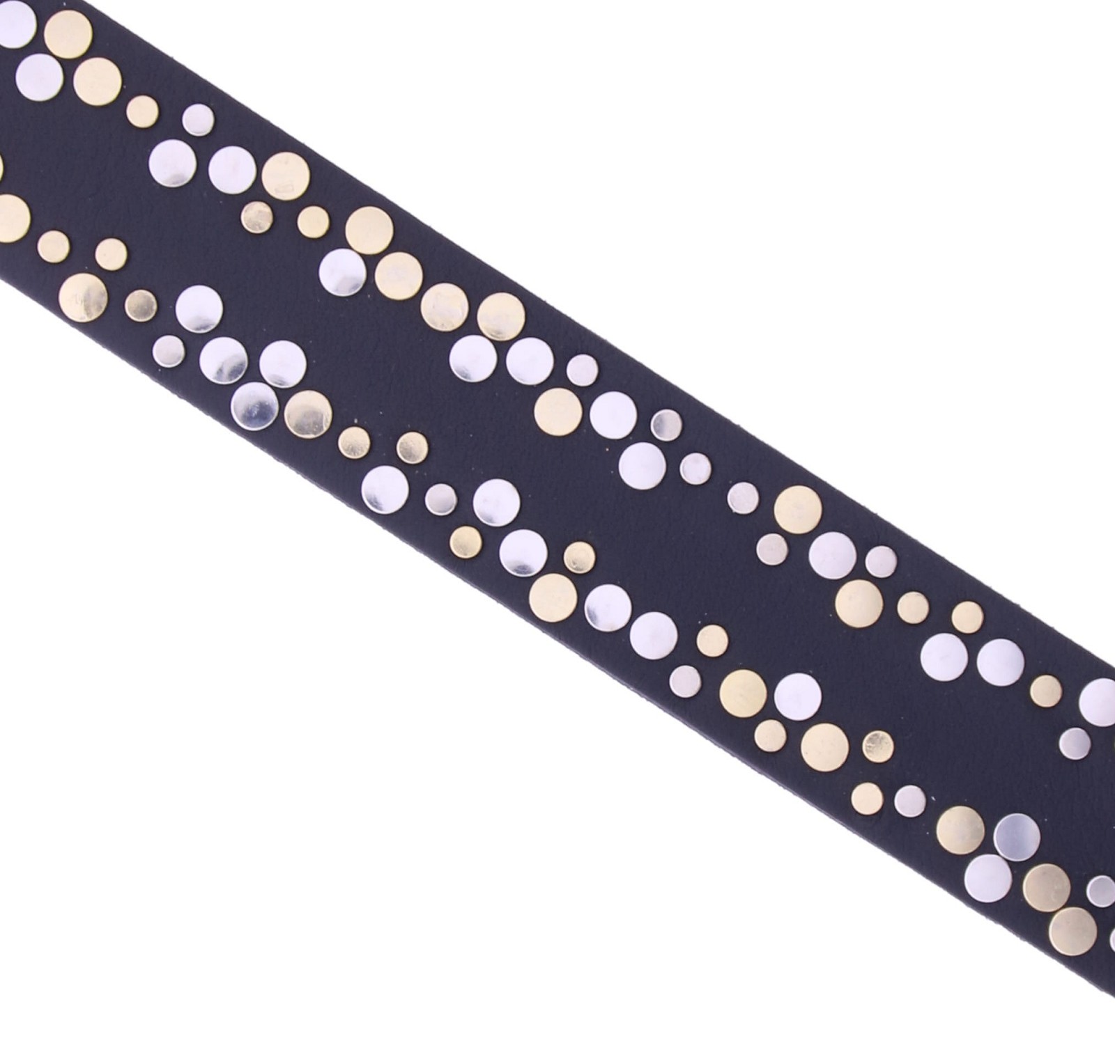 Zwart leren riem voor dames van Vanzetti versierd met zilver- en goudkleurige studs. De perfecte mix van stoer en chic! Draag hem op een jeans of jurk voor een stijlvolle finishing touch.