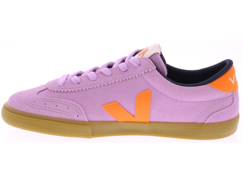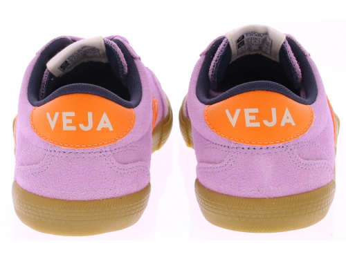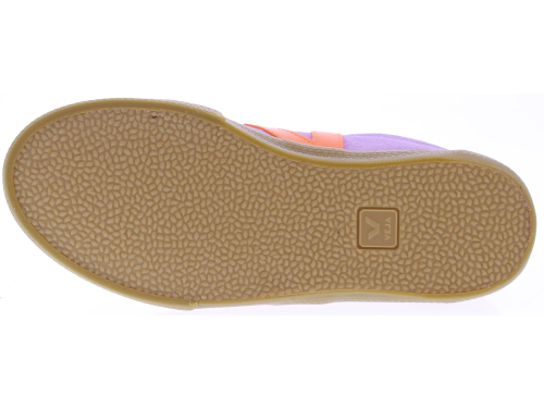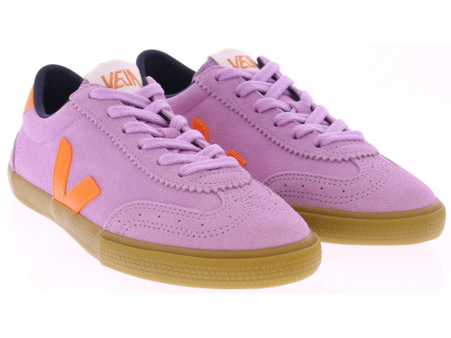 Dames sneaker van Veja in roze suède met oranje accenten. De schoen is gemaakt op een rubber zool in honing kleur en heeft een cominatie voering met uitneembaar voetbed.