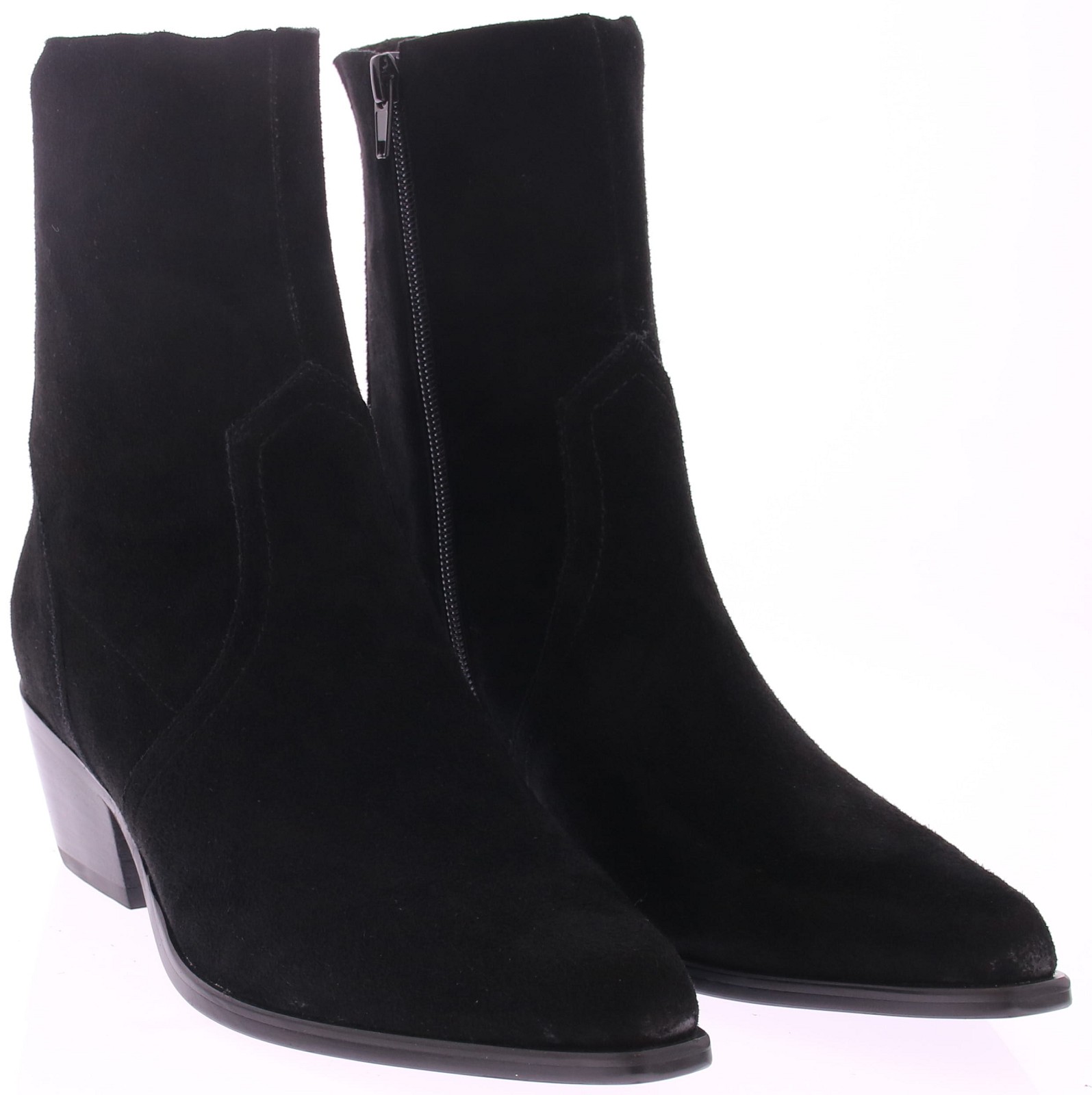 Zwart suede dames enkellaars Yelena van Vivian Ray. Het model heeft een verfijnde city western-uitstraling met een wat stoerdere comfortabele blokhak van 5 cm. Het laarsje heeft een rits en de schacht is ongevoerd wat zorgt voor extra souplesse en een fijne pasvorm. Gemaakt van sportief suede en voorzien van een stevige zool voor dagelijks gebruik. Combineer moeiteloos met zowel een jeans als een rok of jurk.