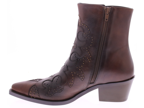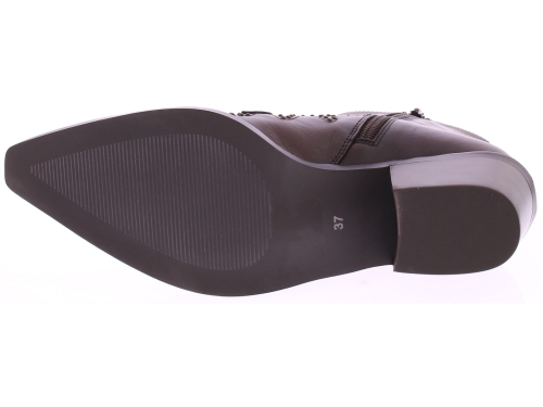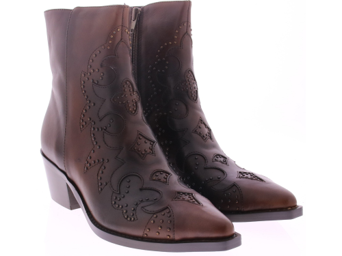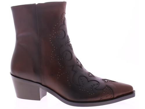 Donkerbruine enkellaars van Vivian Ray. Deze unieke enkellaars uit de Vivian Ray collectie combineert donkerbruin leer met sierlijke studs. De western-geinsprireerde look geeft de laars een stoere en stijlvolle uitstraling. Dankzij de comfortabele blokhak van 4 cm en de verfijnde afwerking is deze laars perfect voor dames die op zoek zijn naar een wat meer uitgesproken en modische laars.