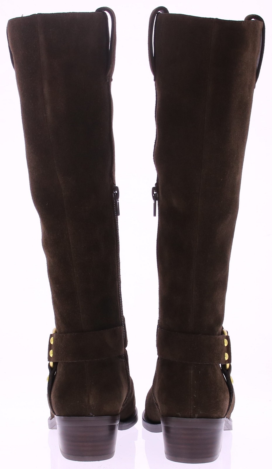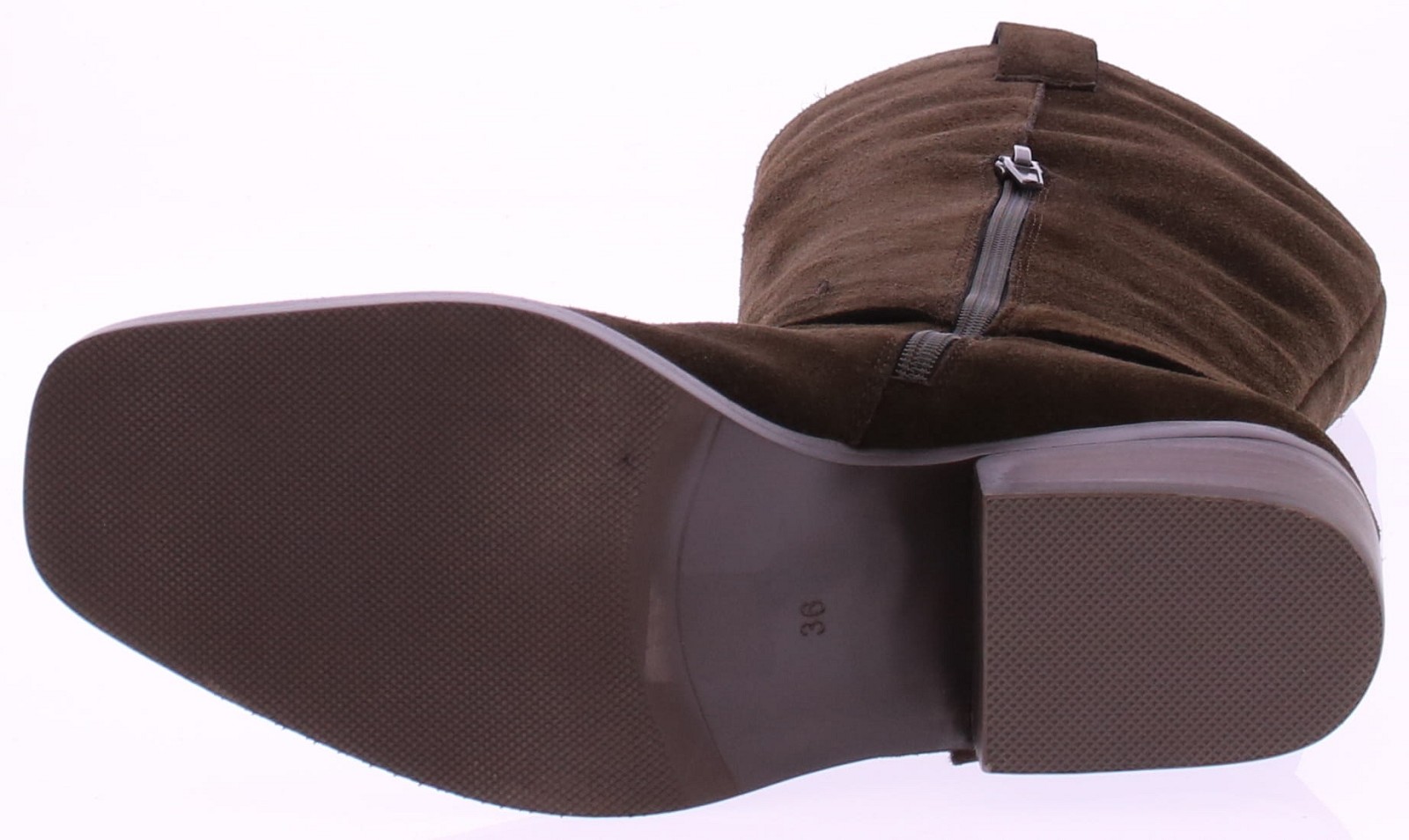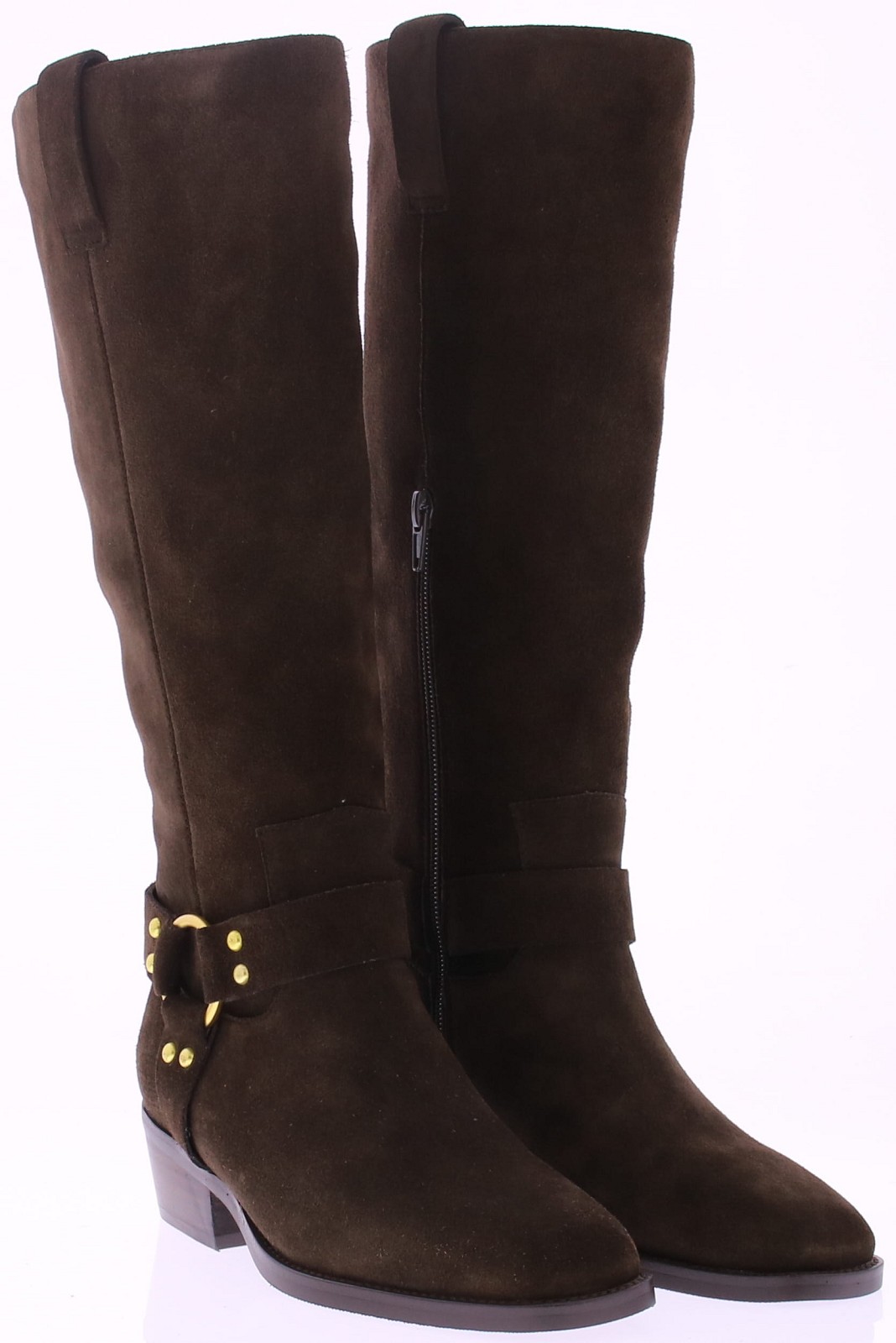 Donker bruin suéde hoge dames laars van Vivian Ray. Deze hoge laars met ovale leest en 4 cm hak zorgen voor een vrouwelijke maar toch stoere look. Dankzij de leren voering zit de laars heerlijk en is hij perfect te combineren met zowel casual als geklede outfits. Een stijlvolle basic die je keer op keer zult dragen.