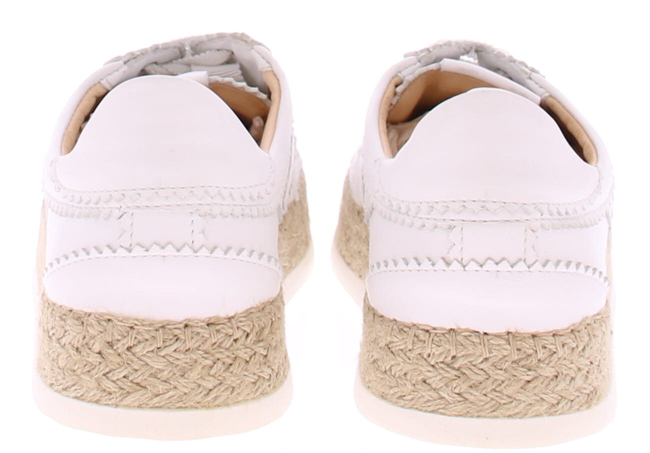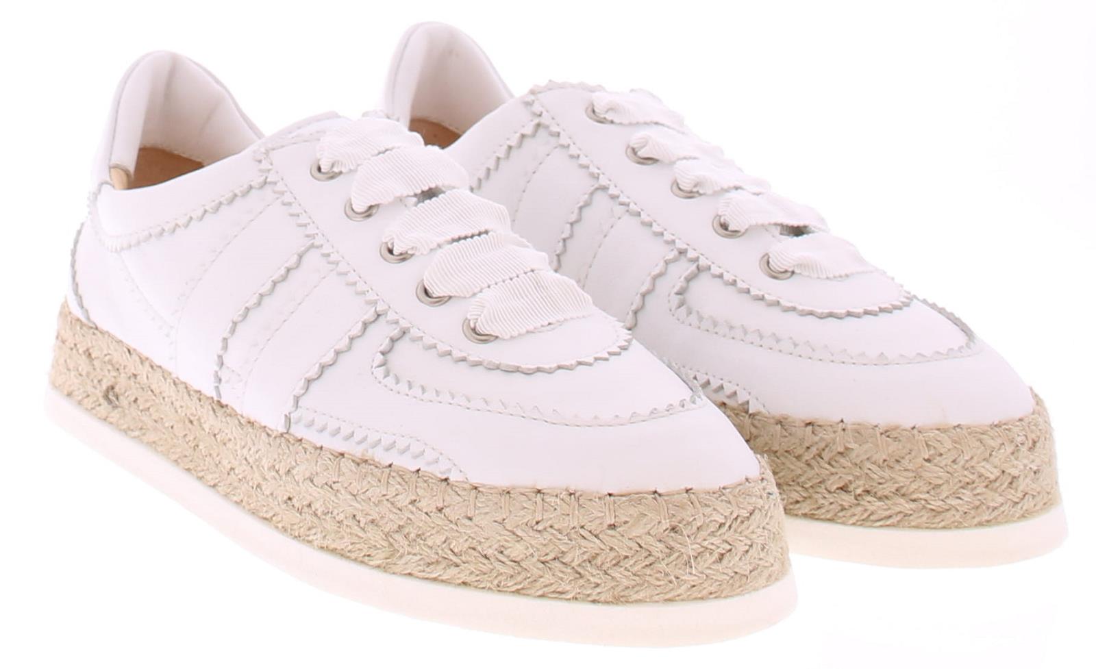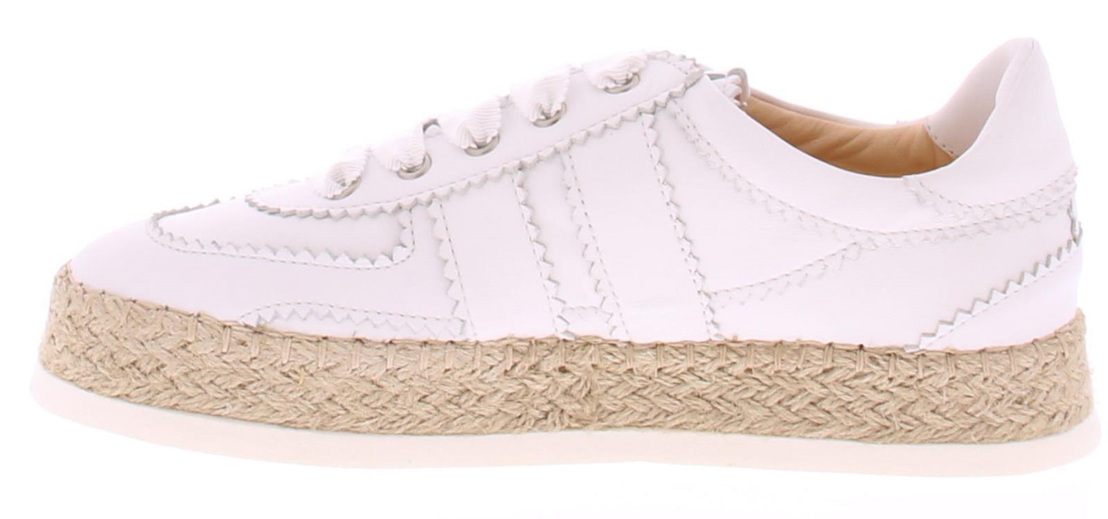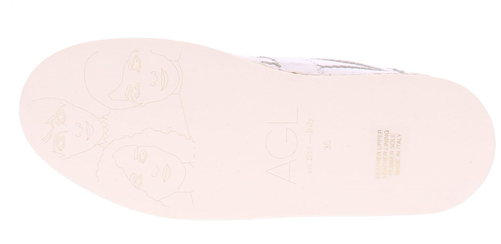 Wit leren dames sneaker van AGL. De sneakers zijn bewerkt met een kartelrandje langs de naden. Om de schoen zit een rand van touw. De schoen is geheel leer gevoerd en heeft een leren uitneembaar voetbed. AGL gebruikt altijd de mooiste materialen en heeft een fantastische pasvorm.