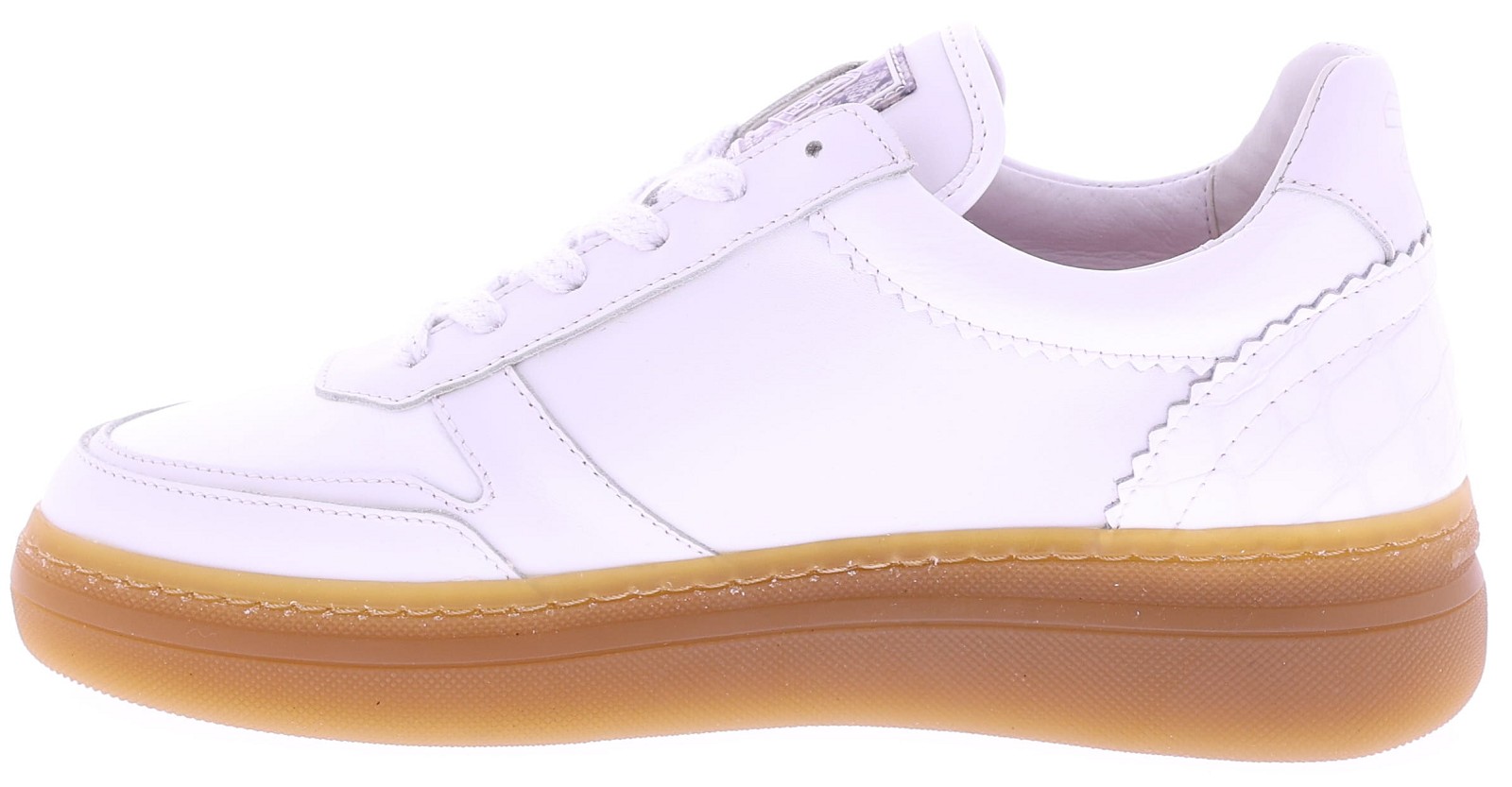 Wit leren dames sneakers van Floris van Bommel. Model Fygi 01.03 is een sportieve sneaker op een transparante, gumkleurige tenniszool. Het bovenwerk bestaat uit een combinatie van offwhite suède en wit lakleer, met een crocomotief op de hiel. De leren voering en het uitneembare voetbed zorgen voor optimaal comfort en flexibiliteit. Op de tong is een kunststoflabel met het Floris van Bommel-logo bevestigd. Ontdek ook de andere dames sneakers van Floris van Bommel bij Klijsen.