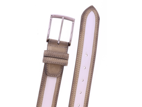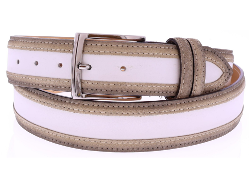 Heren riem van het merk Harris. Deze riem heeft een middenstuk van off white leer. De buitenzijdes zijn afgewerkt met taupe leer. De riem is in te korten aan de gespkant. Deze riem is passend bij de schoen uit onze collectie met artikelnummer 44888.
