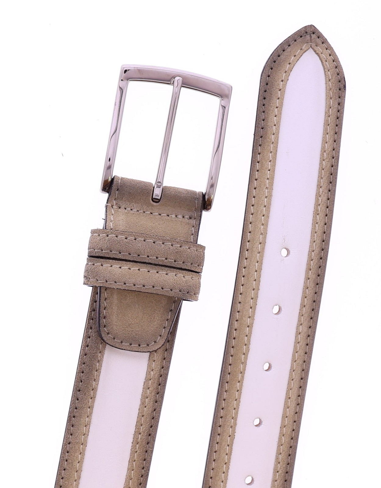Heren riem van het merk Harris. Deze riem heeft een middenstuk van off white leer. De buitenzijdes zijn afgewerkt met taupe leer. De riem is in te korten aan de gespkant. Deze riem is passend bij de schoen uit onze collectie met artikelnummer 44888.
