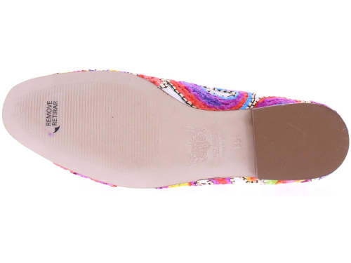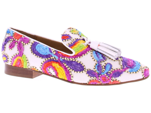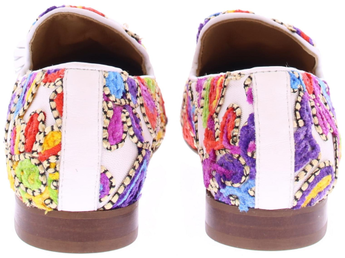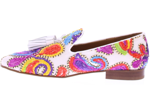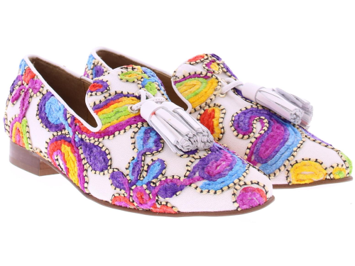 Wit stoffen dames loafer van Pedro Miralles. Deze loafer is bedekt met een vrolijk geborduurd multikleurig patroon en heeft wit leren kwastjes op de wreef. Doordat deze instapper is gemaakt van een geborduurde stof kunnen de schoenen verschillen van patroon en kleur. De loafer heeft een rubberen zool.