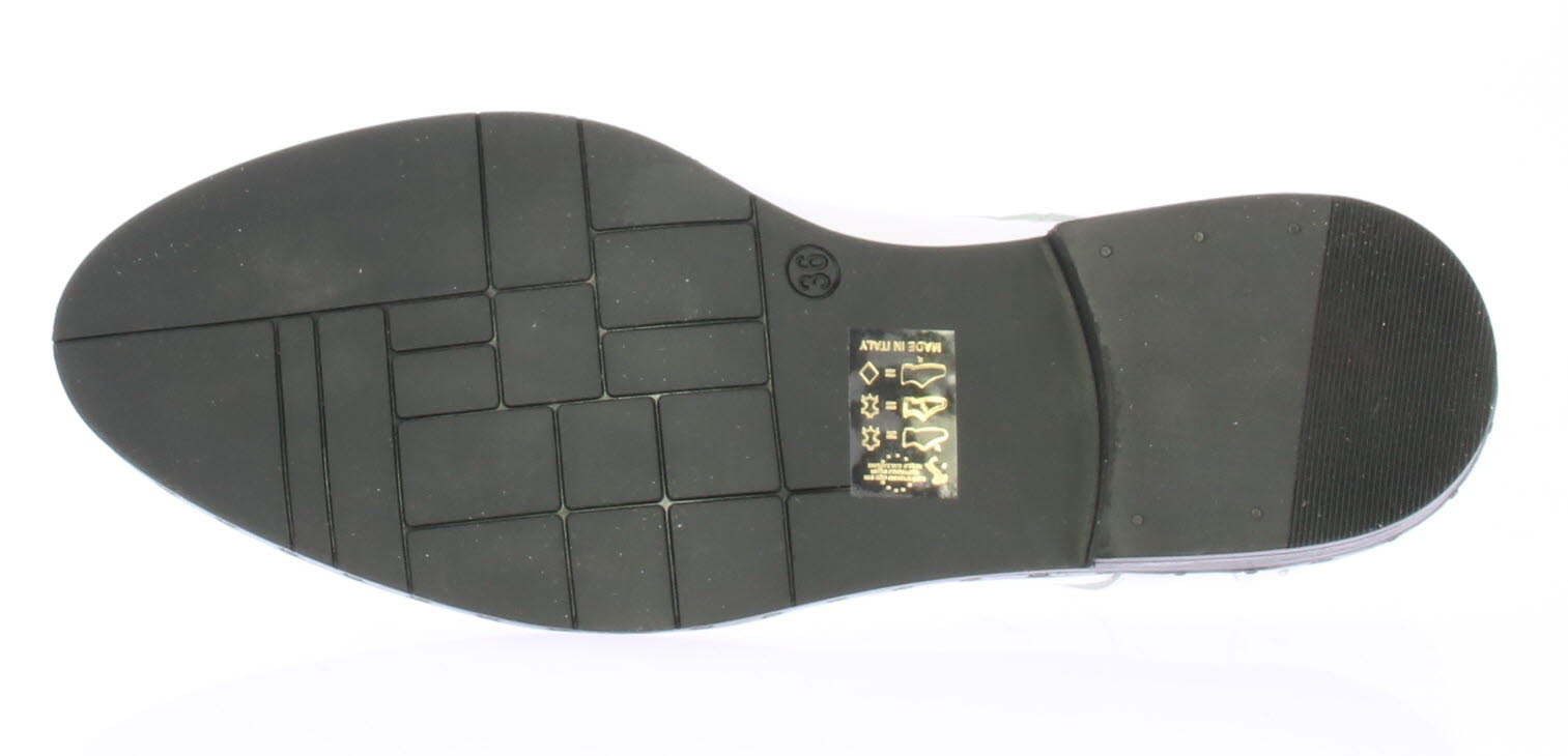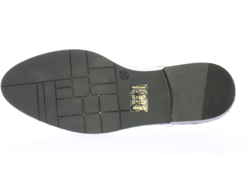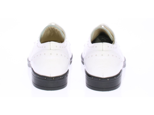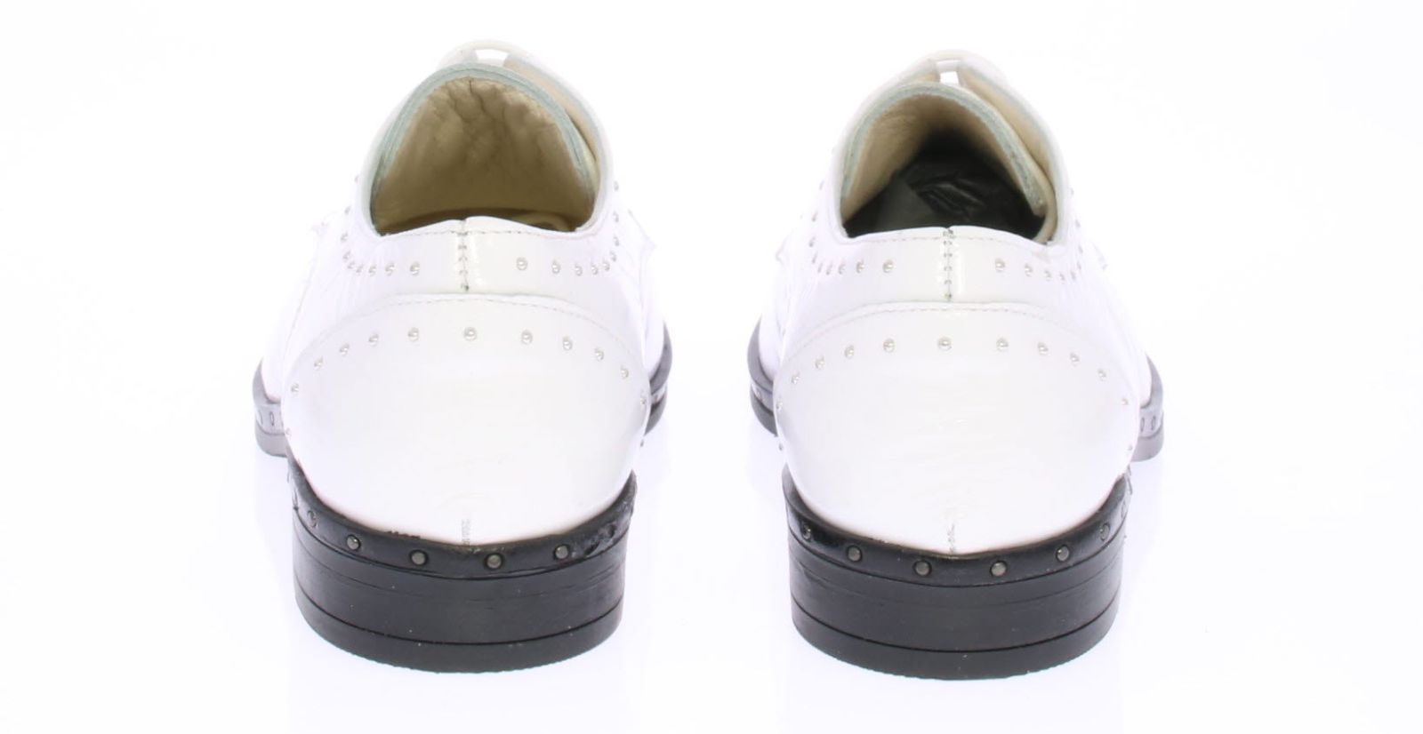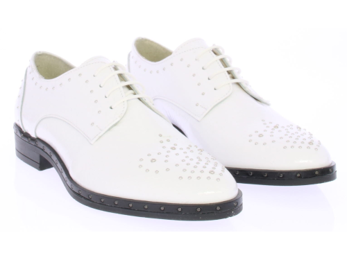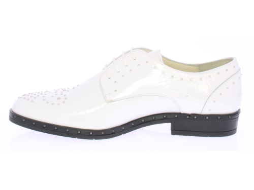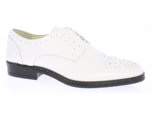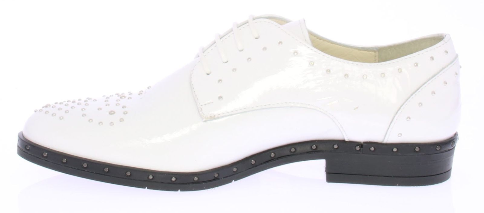 Wit lakleren dames veterschoen van Valdorini. De schoen is afgewerkt met fijne zilverkleurige studs en donkere spijkertjes langs de zool.