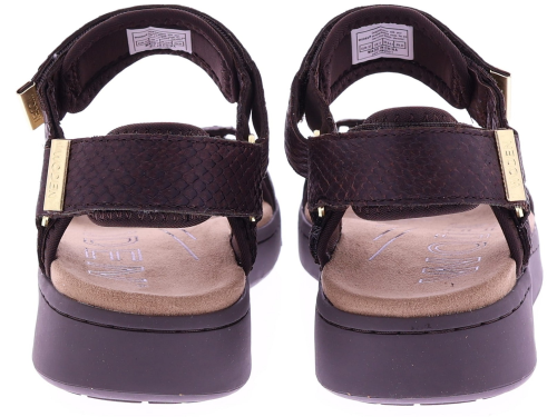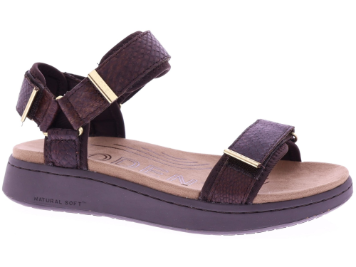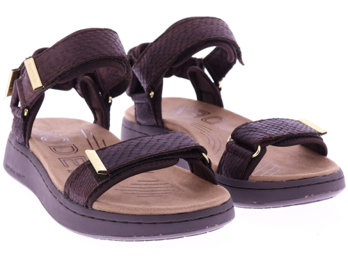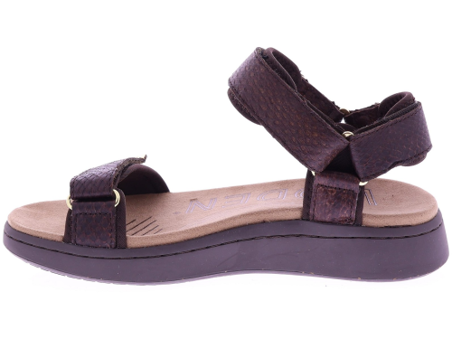 Chocoladekleurige leren dames sandalen van Woden, model WL944 Line Fish. Uitgevoerd in soepel leer met een subtiele schubbenprint en twee verstelbare banden met klitteband. De zachte loopzool biedt lichtgewicht comfort en ondersteuning bij elke stap. Een fijne, praktische sandaal die leuk staat bij zowel een zomerse jurk als een casual broek. Ontdek ook de andere dames sandalen van Woden bij Klijsen.