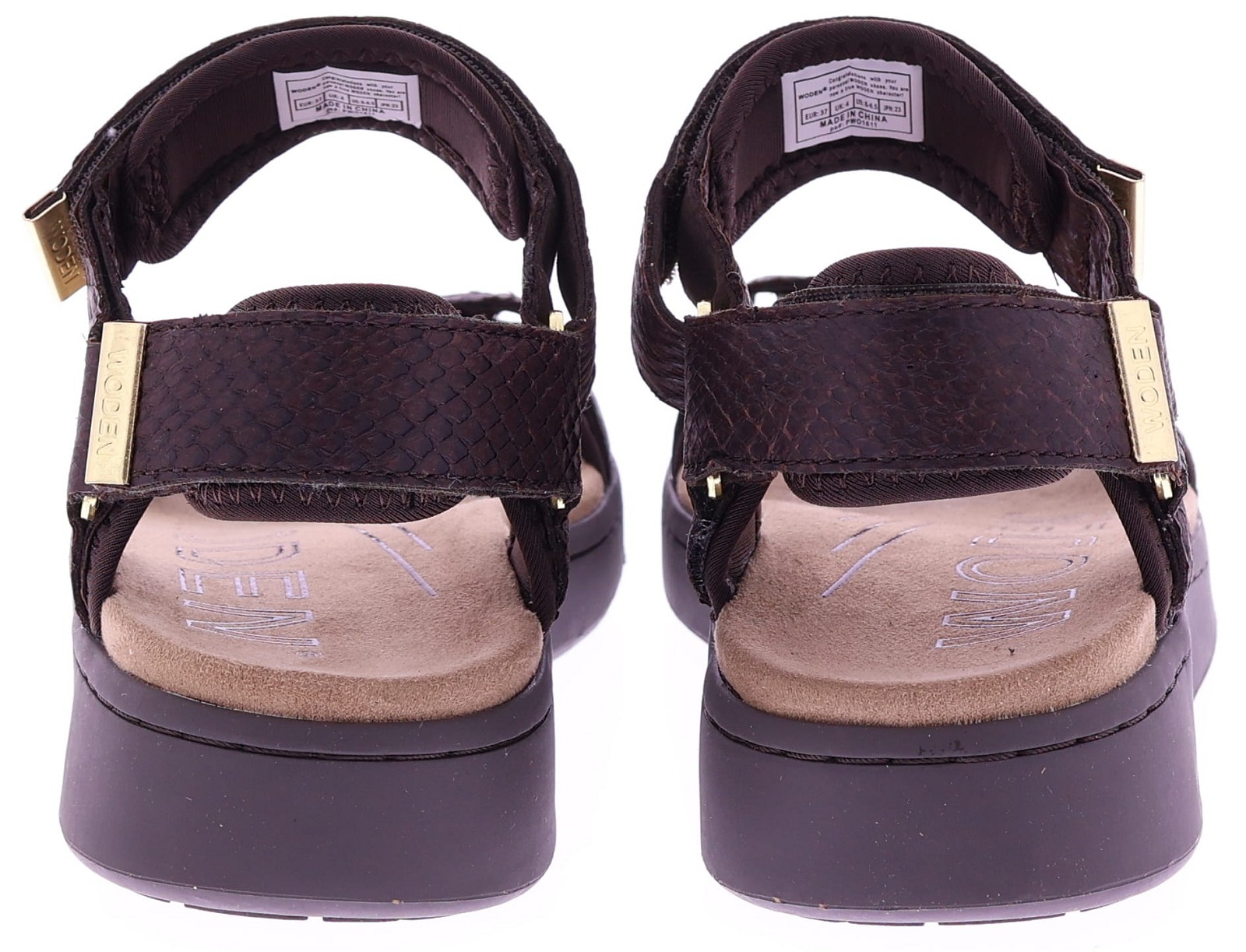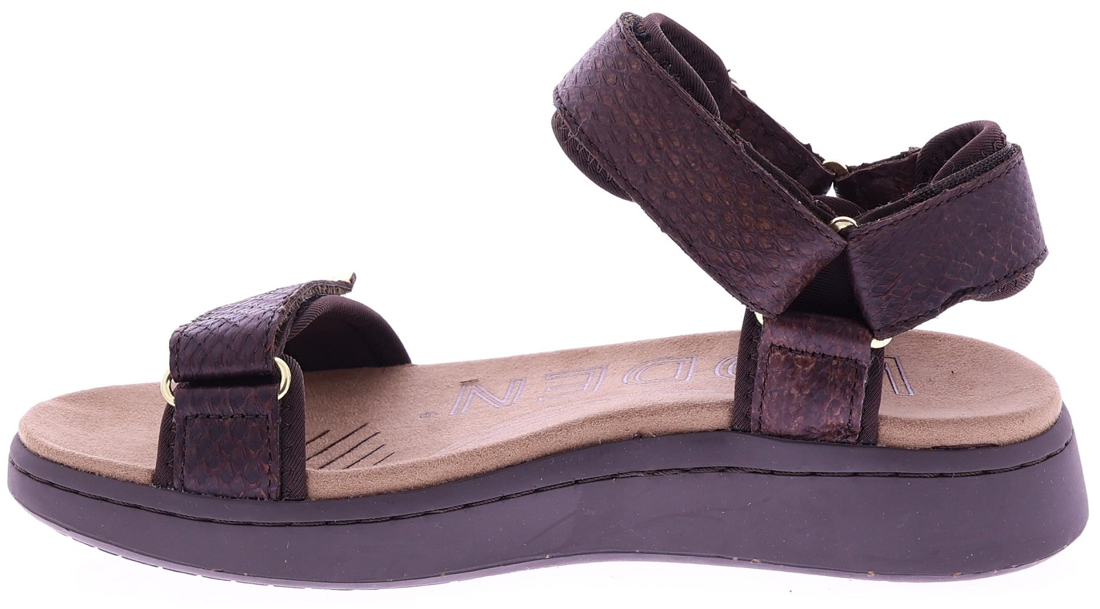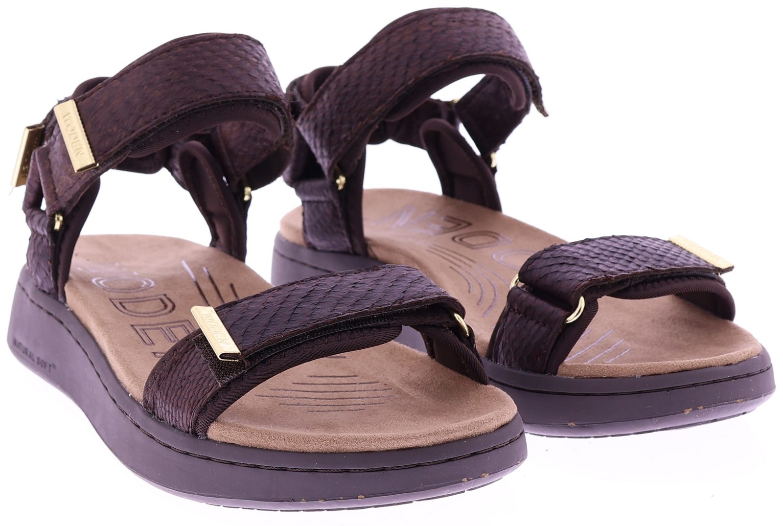 Chocoladekleurige leren dames sandalen van Woden, model WL944 Line Fish. Uitgevoerd in soepel leer met een subtiele schubbenprint en twee verstelbare banden met klitteband. De zachte loopzool biedt lichtgewicht comfort en ondersteuning bij elke stap. Een fijne, praktische sandaal die leuk staat bij zowel een zomerse jurk als een casual broek. Ontdek ook de andere dames sandalen van Woden bij Klijsen.