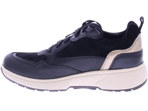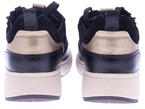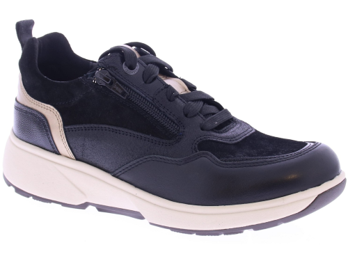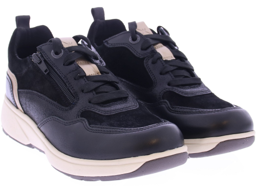 Zwart leren dames sneaker van Xsensible. Deze sneaker is gemaakt van superzacht leer de zachte kussentjes aan de rand van de schacht worden gecombineerd met appliqués in contrastkleuren en glanzende metallic details. Dankzij de rits aan de zijkant is de sneaker gemakkelijk aan- en uit te trekken. Deze schoen is uitgevoerd als de door Xsensible ontwikkelde "stretchwalker". Deze is gebaseerd op een houten balansslipper uit Japan en zorgt voor een natuurlijke en gezonde lichaamshouding. In combinatie met perfecte demping, stabiliteit en stevige grip geeft deze schoen u de meest comfortabele loopervaring. De sneaker heeft een uitneembaar voetbed en een bredere pasvorm.