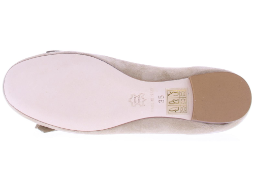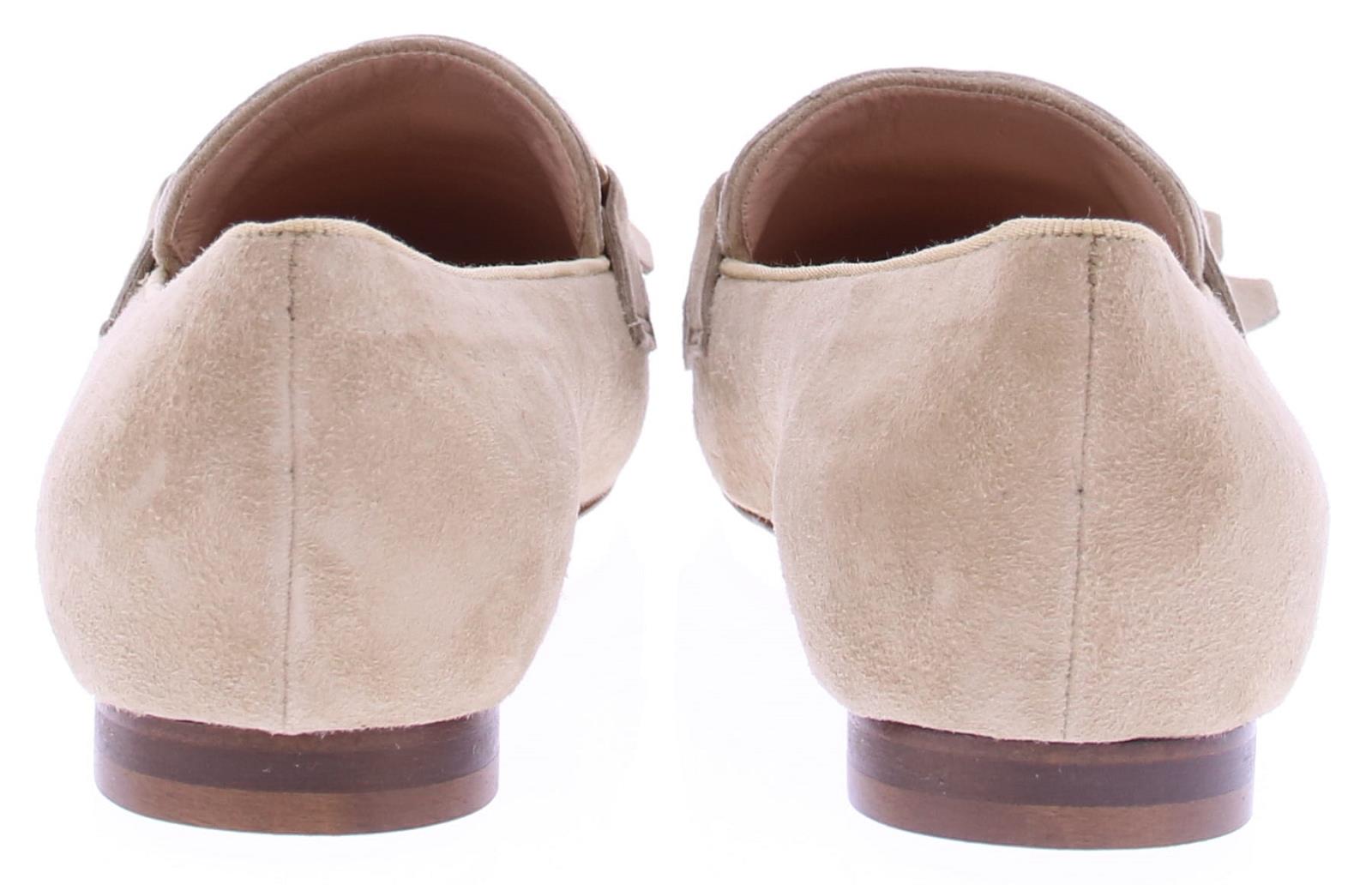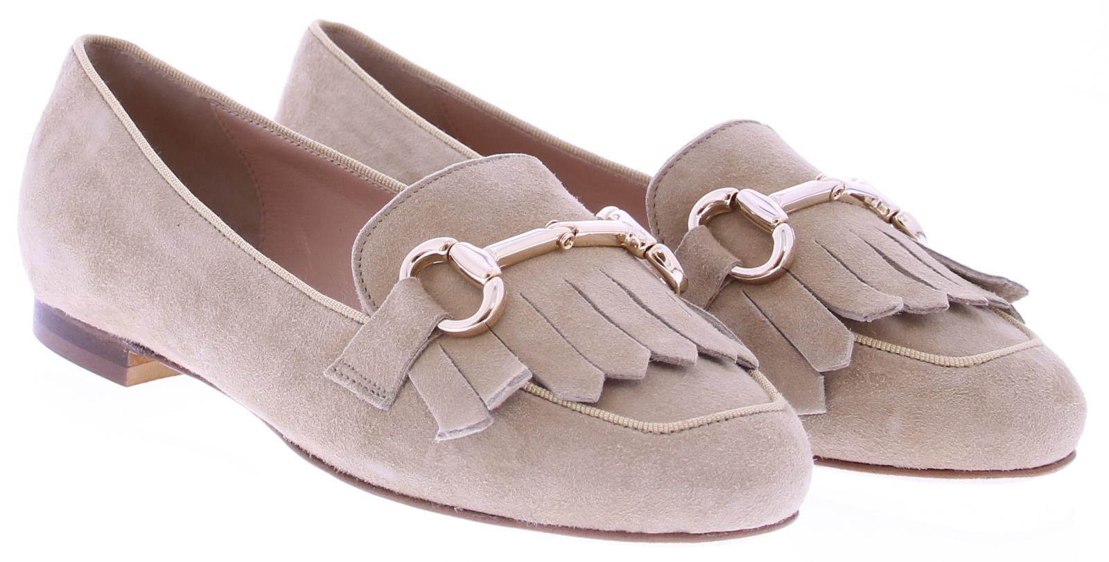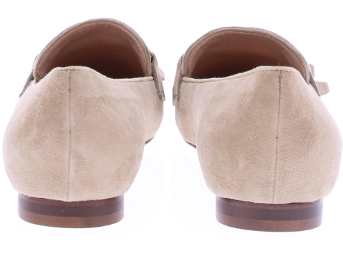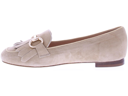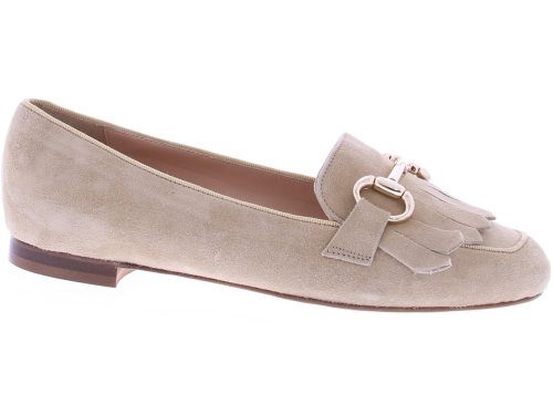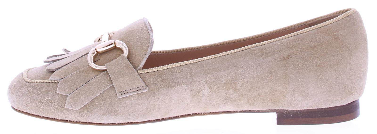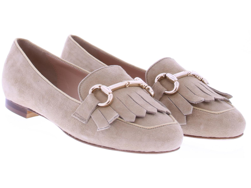Zandkleurig suede dames instapper van Pascucci. Dit model heeft een jamboree klep over de wreef met een platina kleurige bit. Het voetbed is van leer en de hak heeft een hoogte van 1 cm.