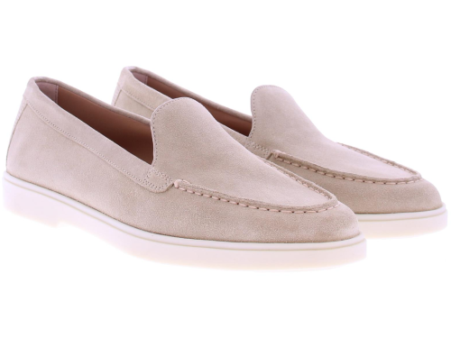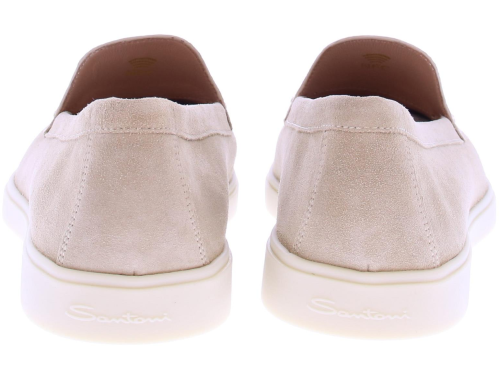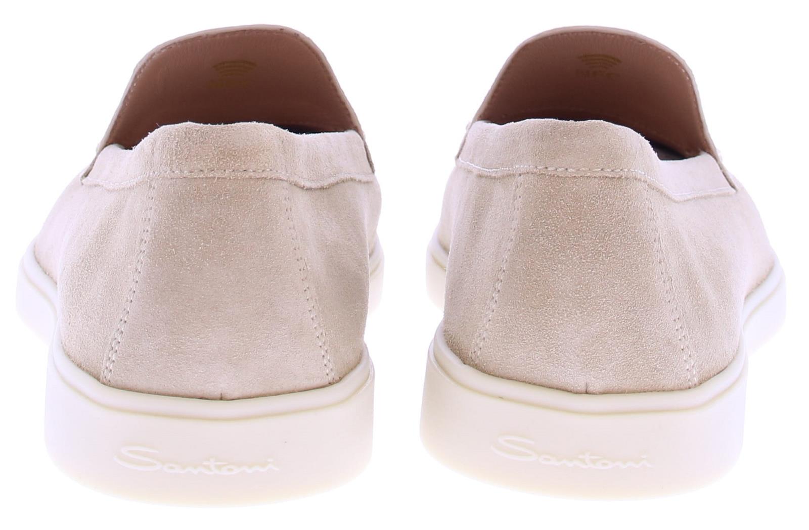 Zandkleurig suede dames instapper van Santoni. Deze instapper is uitgevoerd met een ronde neus en de schoen heeft een spiegelnaad ter decoratie. De witte rubberen zool heeft een medium profiel. Het voetbed is vervangbaar voor u eigen persoonlijke inlegzool. Door het gebruik van de fijnste leersoorten en arbeidsintensieve maakwijze worden schoenen van Santoni met passie gecreëerd.