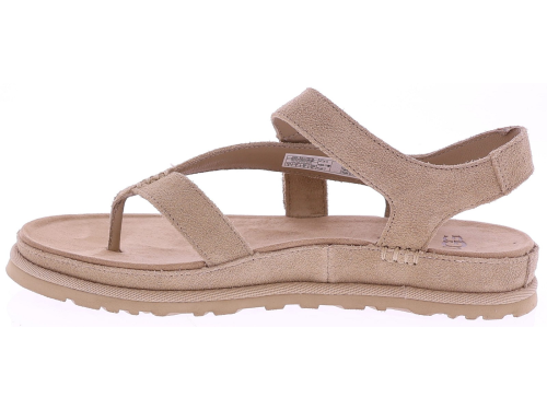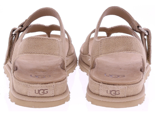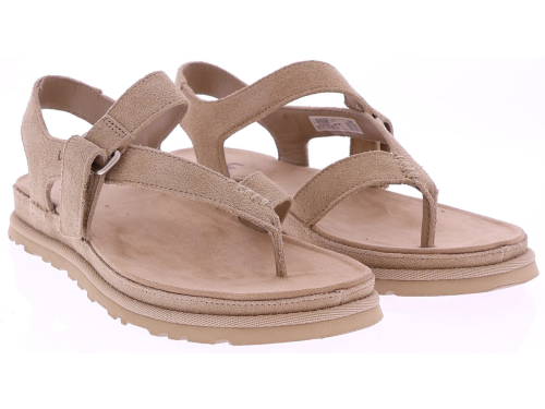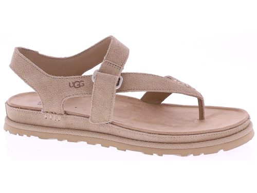 Zandkleurige suède dames slippers van UGG, model Goldengaze Toe Post. Deze comfortabele teenslipper is uitgevoerd met een zacht suède bovenwerk en een stevige maar lichte zool die prettig meeloopt. De klittenband sluiting zorgt voor een goede pasvorm. Ideaal voor warme dagen, zowel thuis als onderweg. Mooi te combineren met een zomerse jurk of linnen broek. Kijk ook eens bij onze andere UGG damesschoenen bij Klijsen.