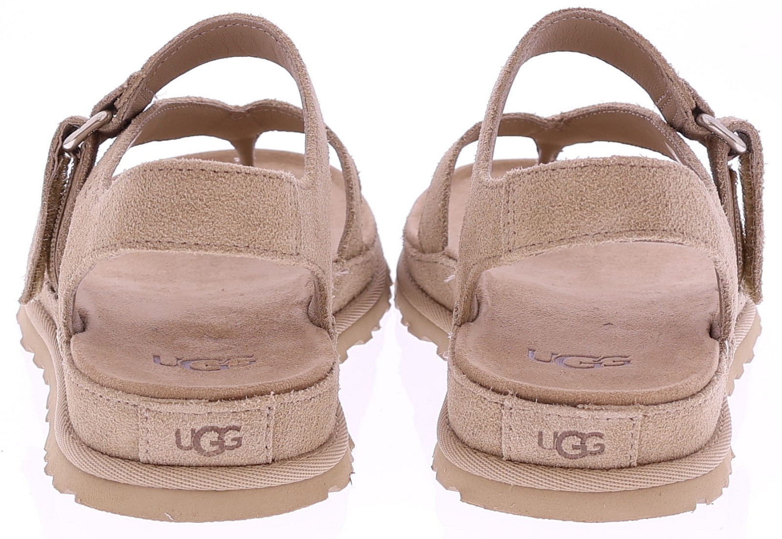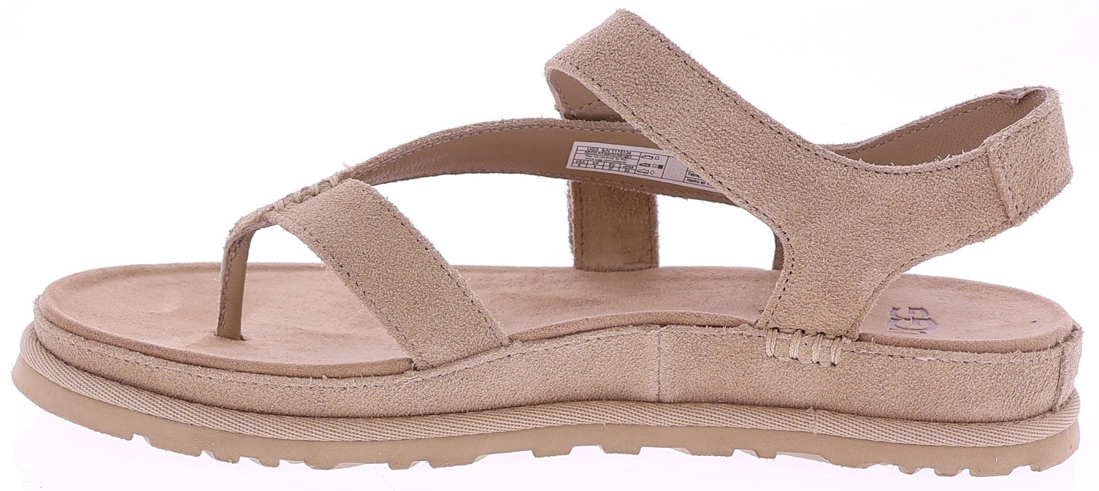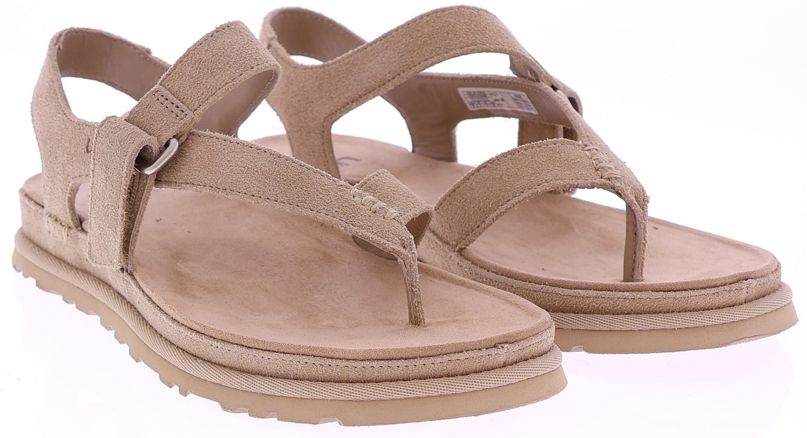 Zandkleurige suède dames slippers van UGG, model Goldengaze Toe Post. Deze comfortabele teenslipper is uitgevoerd met een zacht suède bovenwerk en een stevige maar lichte zool die prettig meeloopt. De klittenband sluiting zorgt voor een goede pasvorm. Ideaal voor warme dagen, zowel thuis als onderweg. Mooi te combineren met een zomerse jurk of linnen broek. Kijk ook eens bij onze andere UGG damesschoenen bij Klijsen.