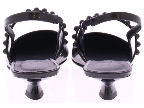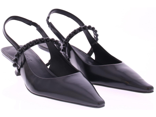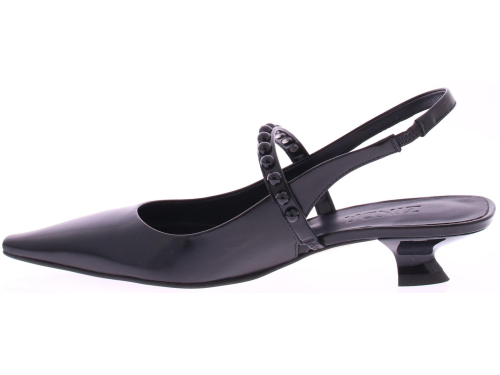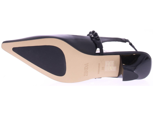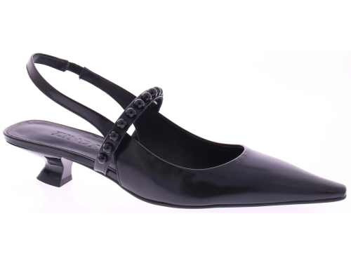 Zwart leren dames slingback pump van Zinda. Deze stijlvolle pump heeft een spitse neus en een elegant queenie hakje van 3 cm. Voor extra comfort en een goede pasvorm heeft de schoen een elastiekje in de hielband. Het wreefbandje is versierd met subtiele studs in de kleur van de schoen, en geeft een speelse, maar chique touch.