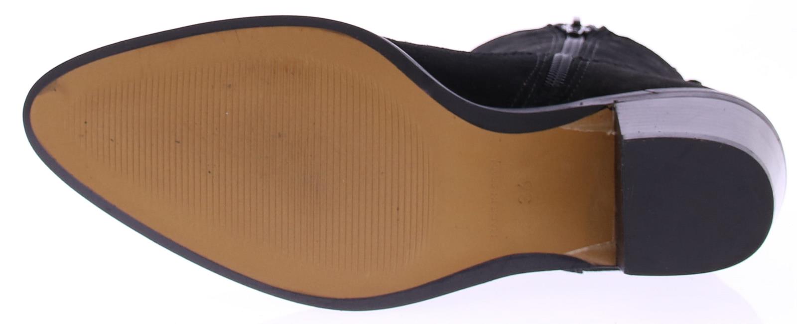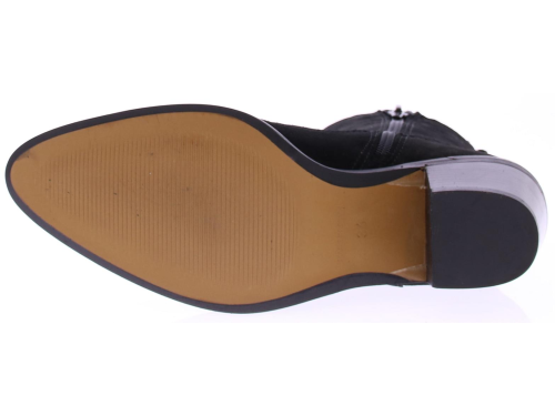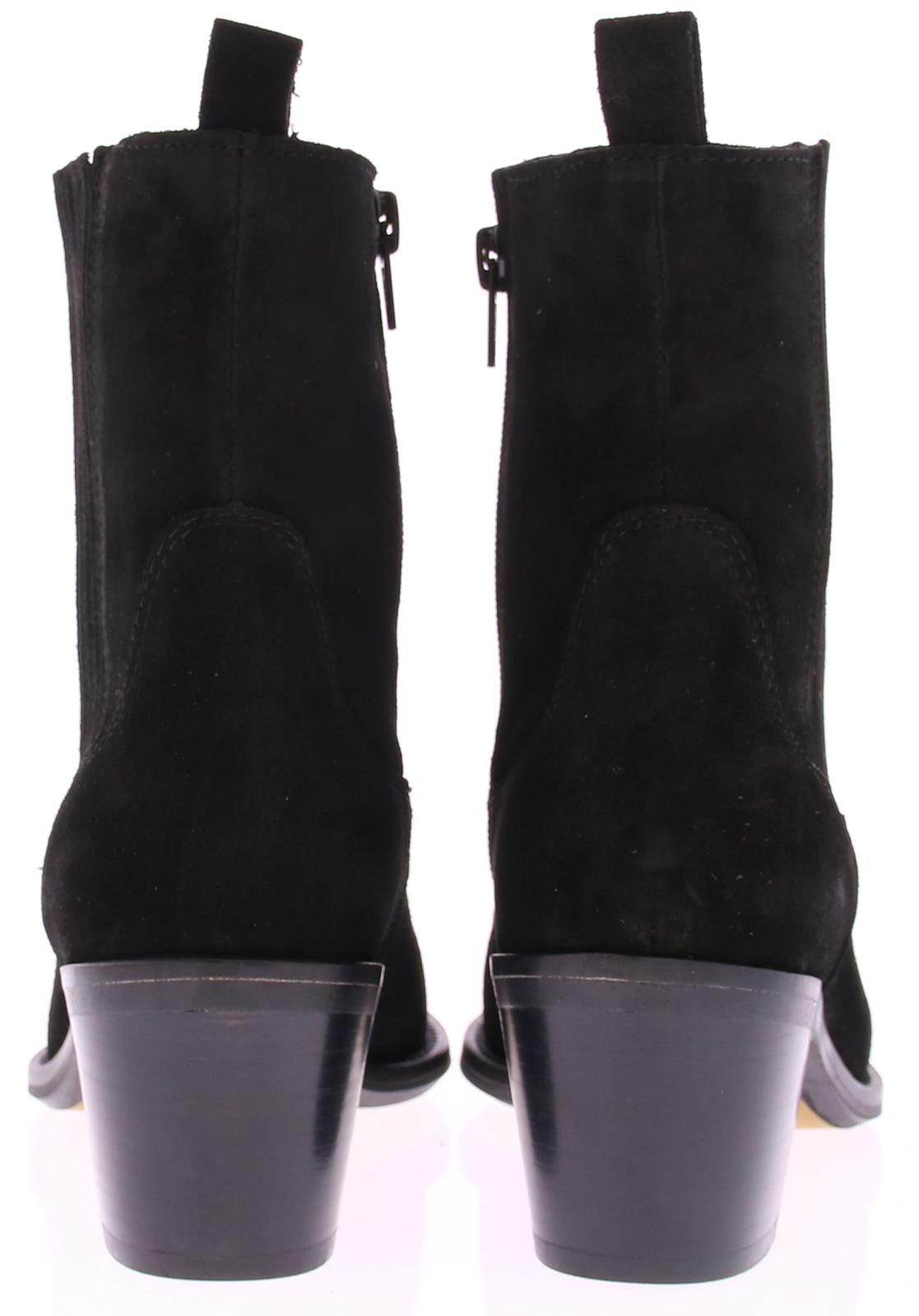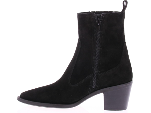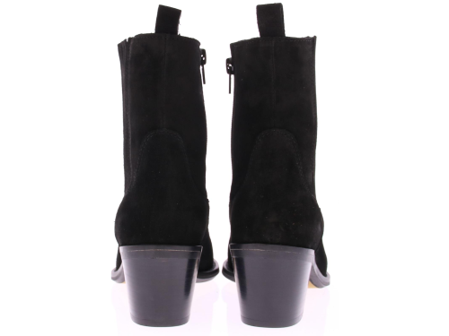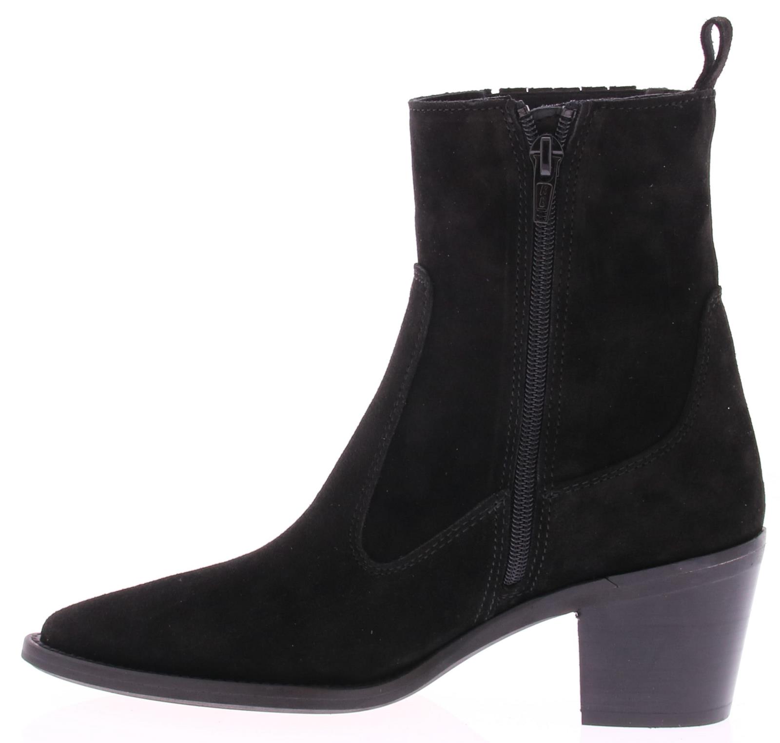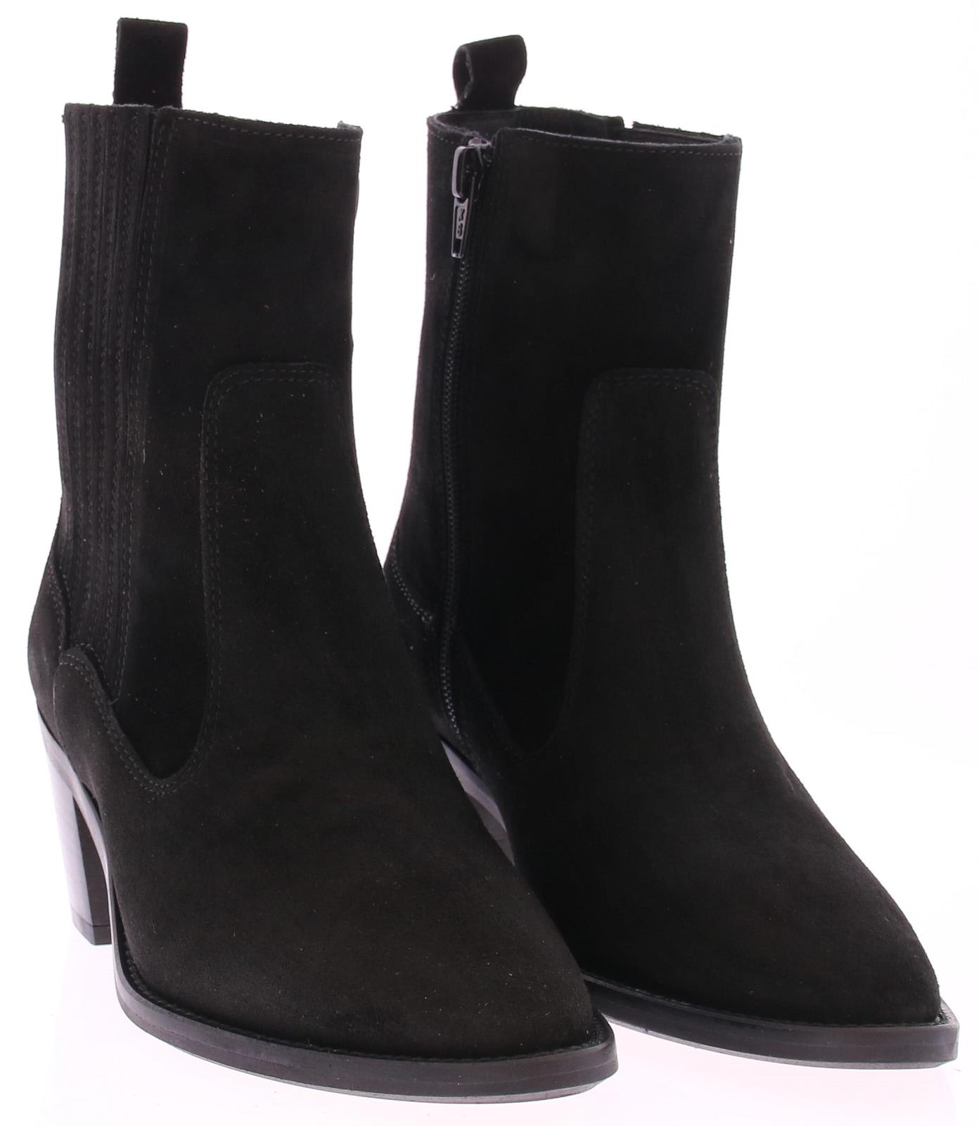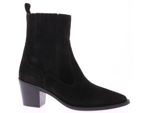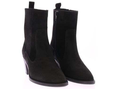 Zwart suede korte dames laars van Alpe. Dit laarsje heeft een inzet van elastiek aan de zijkant. En aan de binnenkant een rits. De blokhak is 6 cm en heeft een hout structuur. De zool is gemaakt van rubber. De trend van dit moment het city western look laarsje. Leuk onder jurkjes of bij een broek.