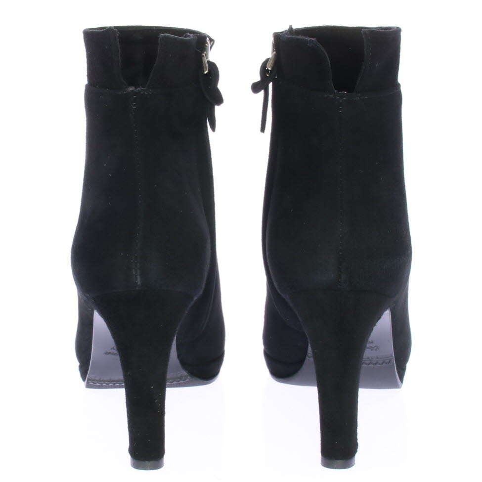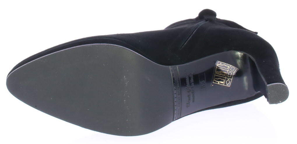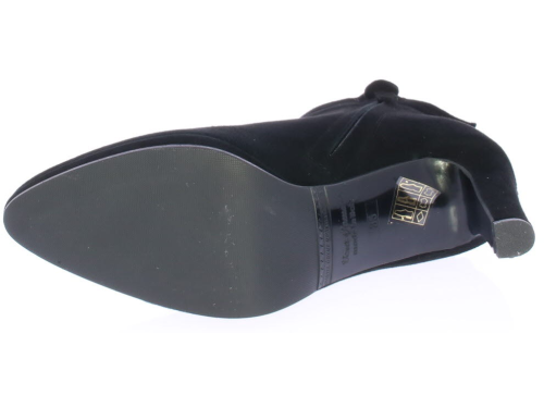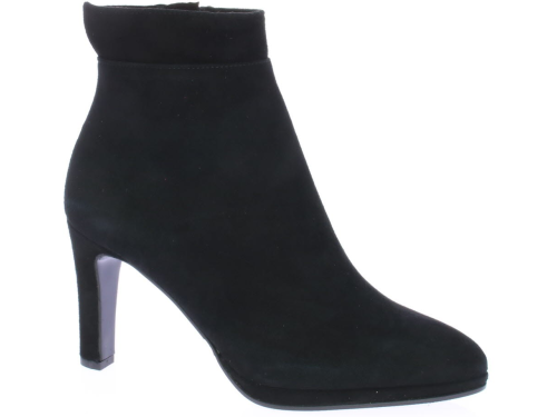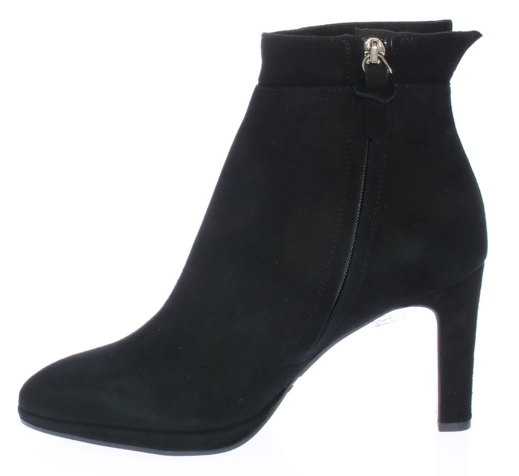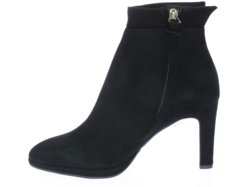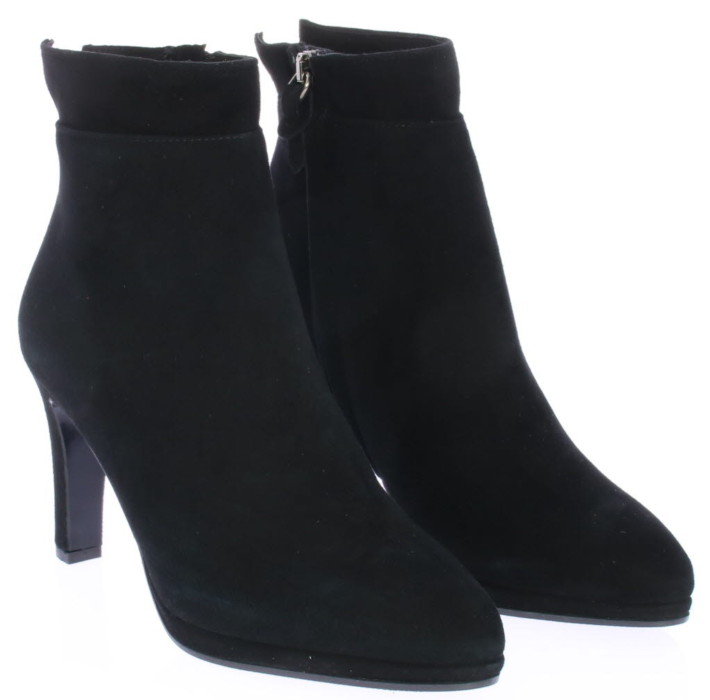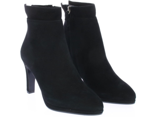 Zwart suede dames enkellaars van Cypres met plateauzool. Afgewerkt met een "kraagje" met inkeping op de hiel. Aan de zijkant zit een rits en de hak is 8 cm hoog maar voelt lager door de plateauzool. Elegant laarsje wat ook leuk te dragen is onder een rok of jurk. Valt wat kleiner, overweeg een halve maat groter te bestellen.|