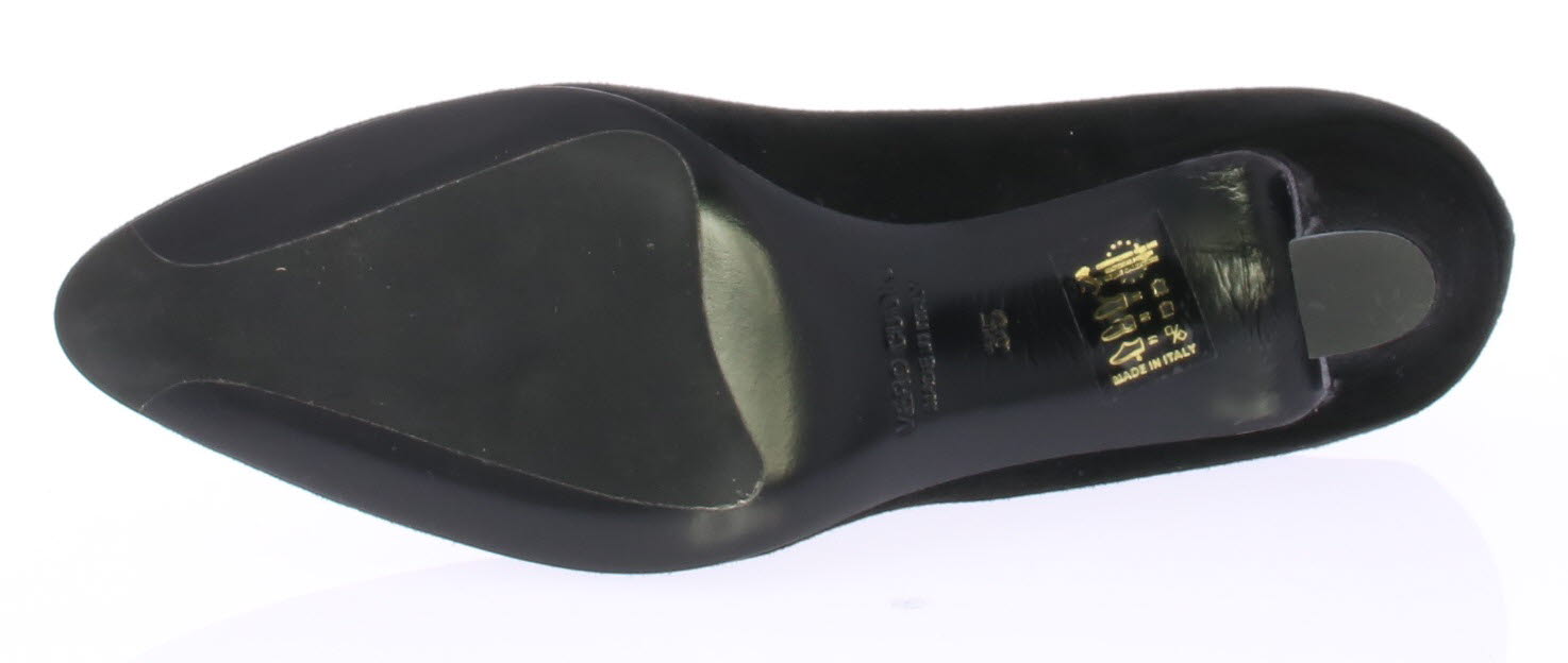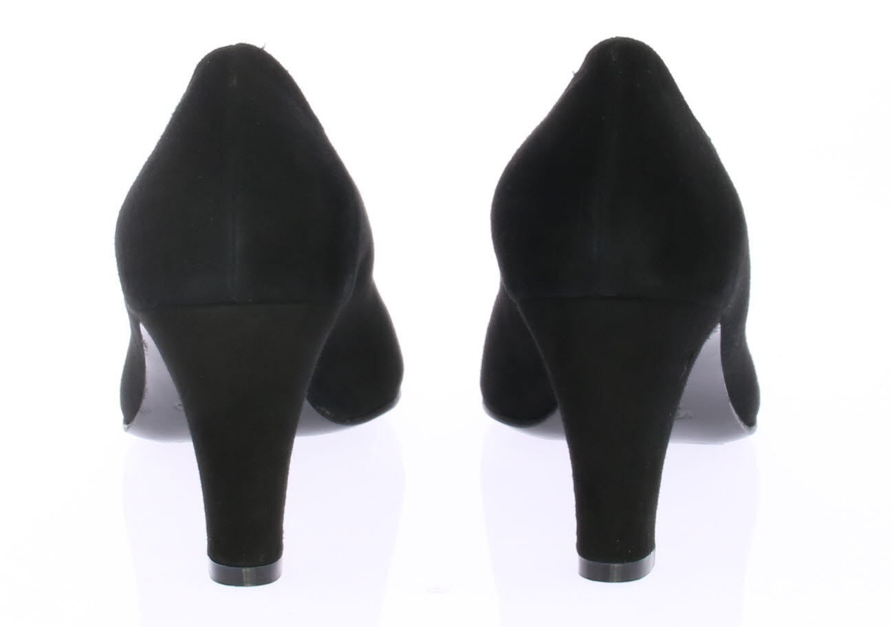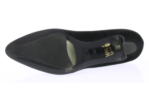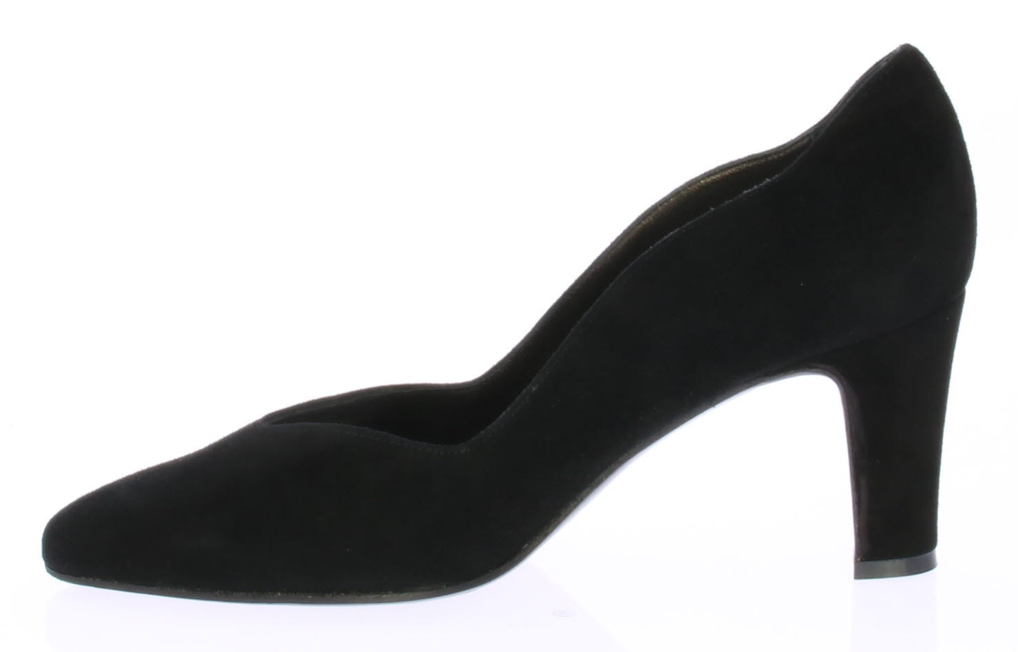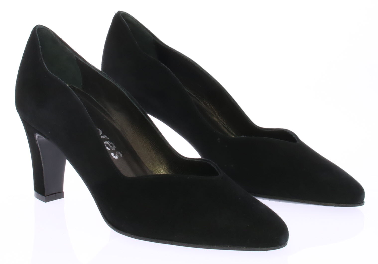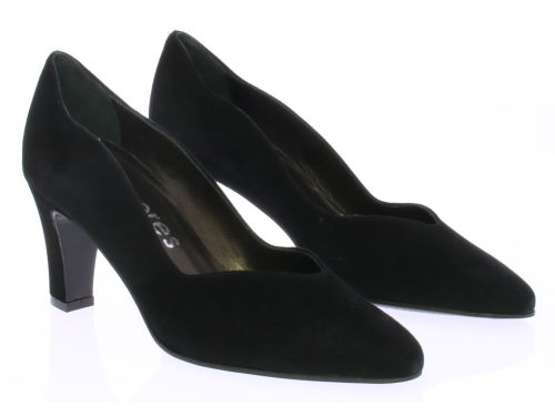 Zwart suede dames pump van Cypres. De pump is afgewerkt met een speelse golvende belijning en heeft een beklede 6 cm hak. De leren zool heeft een rubberen inzet.