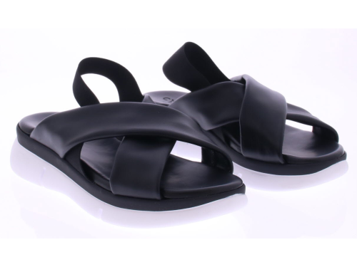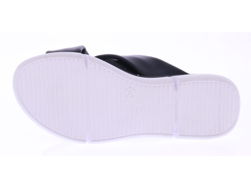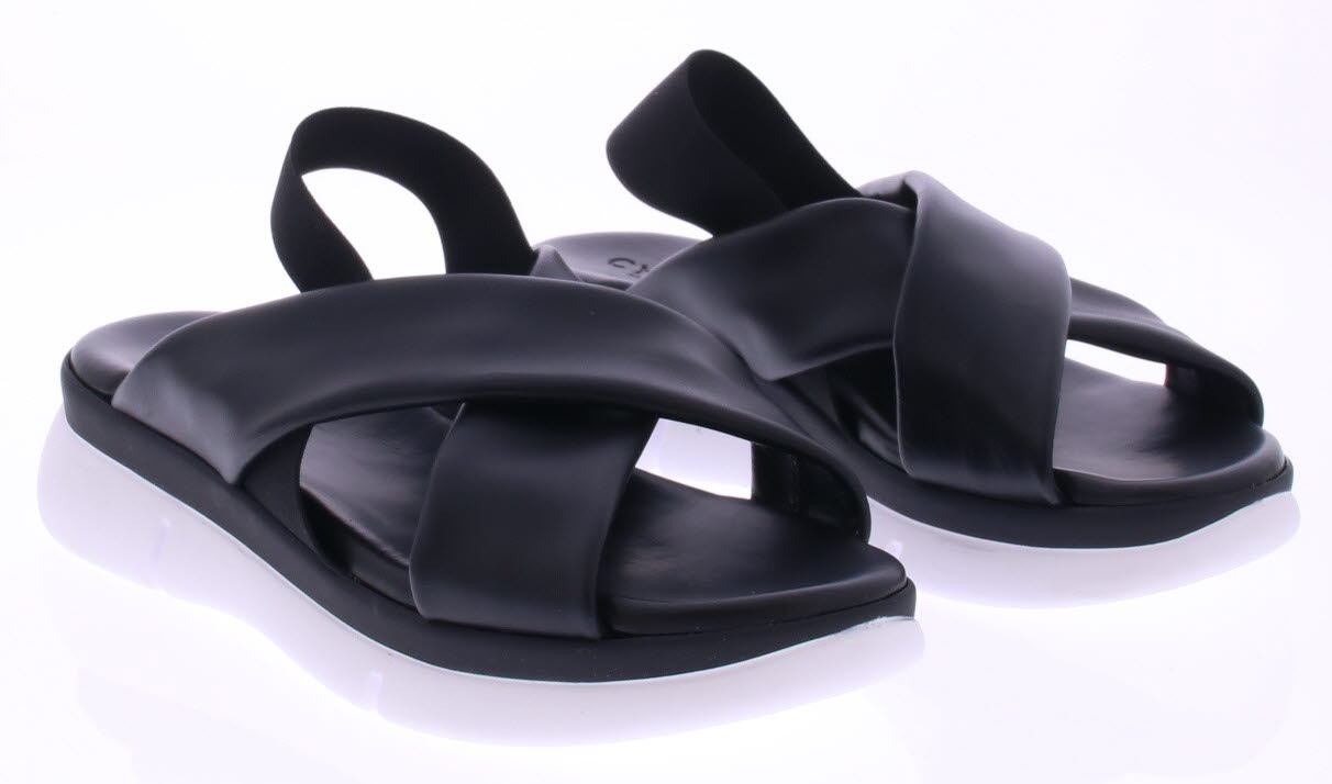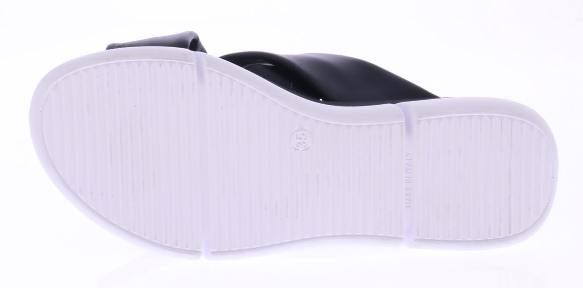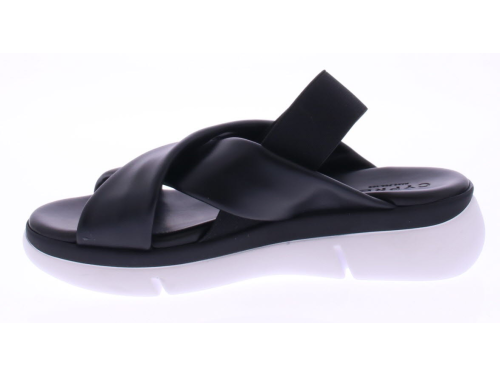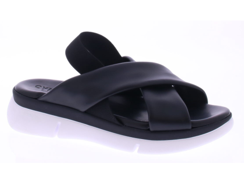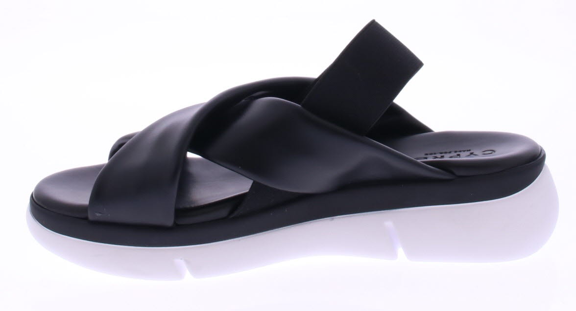 Zwart leren sportieve dames sandaal van Cypres. De sandaal heeft brede leren banden over de voet, een elastiek langs de hiel en een sportieve witte zool.