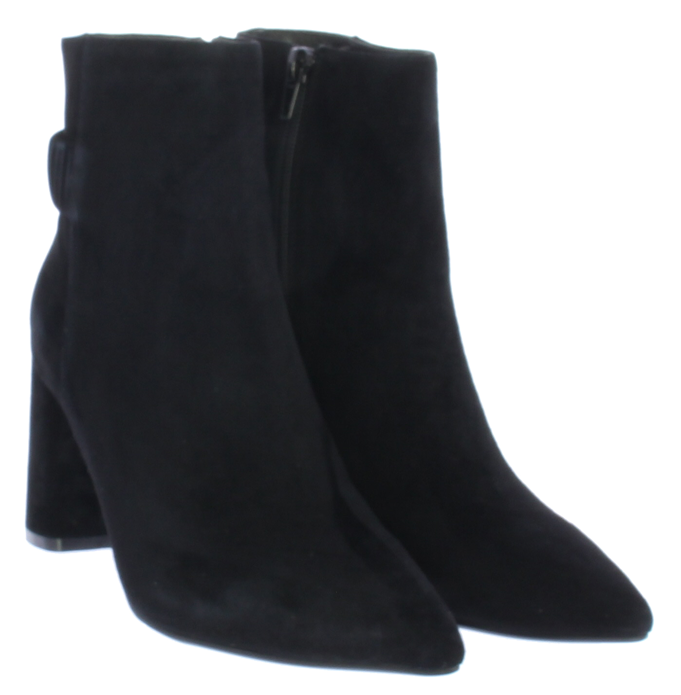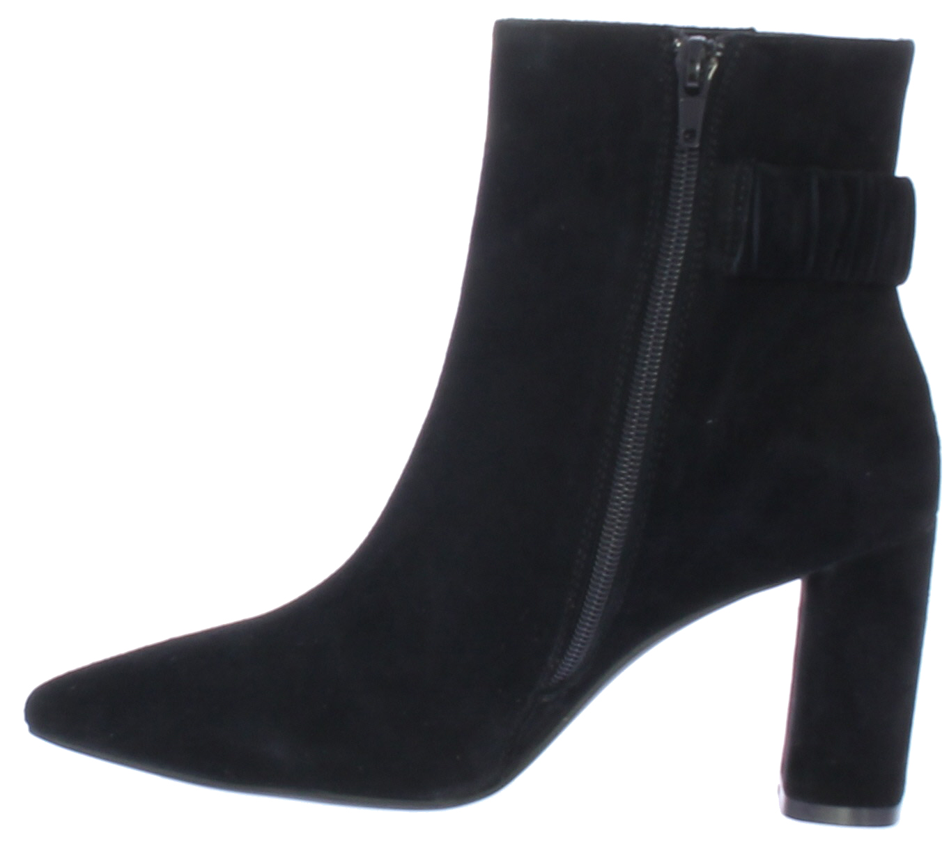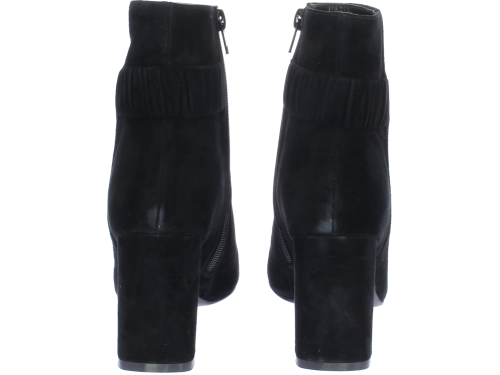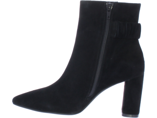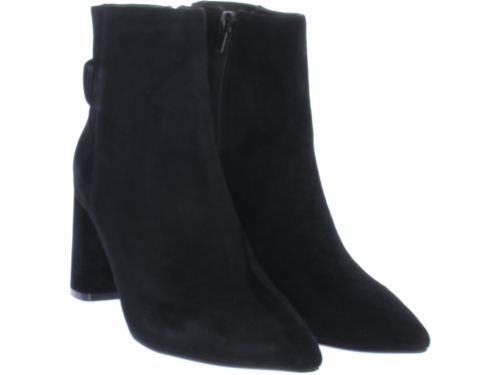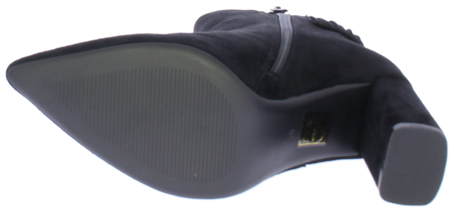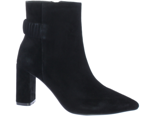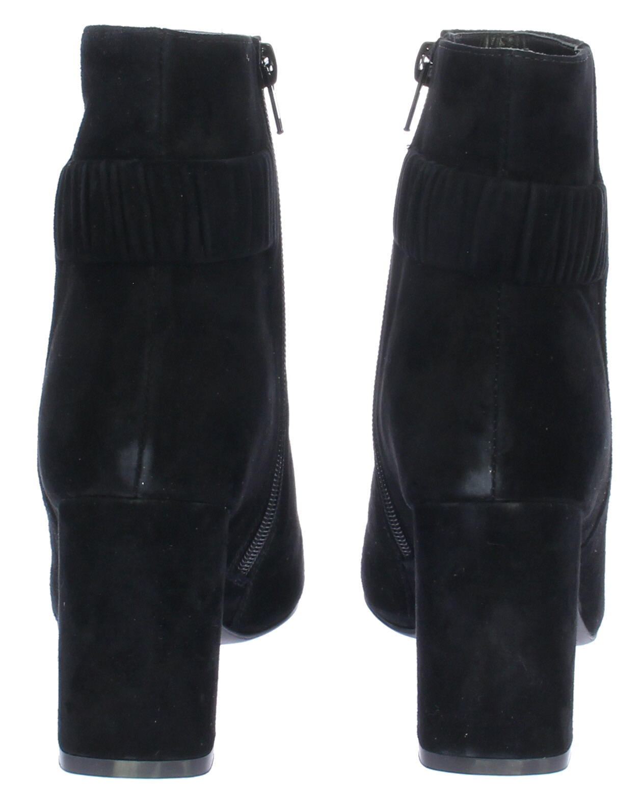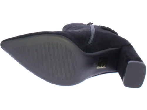 Zwarte suede dames enkellaars van DiLauro. Deze laars komt op een beklede hak van 7cm. Rond de enkel loopt een elastieken garnering. De zool is van rubber.