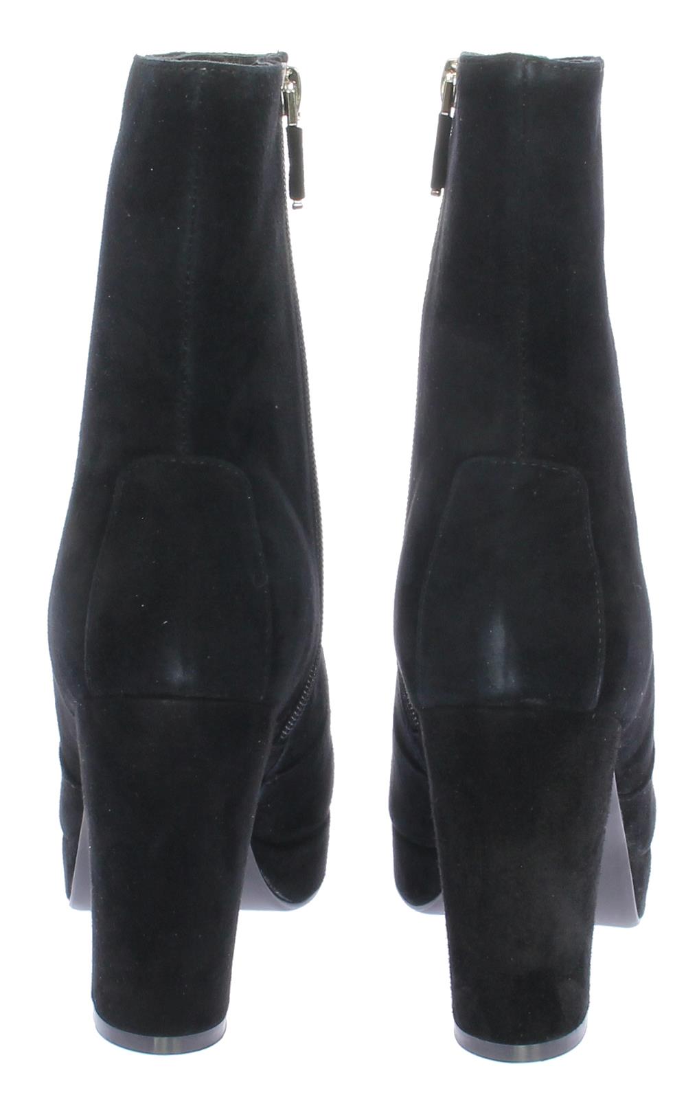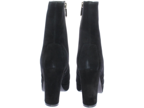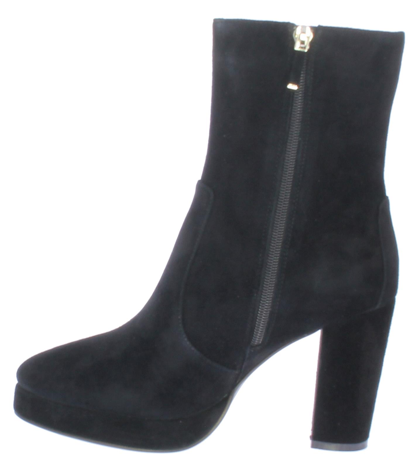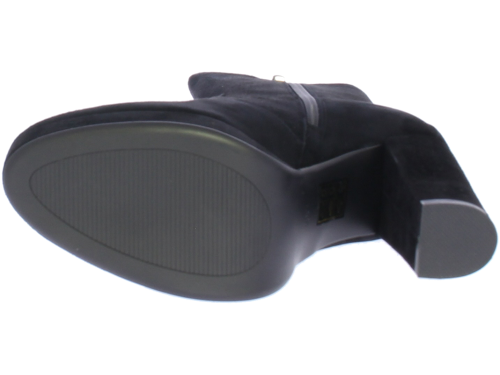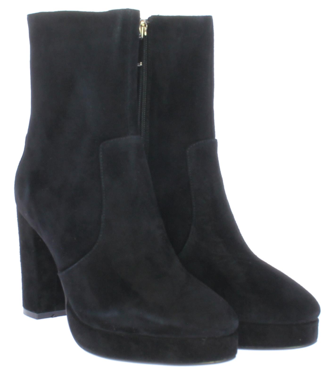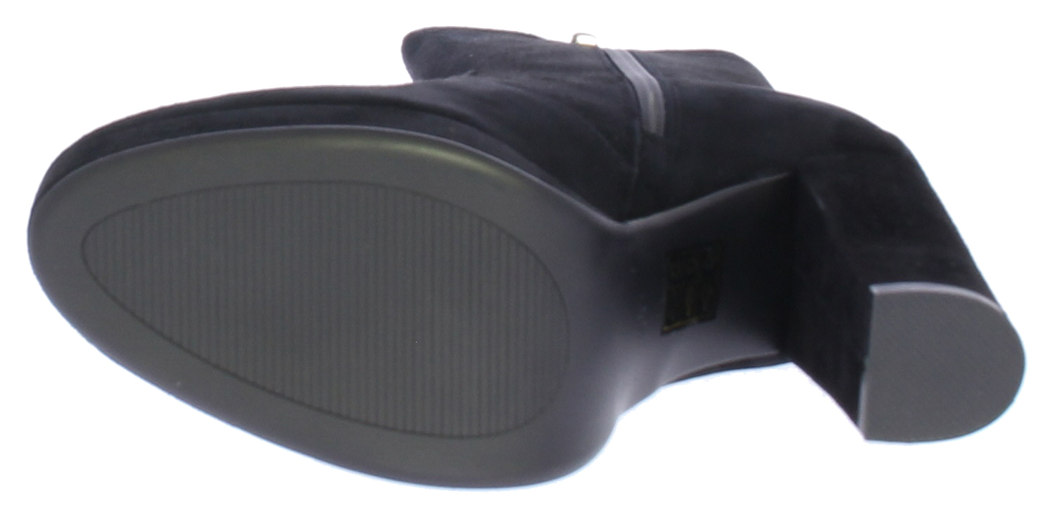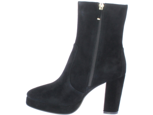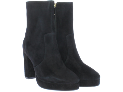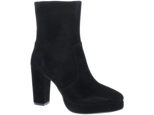 Zwarte suede dames enkellaars van DiLauro. Deze enkellaars komt op een hak van 9cm met plateau. De zool is van rubber en de voering van leer.
