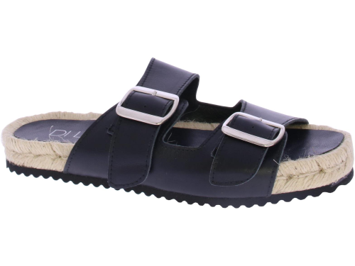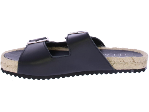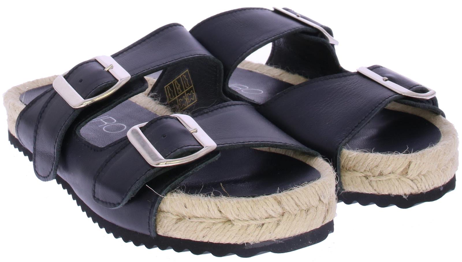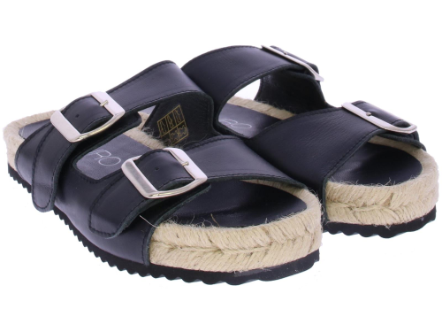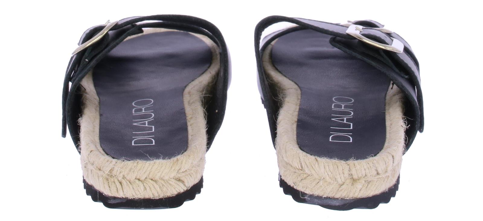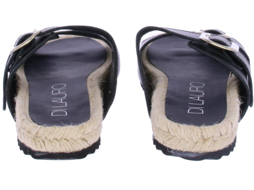 Zwarte leren dames slippper van Di Lauro. Deze slipper is uitgevoerd met 2 zilverkleurige gespen en een leren voering en voetbed. De leuke touwzool is wat hoger voor een modisch effect.