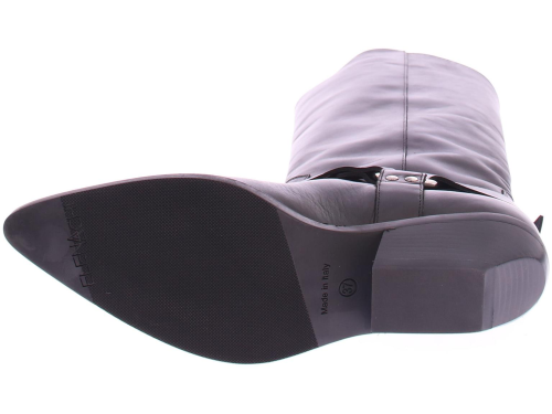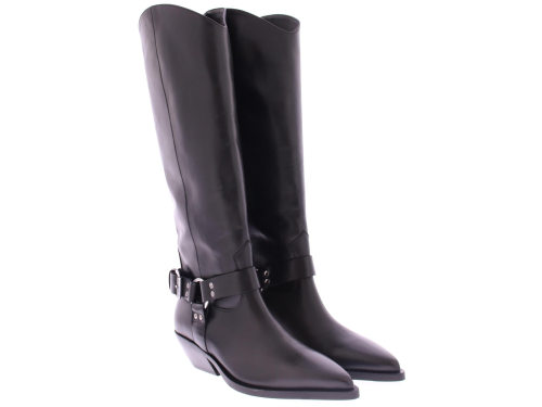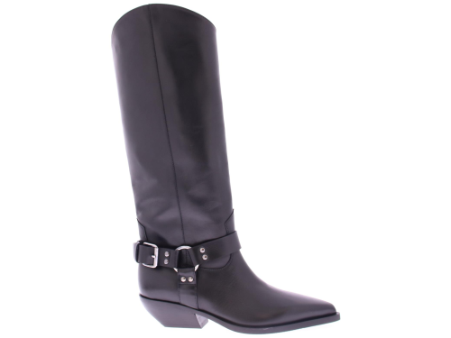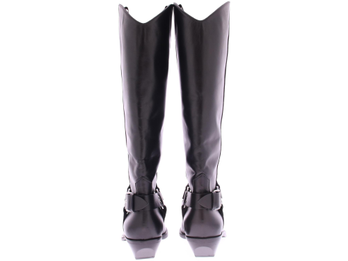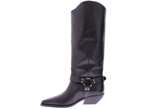 Zwarte leren dames cowboy laars van Elena Iachi. Het laarsje heeft opvallende western-accenten zoals de spitse neus, de handige aantreklus achter op de schacht, de uitsnijdingen in het leer en de stevige, gelaagde westernhak. Het binnenwerk bestaat uit zacht leer met een vast voetbed.