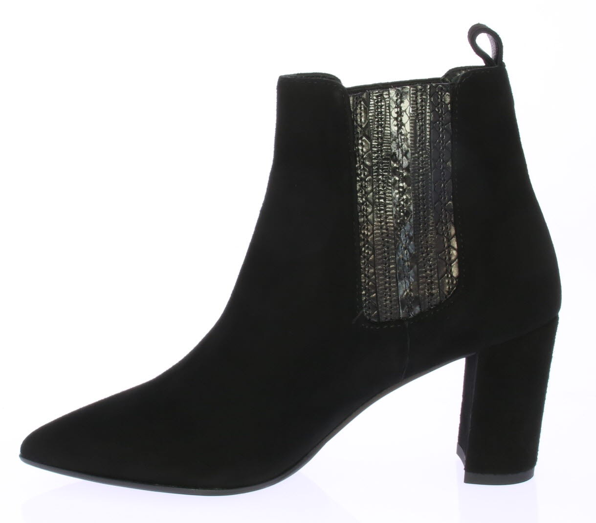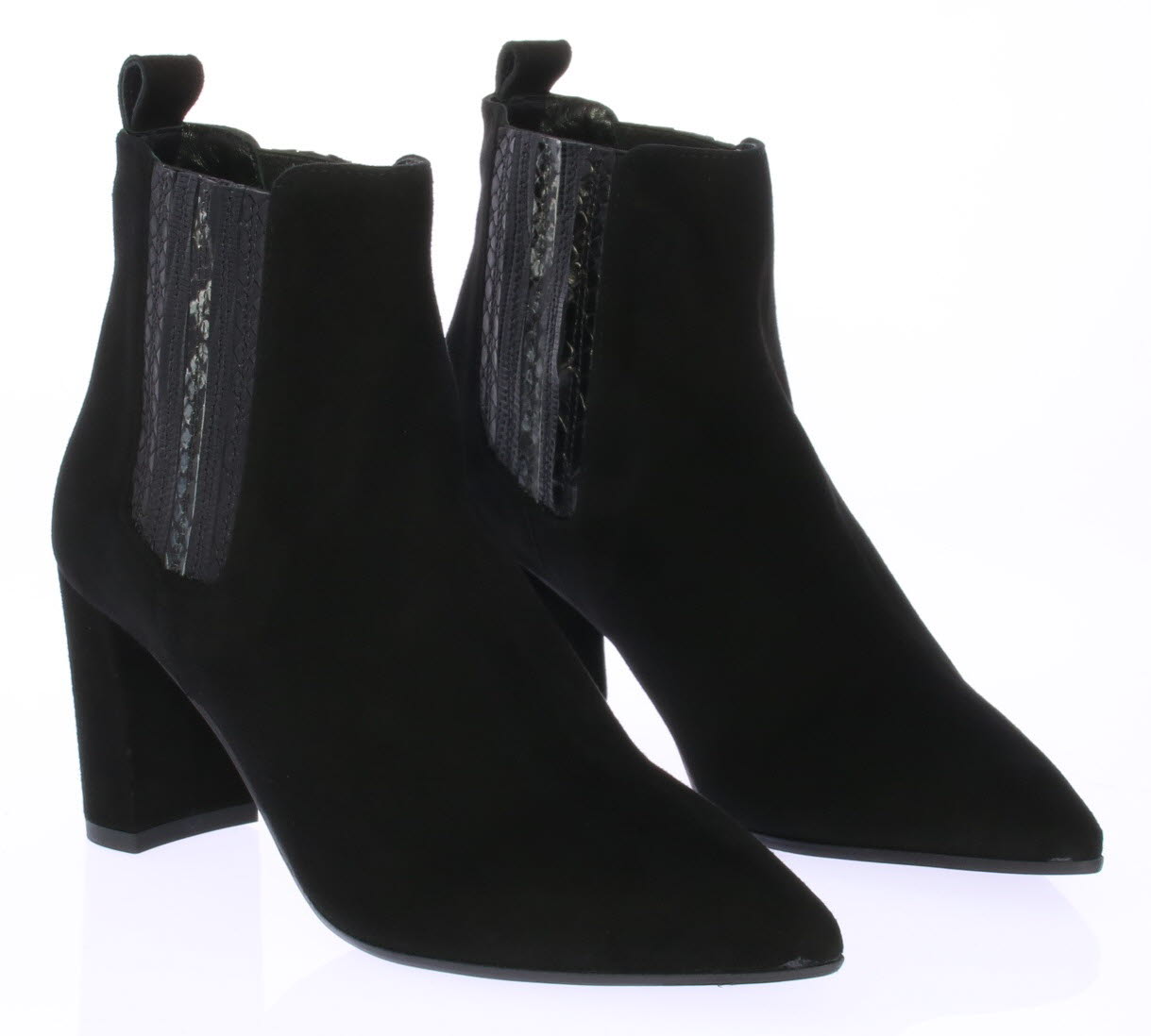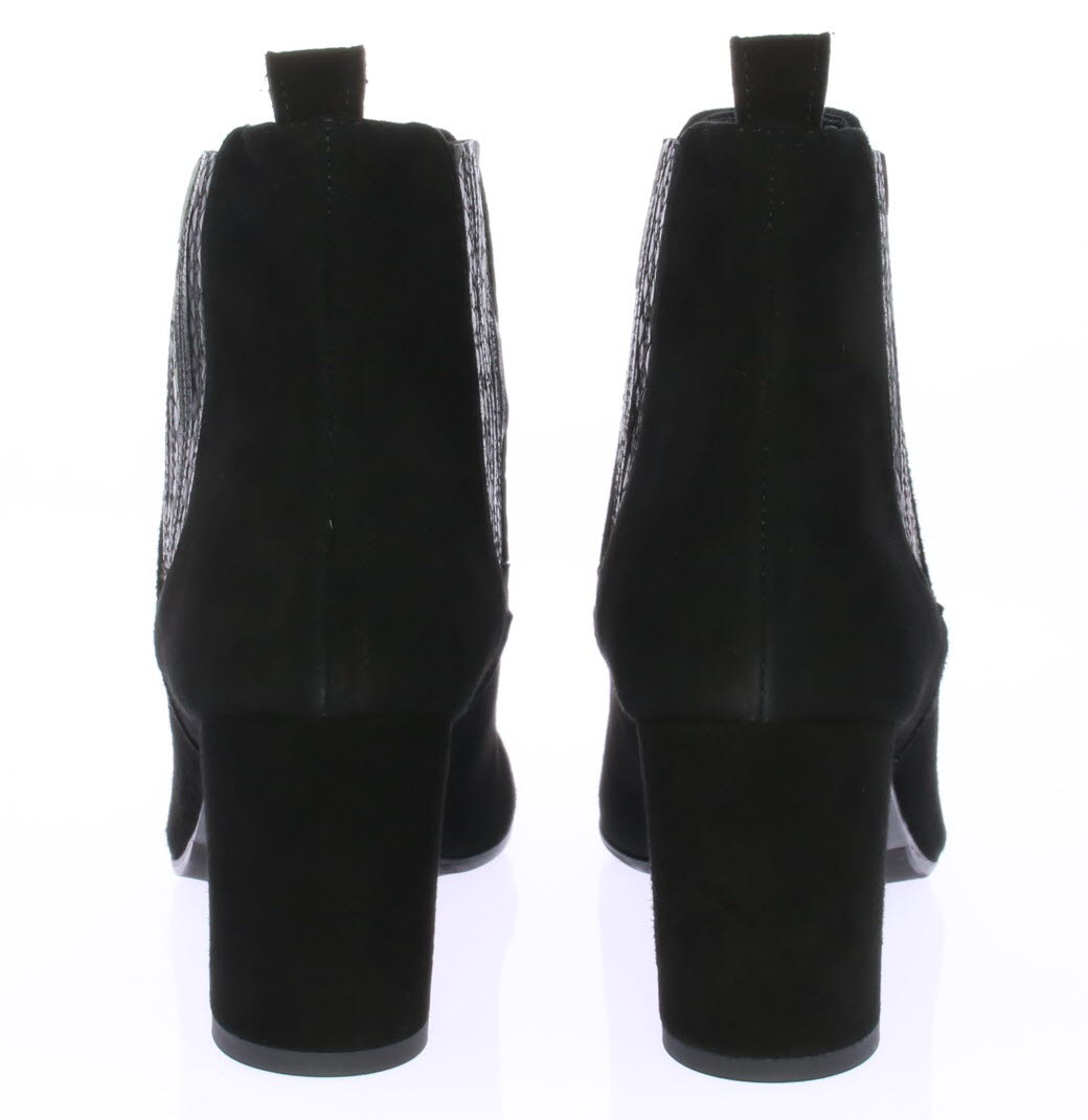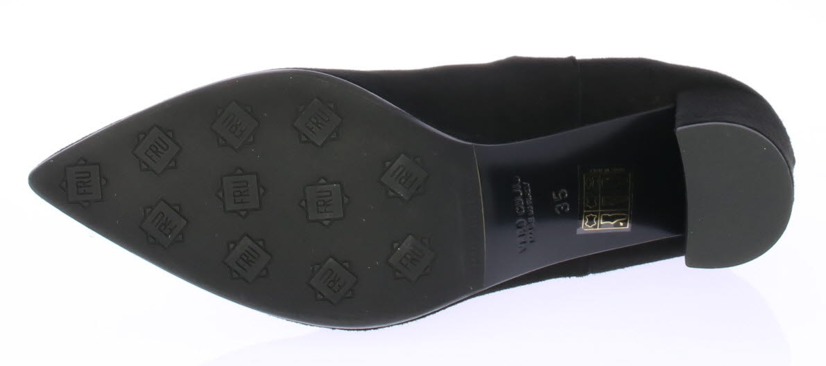 Zwart suede dames enkellaars van FRU. De laars heeft met leer bekleed elastiek aan beide zijde en een 6 cm hoge rechte hak.