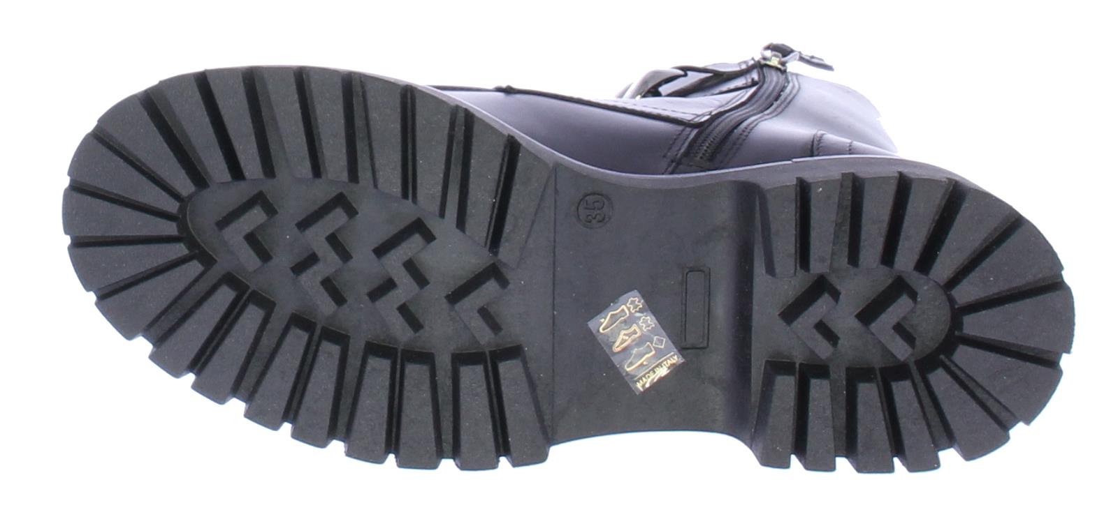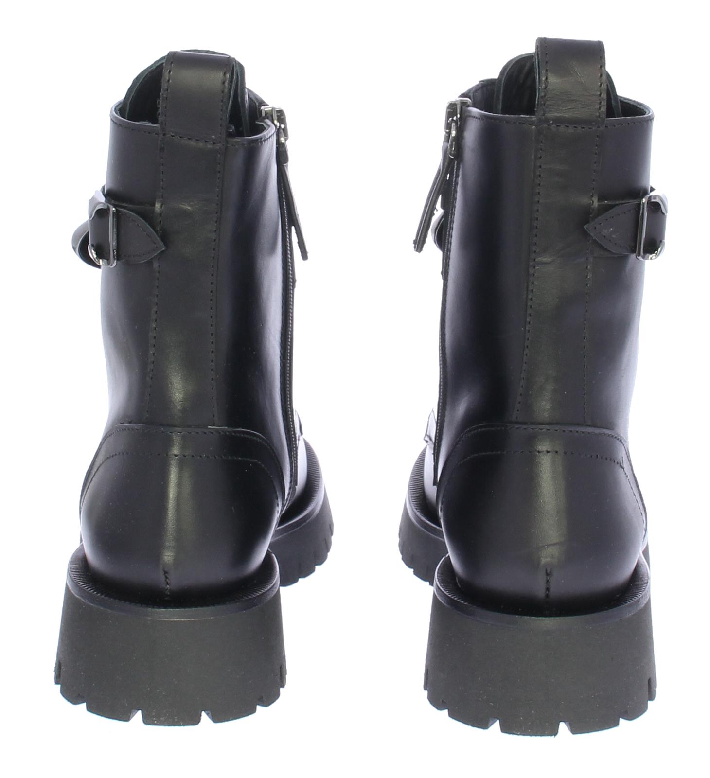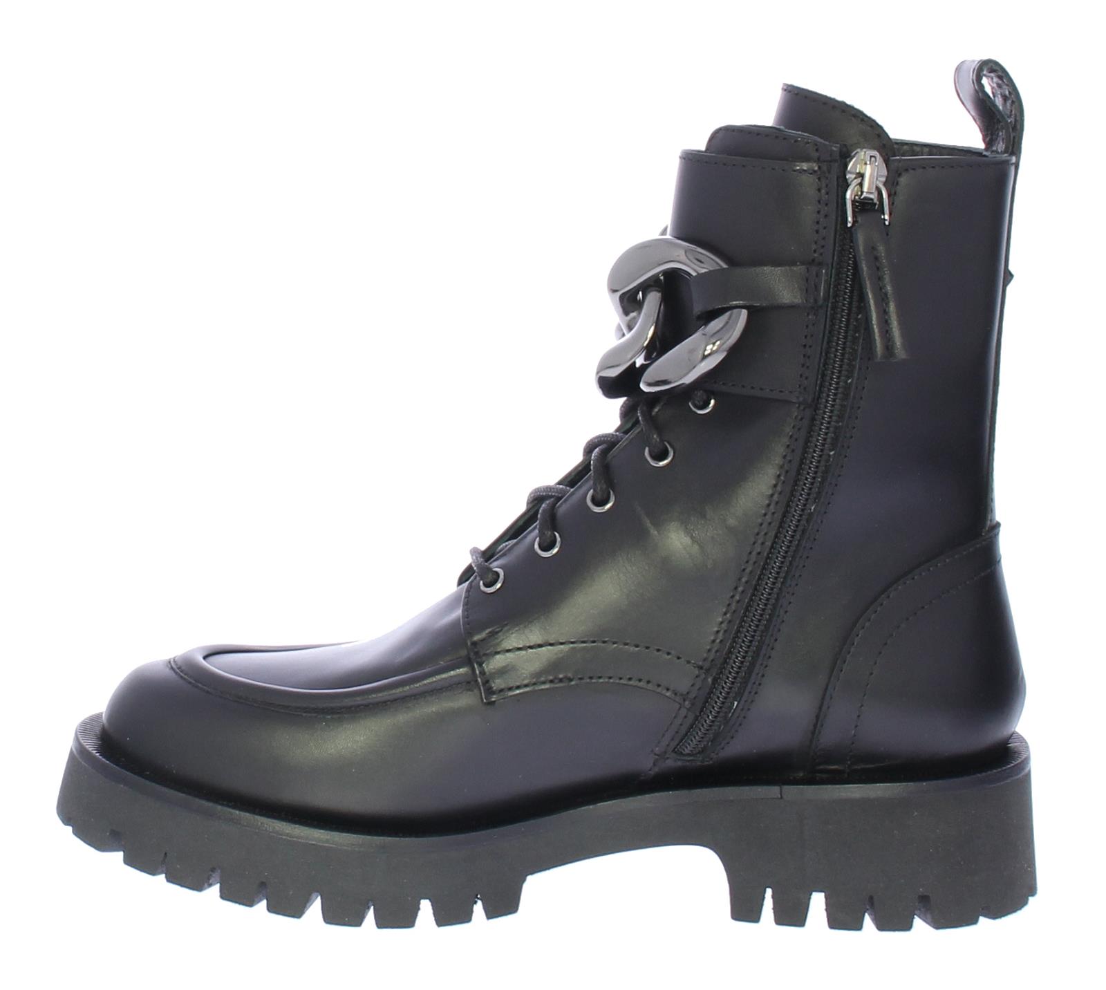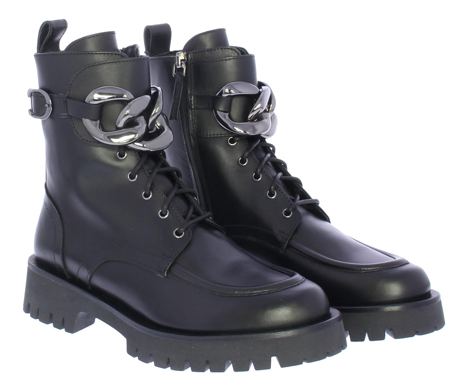 Zwarte leren dames veterlaars van Angelo Bervicato. De laars heeft een sierrand op de neus en is afgewerkt met donker zilverkleurige veterogen met een ketting als detail. De treklus aan de achterzijde en de rits aan de binnenzijde versoepelen het aan- en uittrekken.