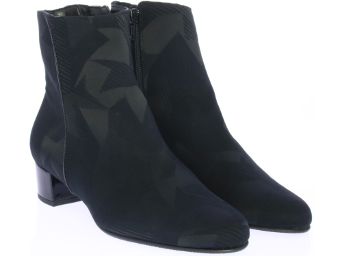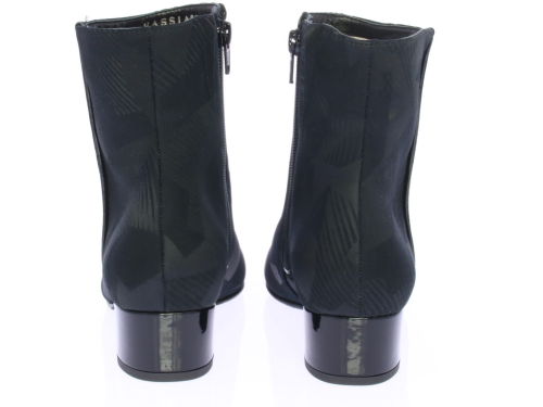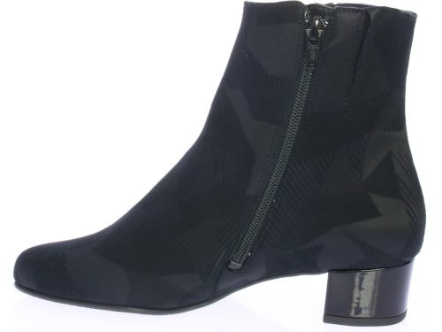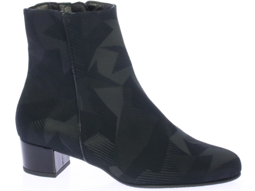 Zwart stoffen dames enkellaars van HASSIA. De laars heeft een all-over grafische print en een 3 cm lak hak. De laars heeft een los uitneembaar voetbed en een wijdte H. De voering is leer en de zool is van rubber.