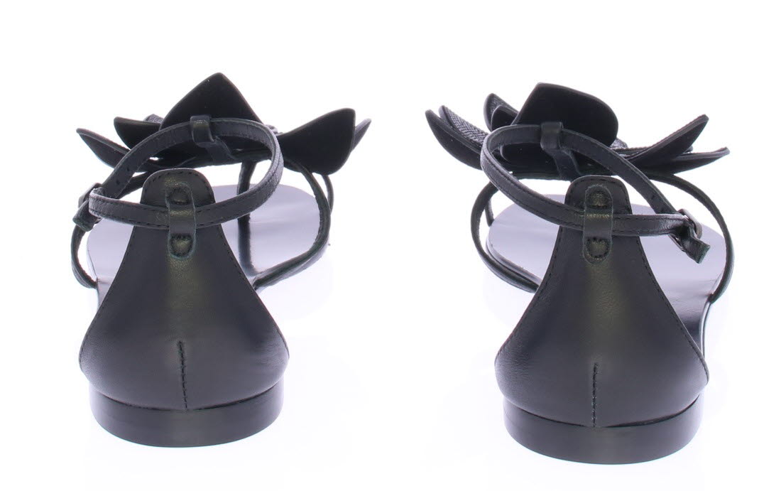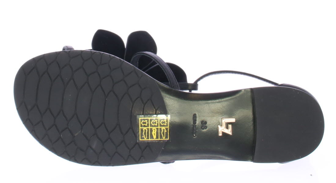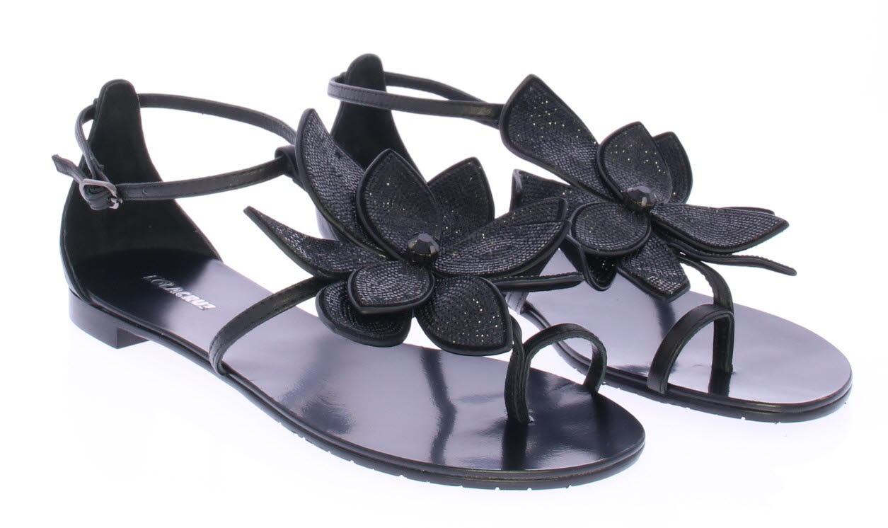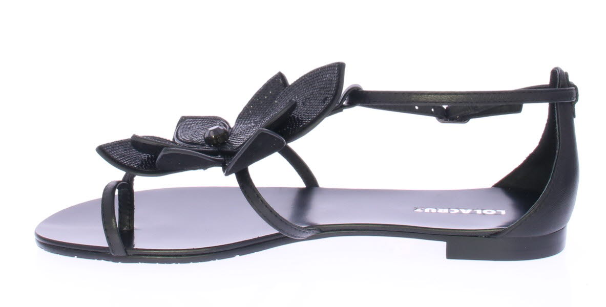 Zwarte leren dames sandaal van Lola Cruz. Met op de wreef sierlijke bloemen met zwarte strassteentjes. Het voetbed en de zool zijn van leer en het hakje is 1 cm hoog.