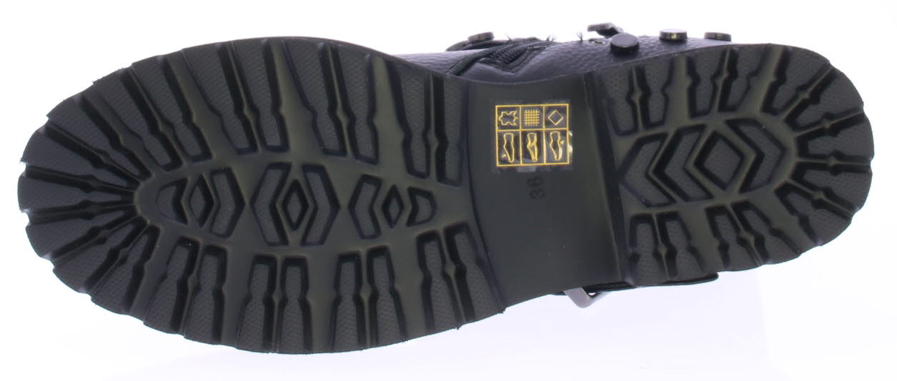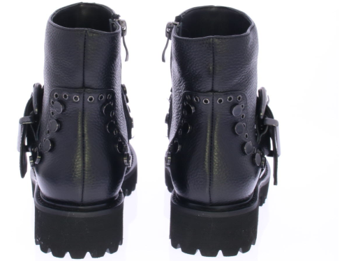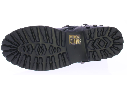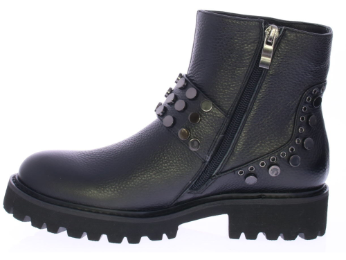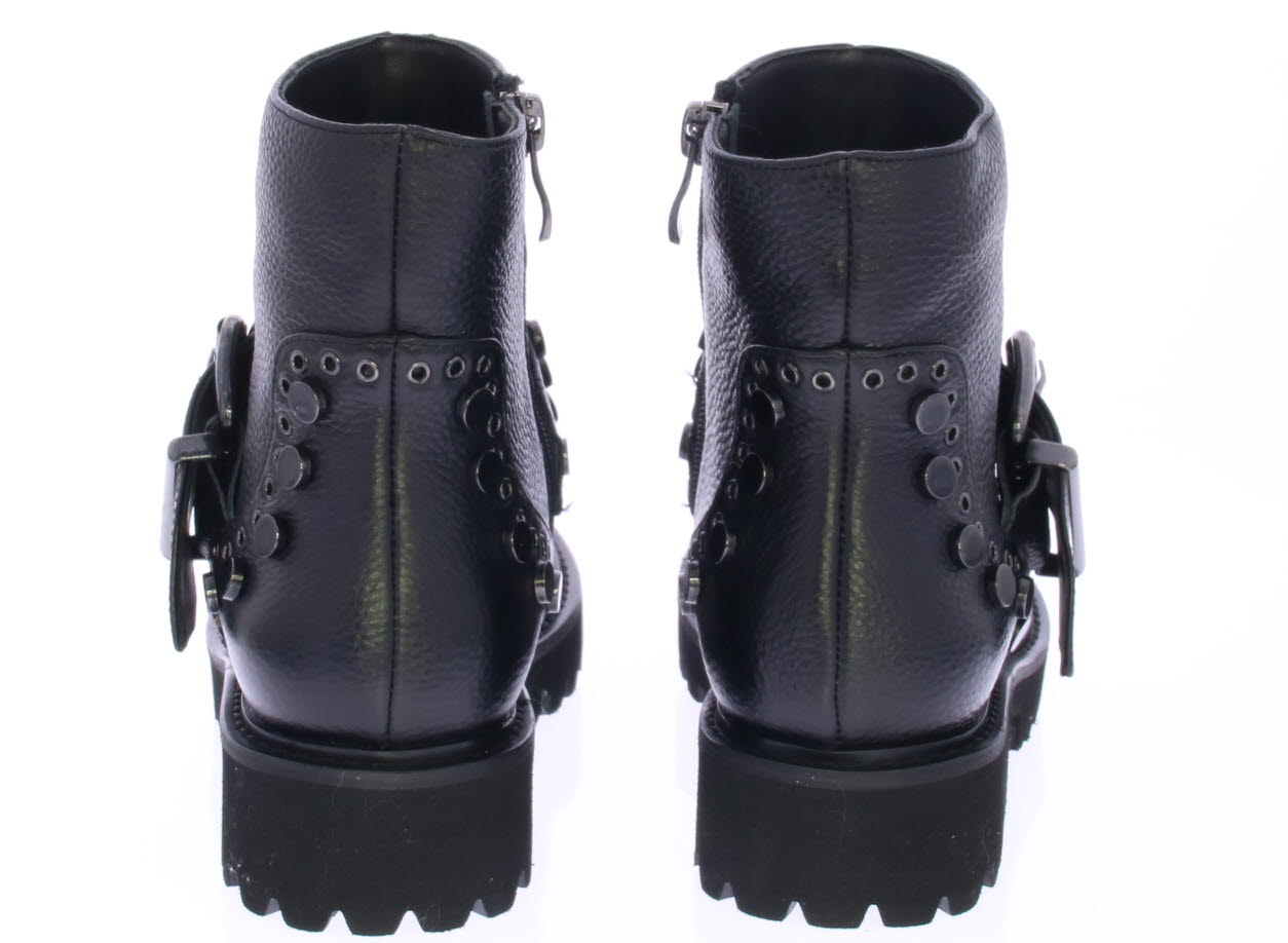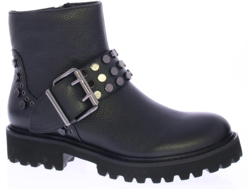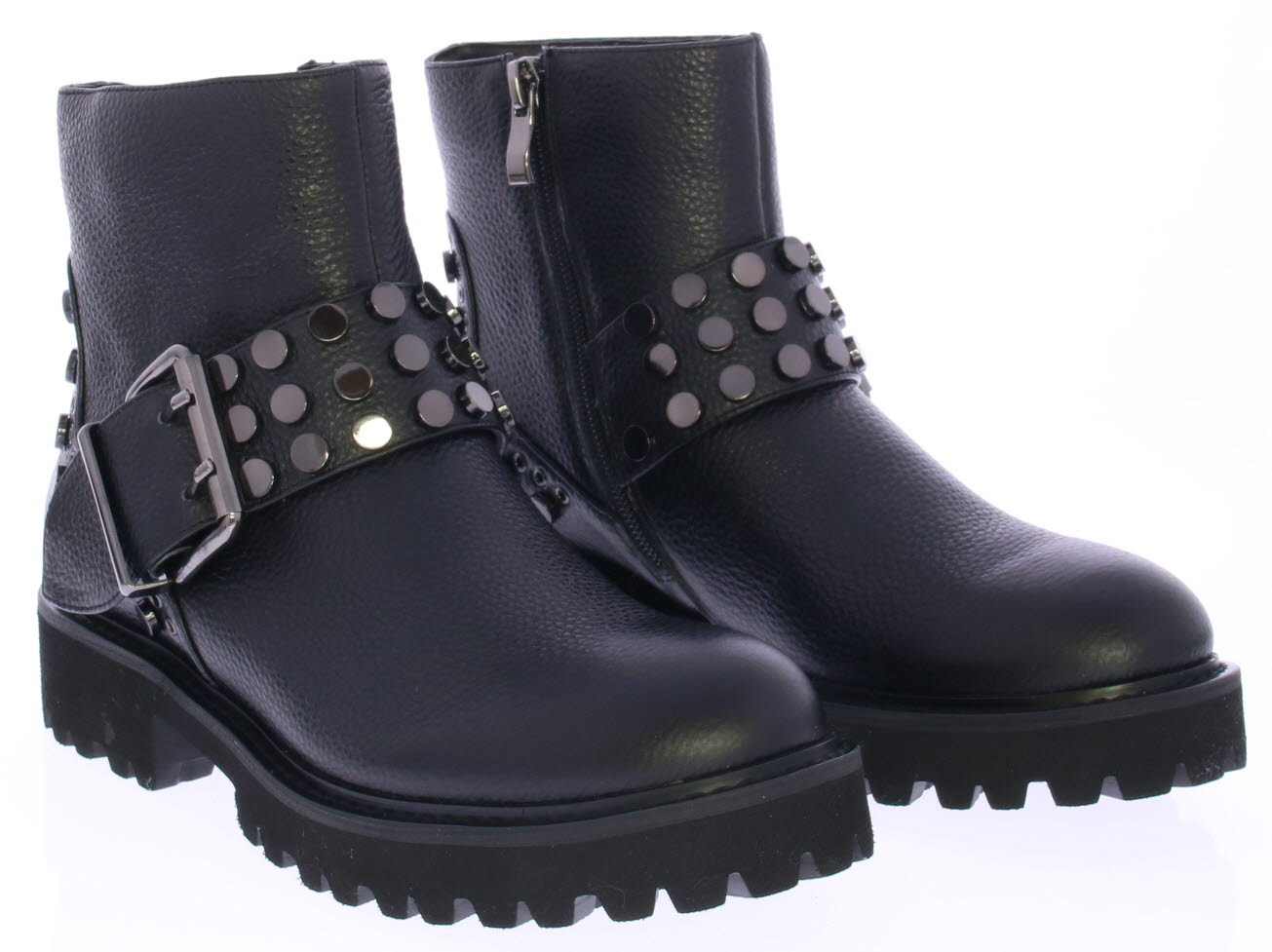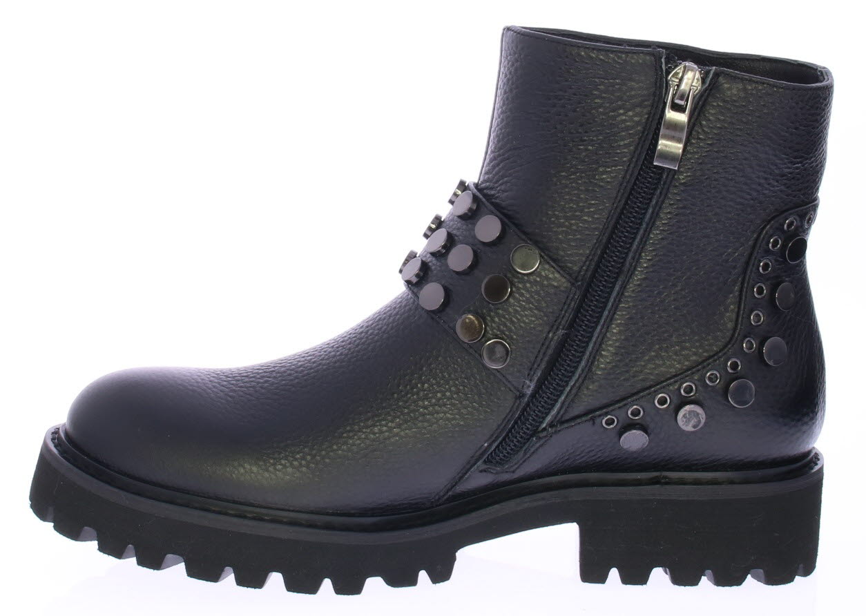 Zwart leren dames enkellaars van MISS Behave. Deze stoere laars heeft een profielzool en is afgewerkt met een stoere gesp over de wreef waarop studs verwerkt zijn.