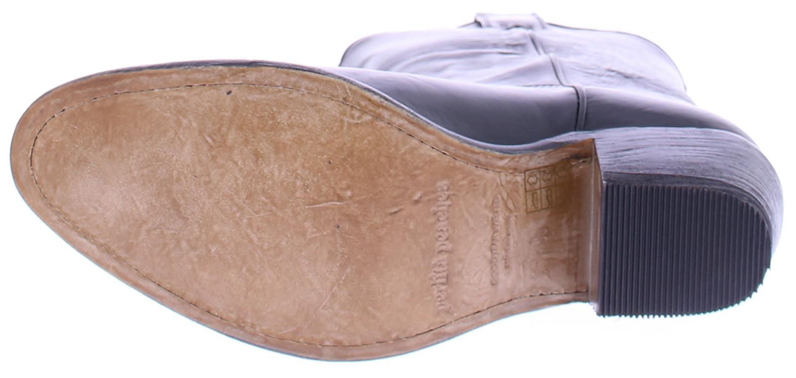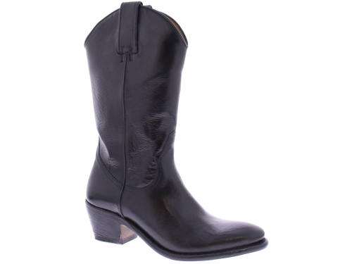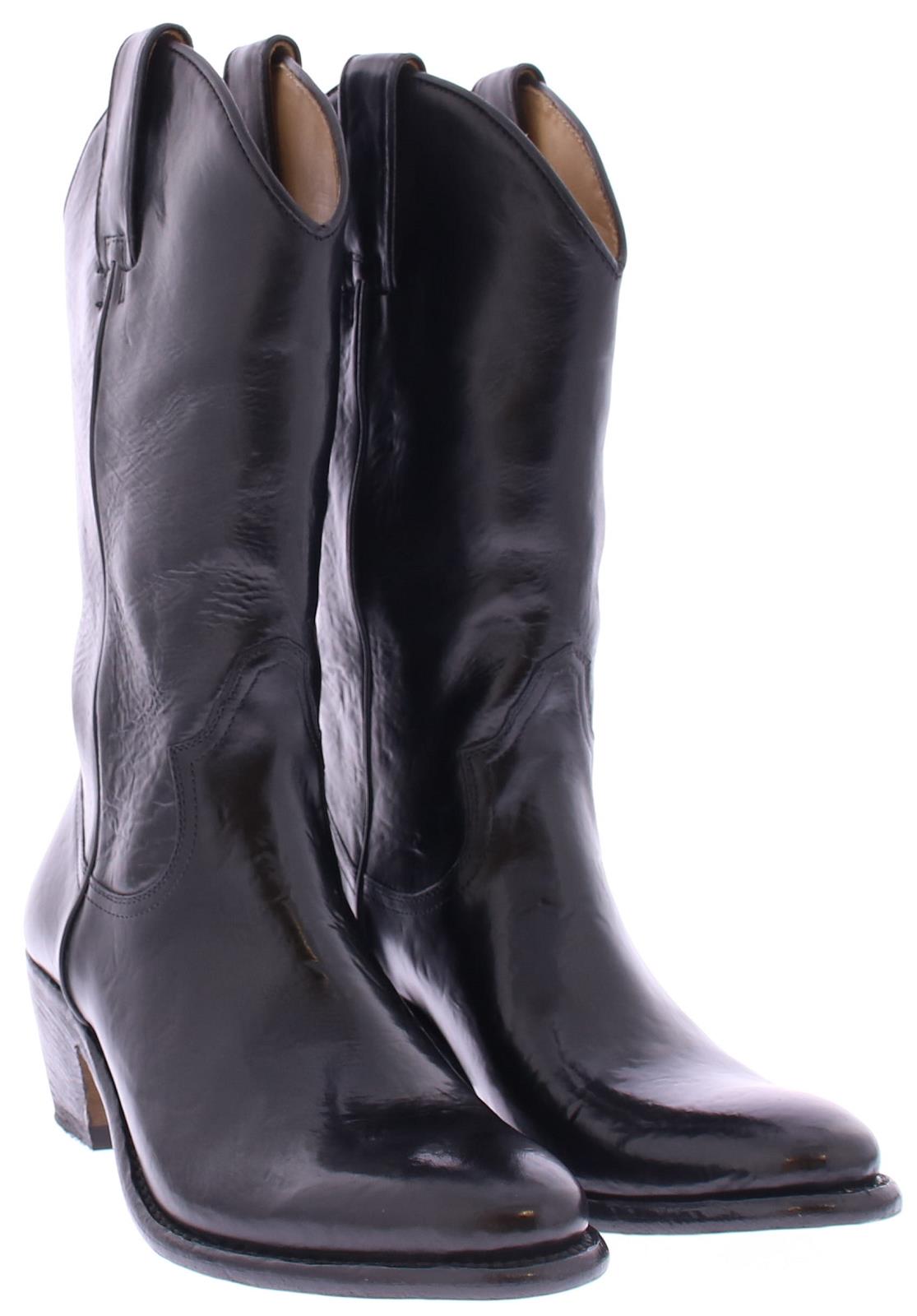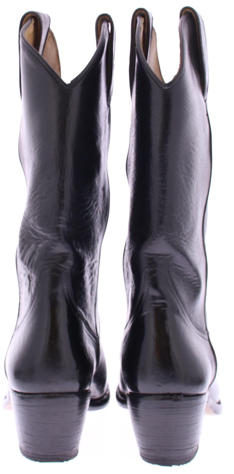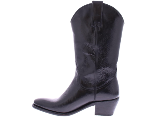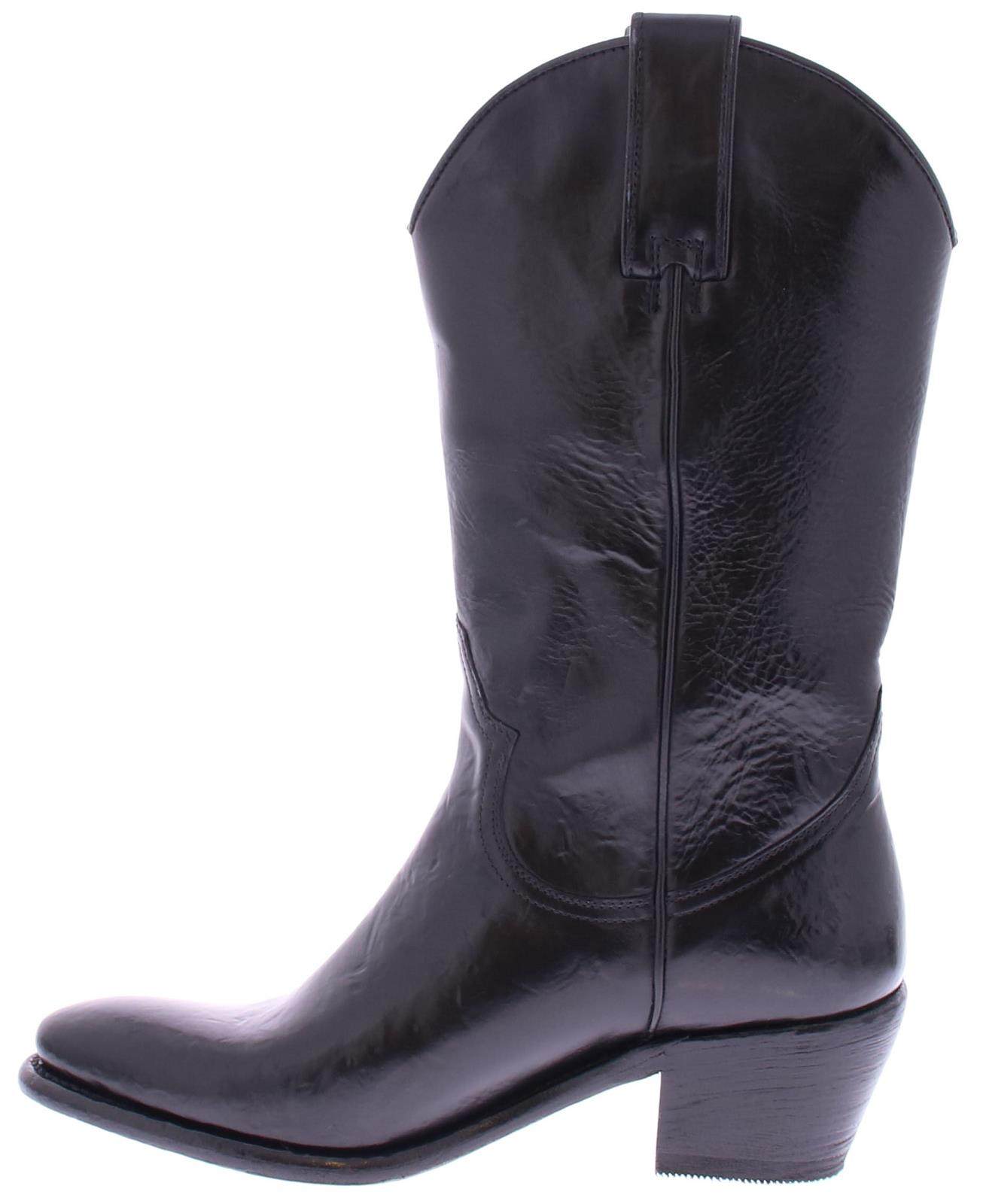 Zwarte leren driekwart dames laars van Perlita. Luxe, rustig uitgevoerde city western laars op een ovale leest met een schuine 5 cm hak. Ze vallen wat ruimer.