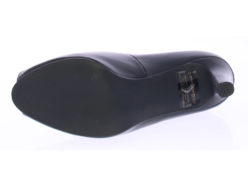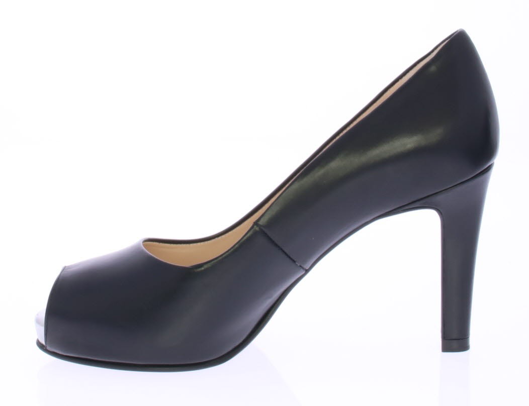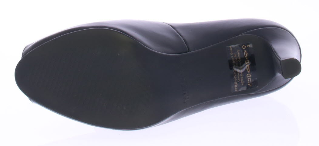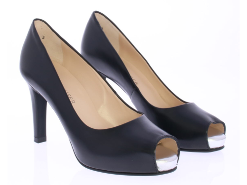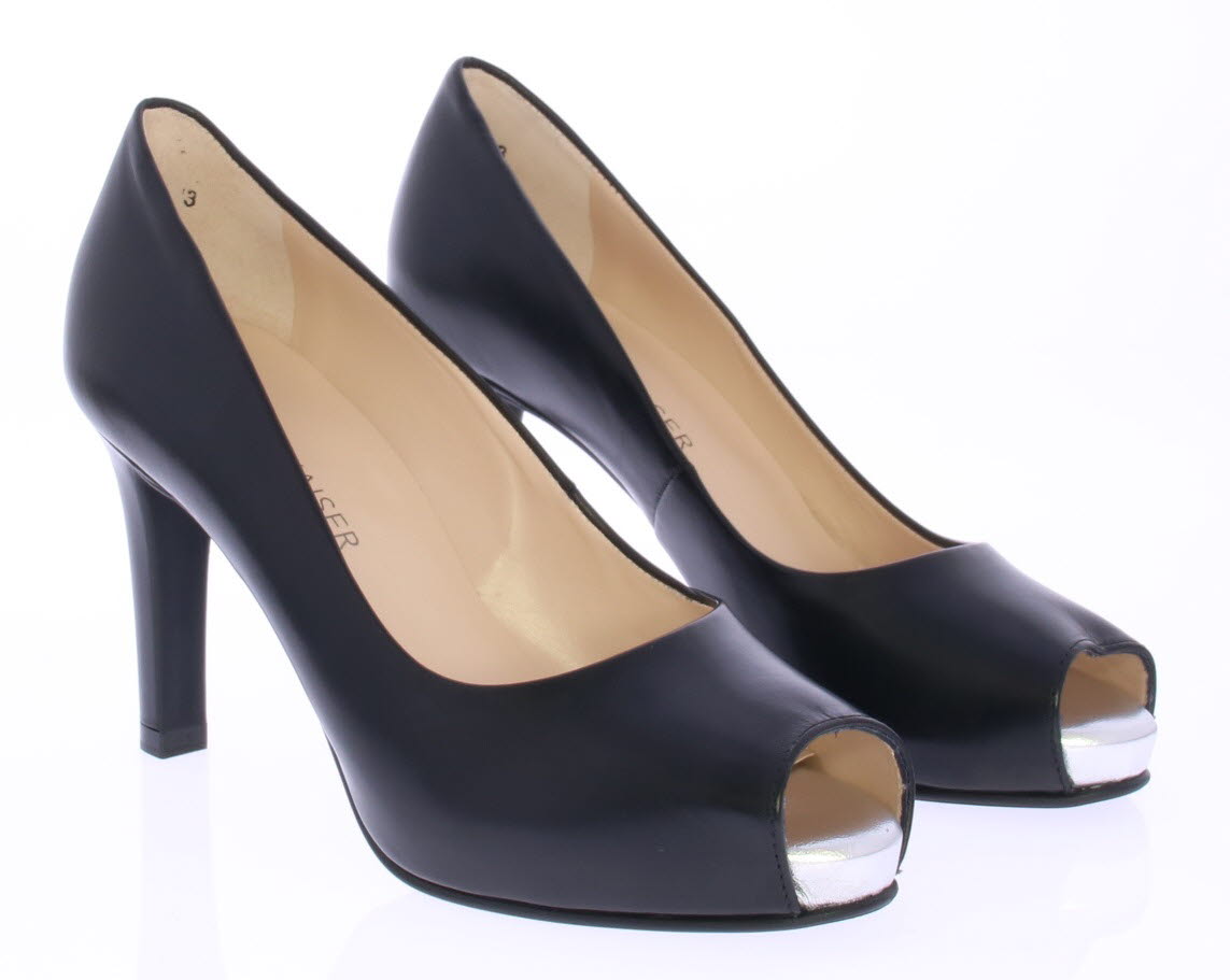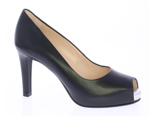 Zwart leren peeptoe pump van Peter Kaiser. De pump heeft een onzichtbare plateauzool. Voorin in het teengedeelte zit platina leer. De hak is 9.5 cm hoog maar voelt lager door de plateauzool.