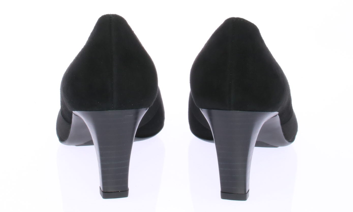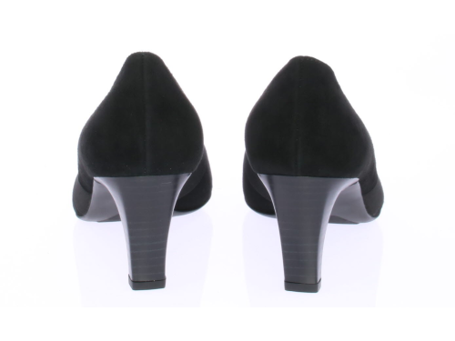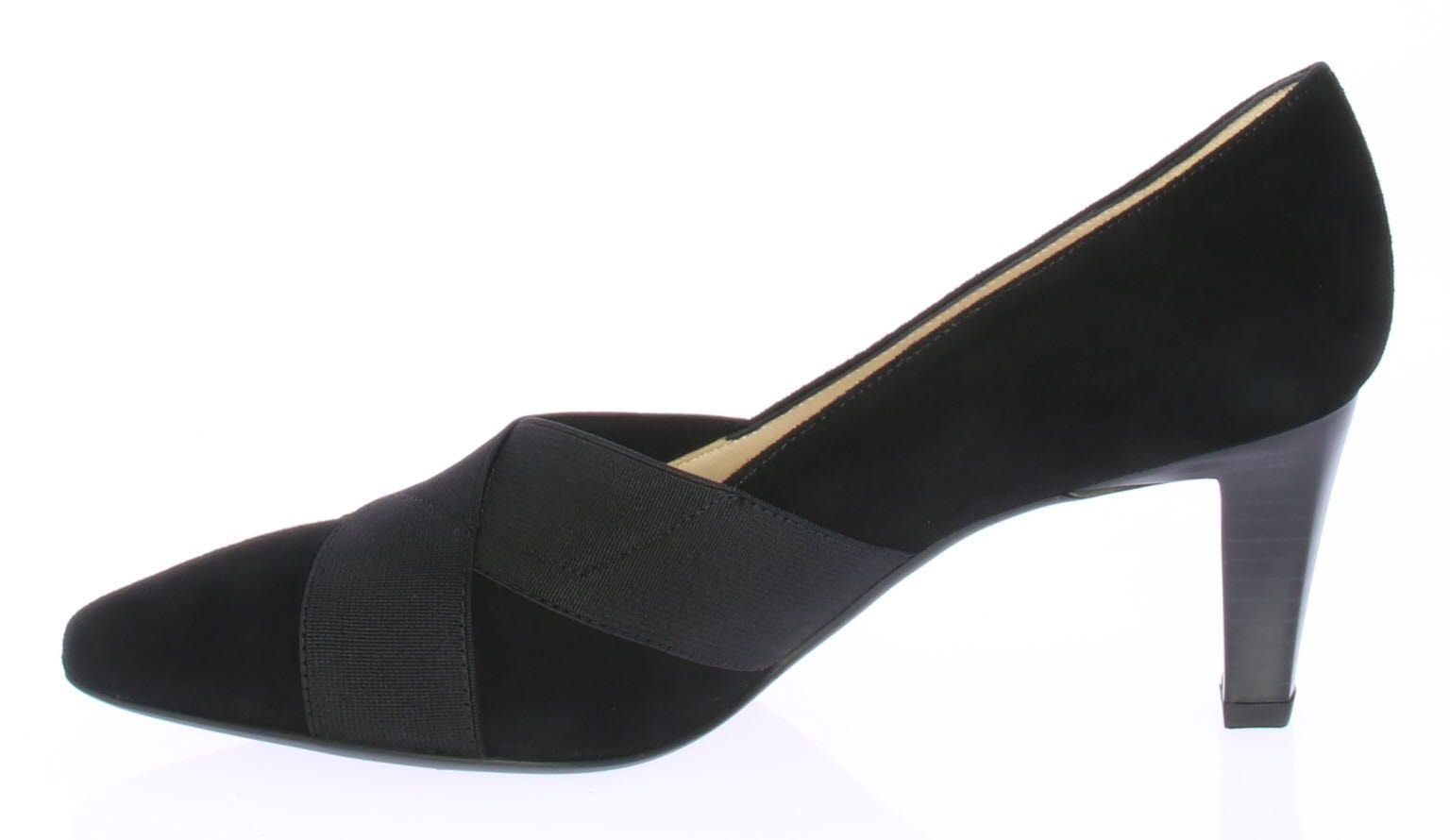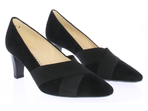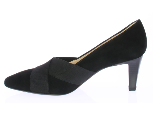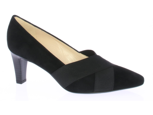 Zwart suede dames pump van Peter Kaiser. De pump sluit iets hoger op de voet door de elastieken kruisband. De hak is 6 cm hoog en hij is gemaakt op een mooie elegante wat spitsere leest.