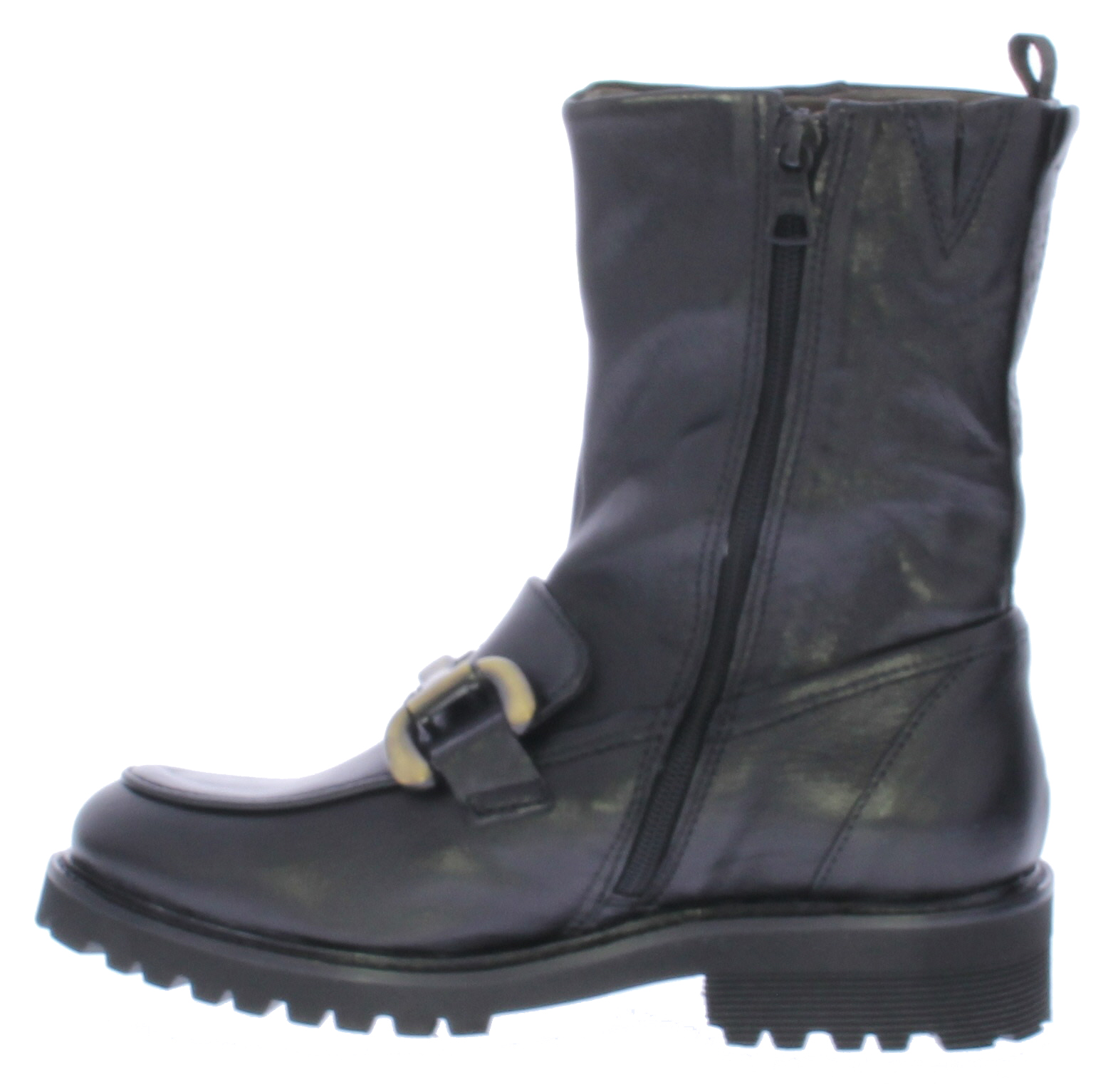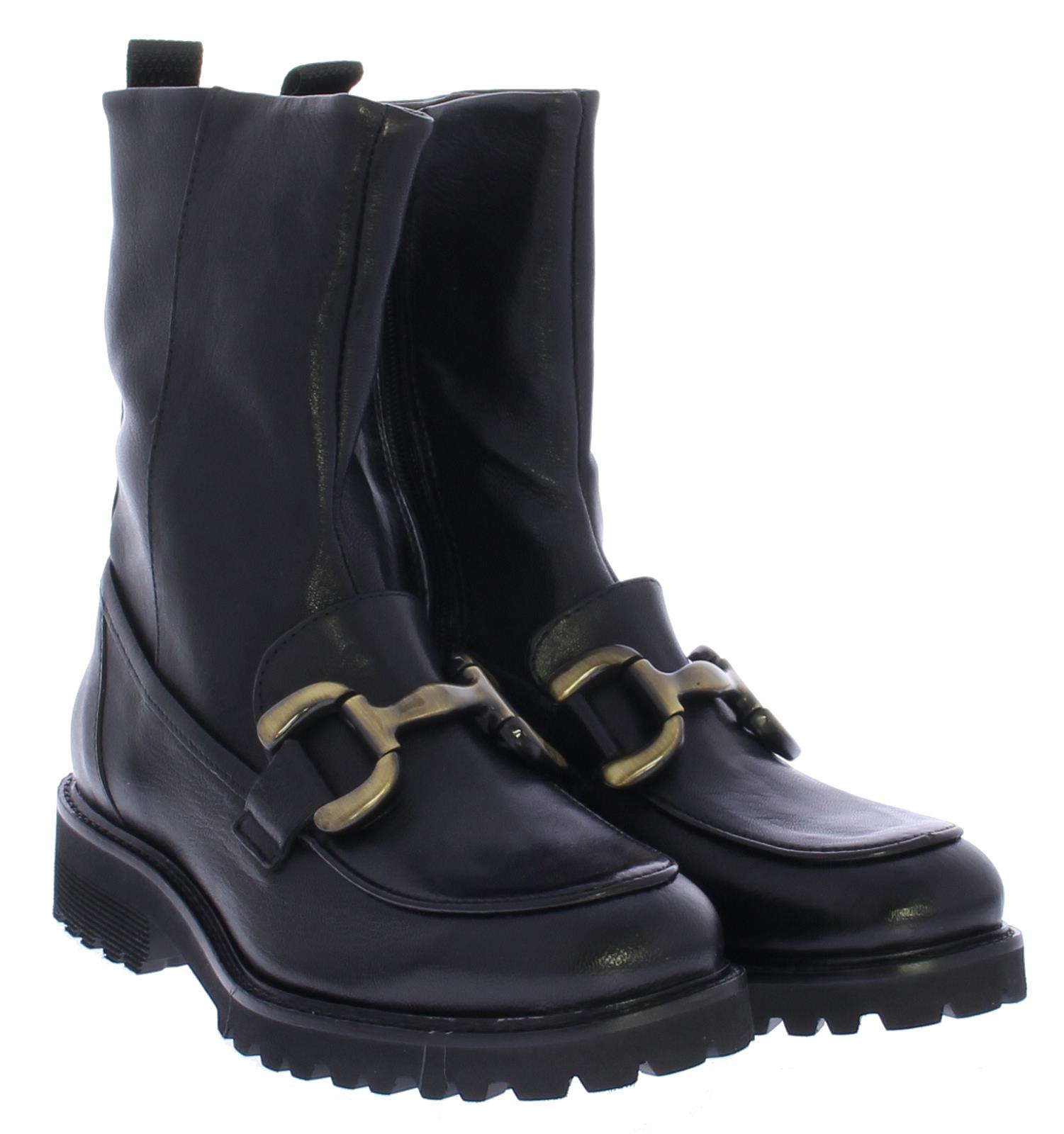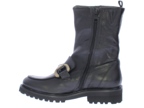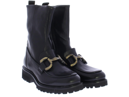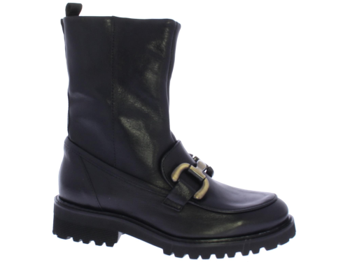 Zwarte leren dames enkellaars van Piedi Nudi. Deze laars heeft een bronzen bit over de wreef lopen. De laars heeft een treklus voor een gemakkelijke instap en het voetbed is uitneembaar.
