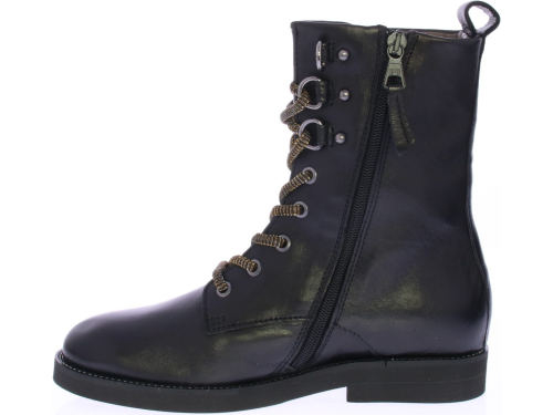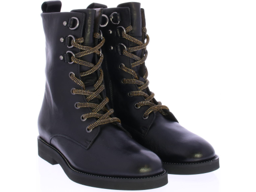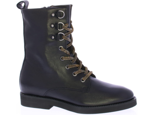 Zwart leren dames enkellaars van Piedi Nudi. De laars heeft een gouden/bronzen veter, in de doos wordt ook een zwarte veter meegeleverd. Aan de zijkant van de enkellaars zit een rits voor een gemakkelijke instap en de binnenzool is uitneembaar.