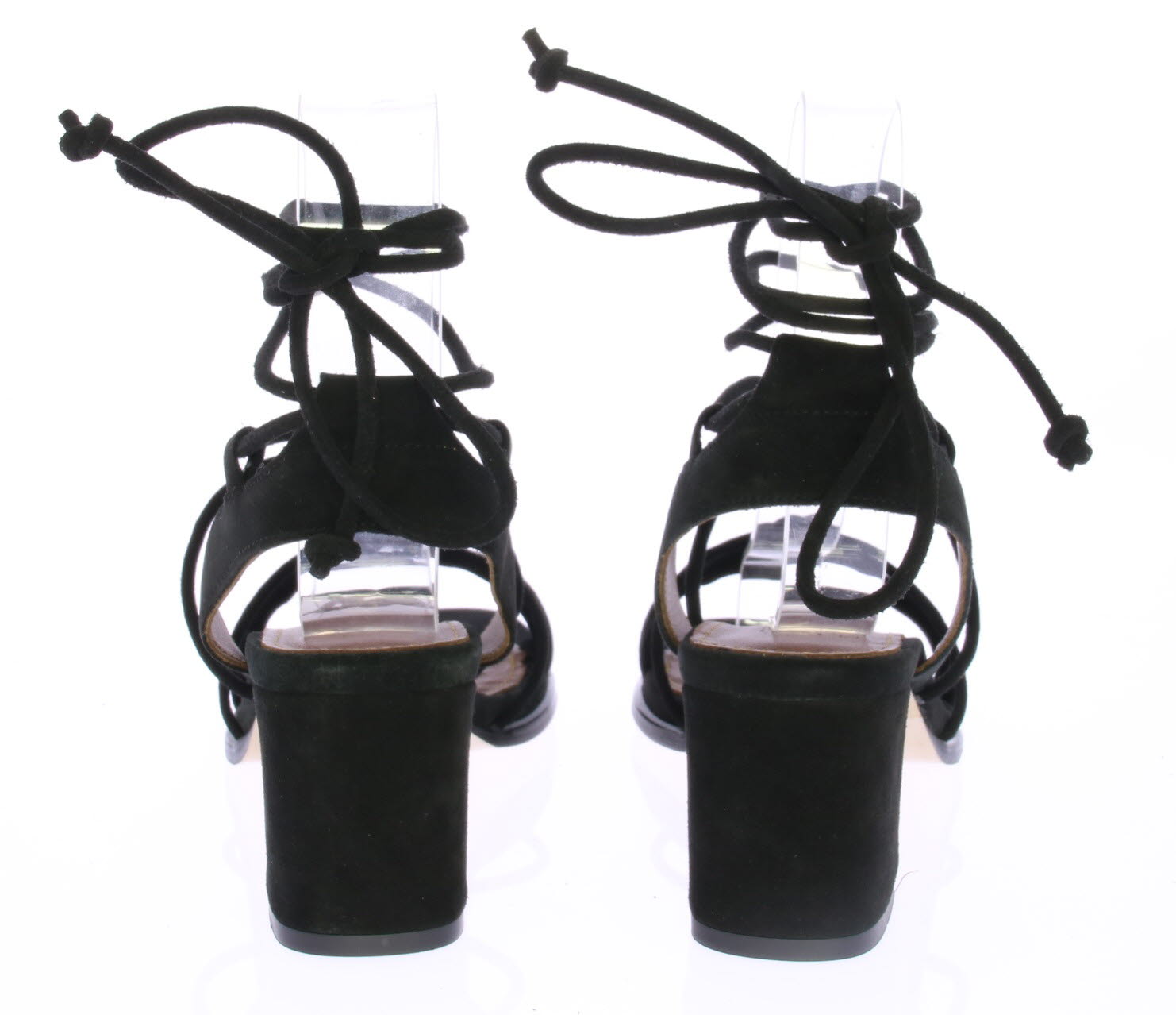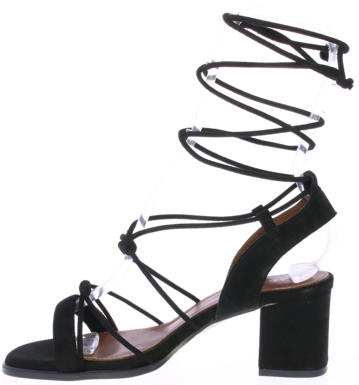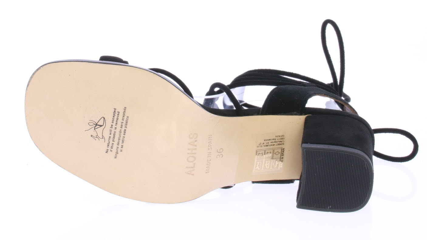 Zwarte suede dames bandjessandaal van Alohas. Over de voorvoet en de hiel zit een bredere band voor een goede pasvorm. De fijnere suede veterbandjes knoop je rond de enkel voor een vrouwelijk en nonchalant effect. De blokhak is 5 cm hoog.