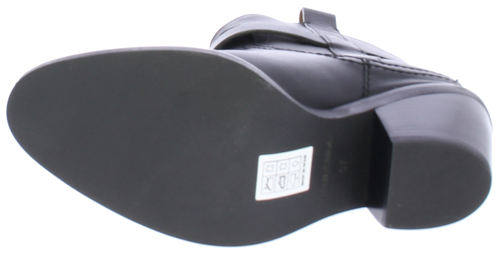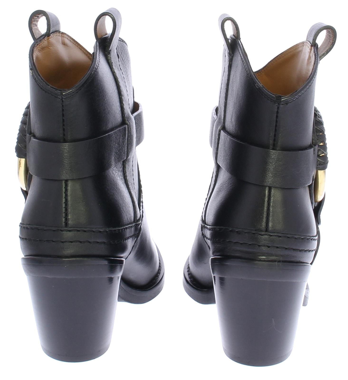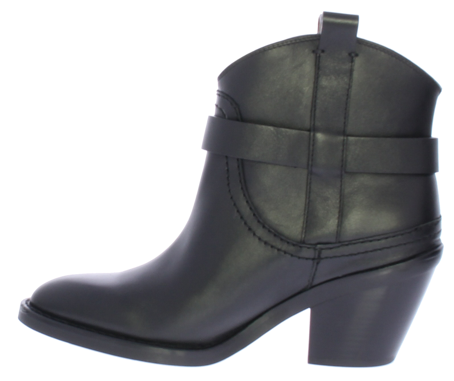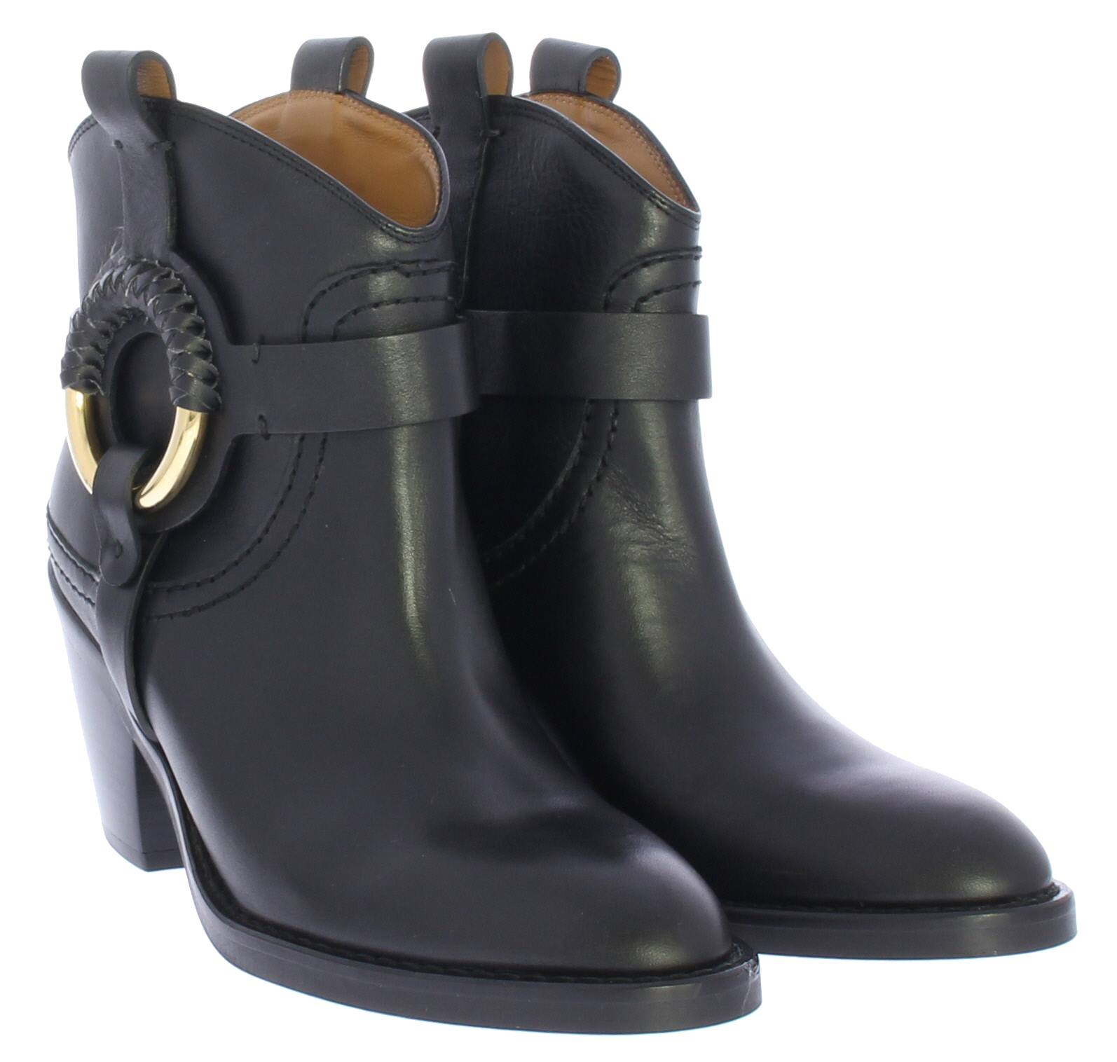Zwart kort leren western dames laarsje van See By Chloe. Heeft een rechte schacht zonder rits. Aan de zijkant een goudkleurige ring. De hak is 6 cm hoog.