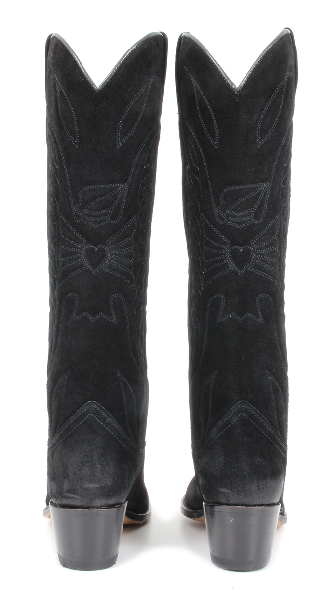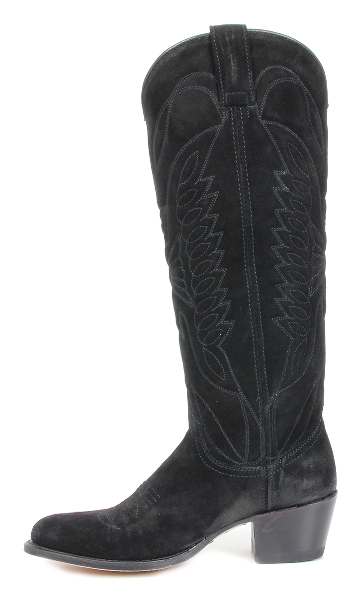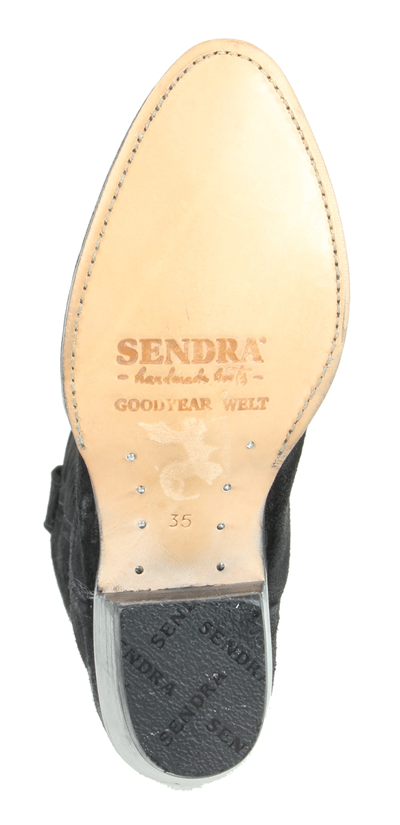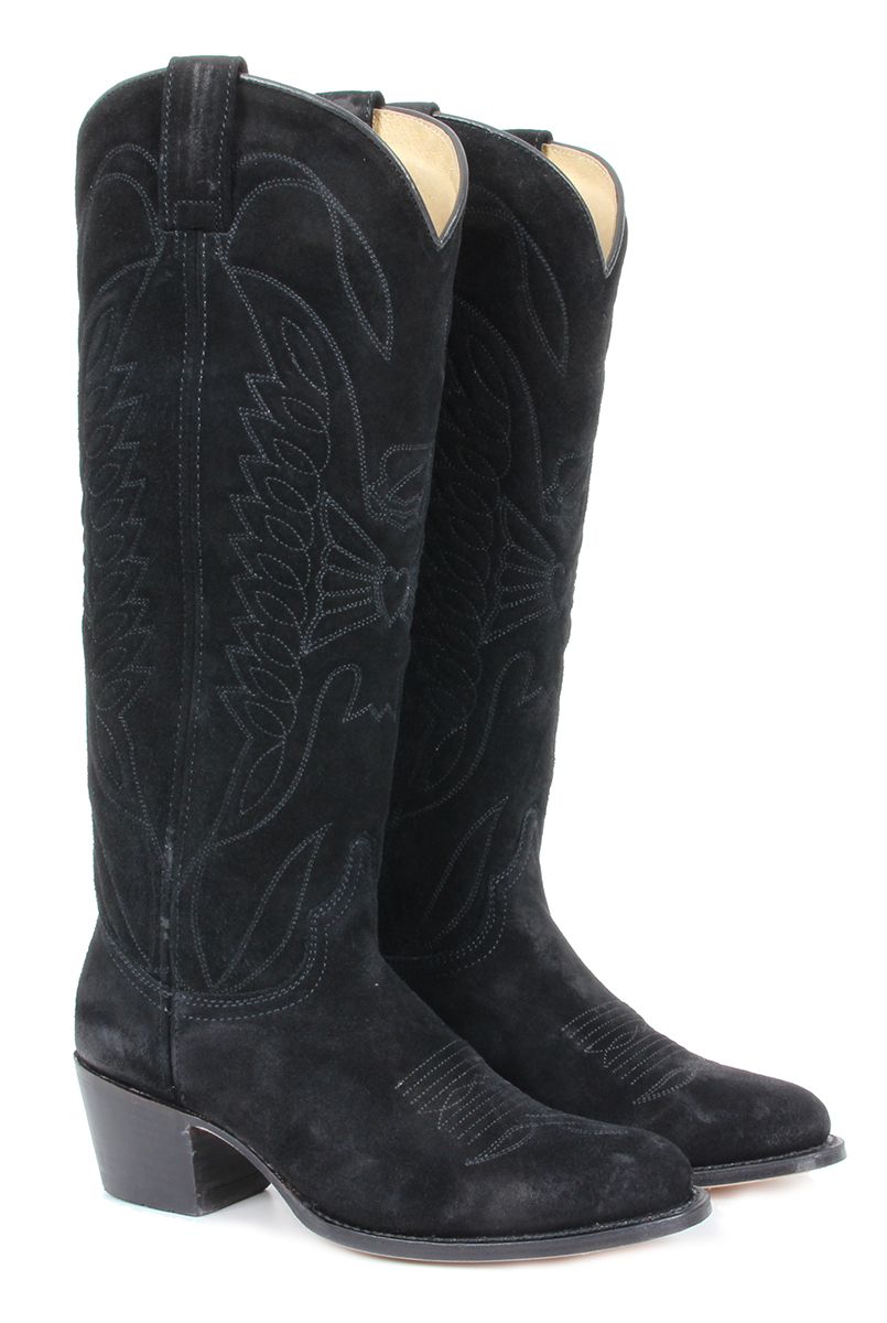 Lange westernlaars van Sendra uitgevoerd in zwart suede met stiksels op de schacht en voorvoet. Ook verkrijgbaar in cognac suede.