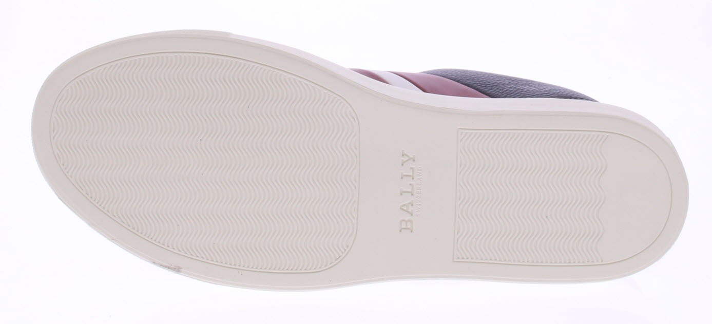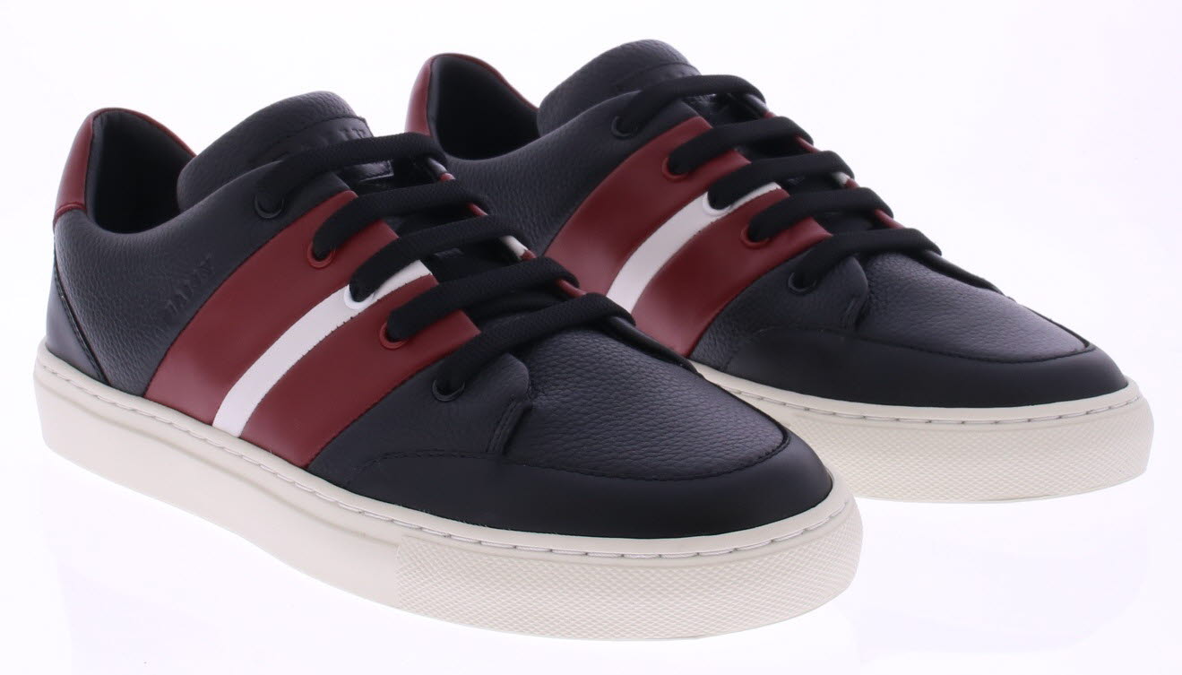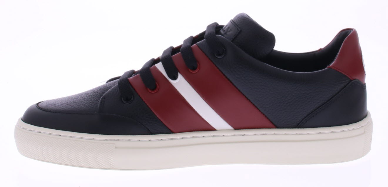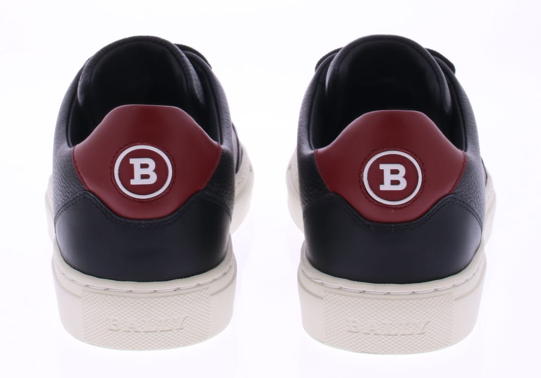 Heren sneaker van Bally uitgevoerd in kalfsleer zwart met bordeaux en wit accenten. De schoen is geheel kalfsleer gevoerd en de zool is van wit rubber.